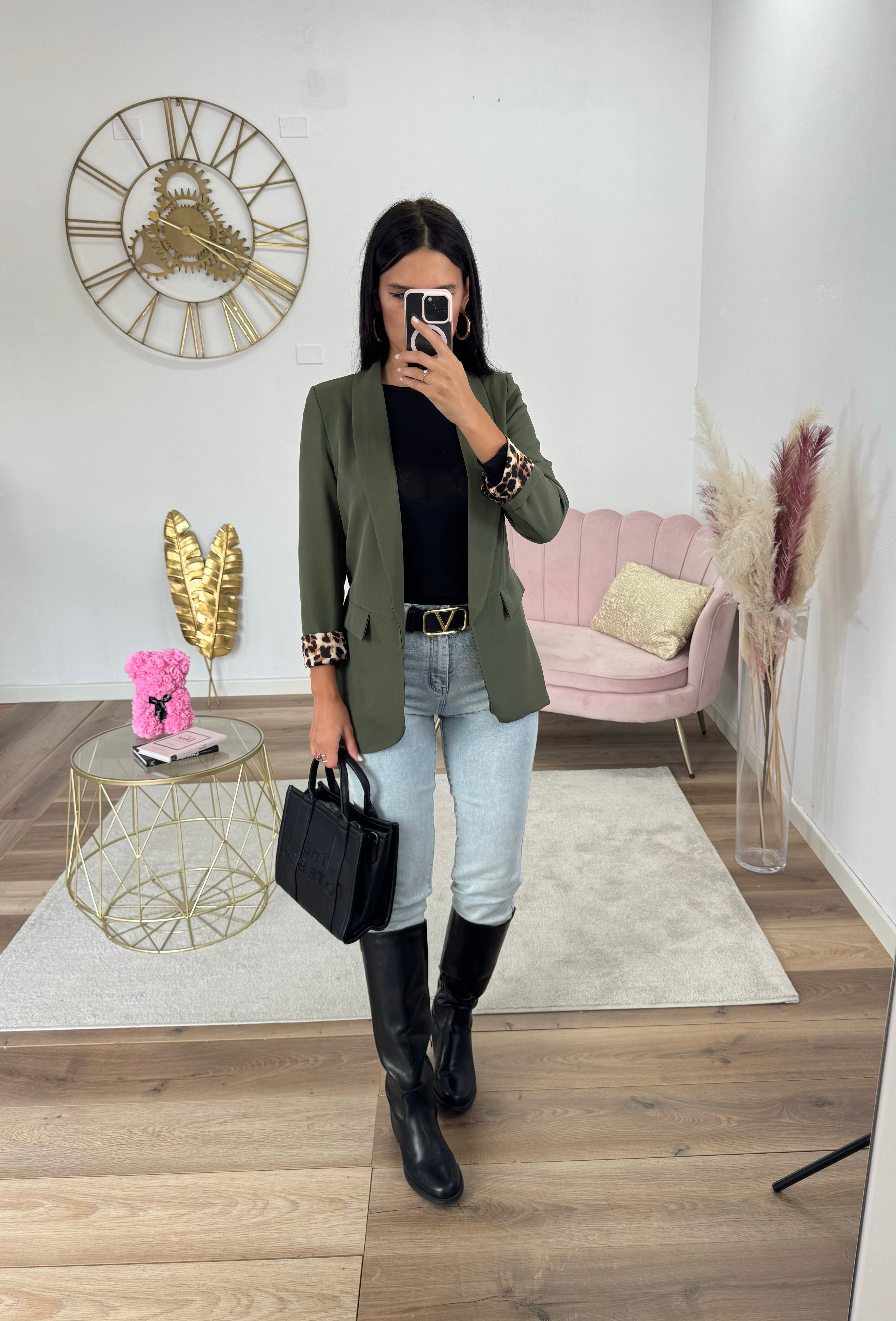 Blazer foderato internamente, finte tasche, spalline imbottite, all'interno presenta la fantasia animalier.