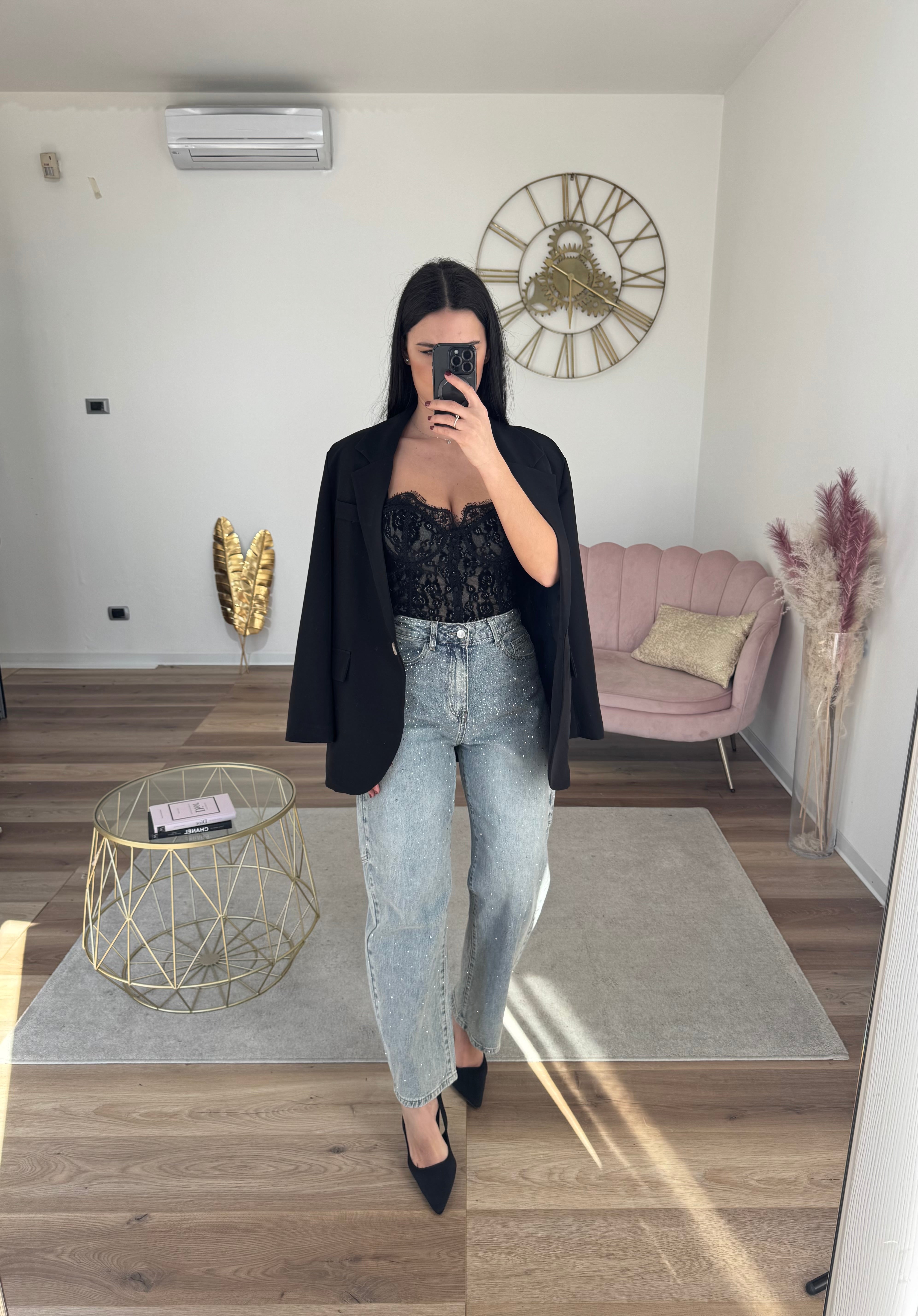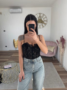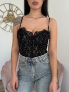 Corpetto in pizzo che si chiude con zip, ha le coppe preformate