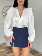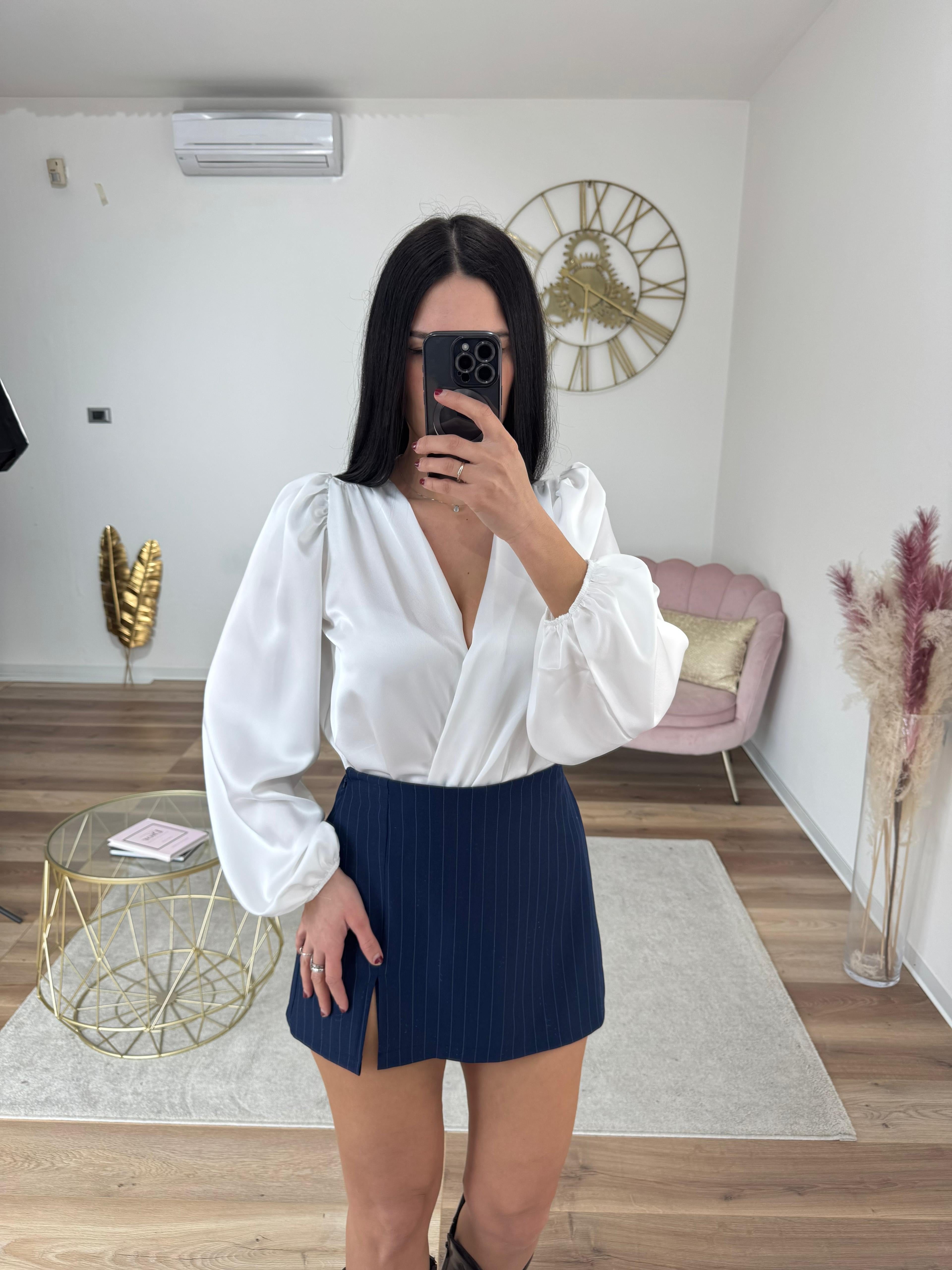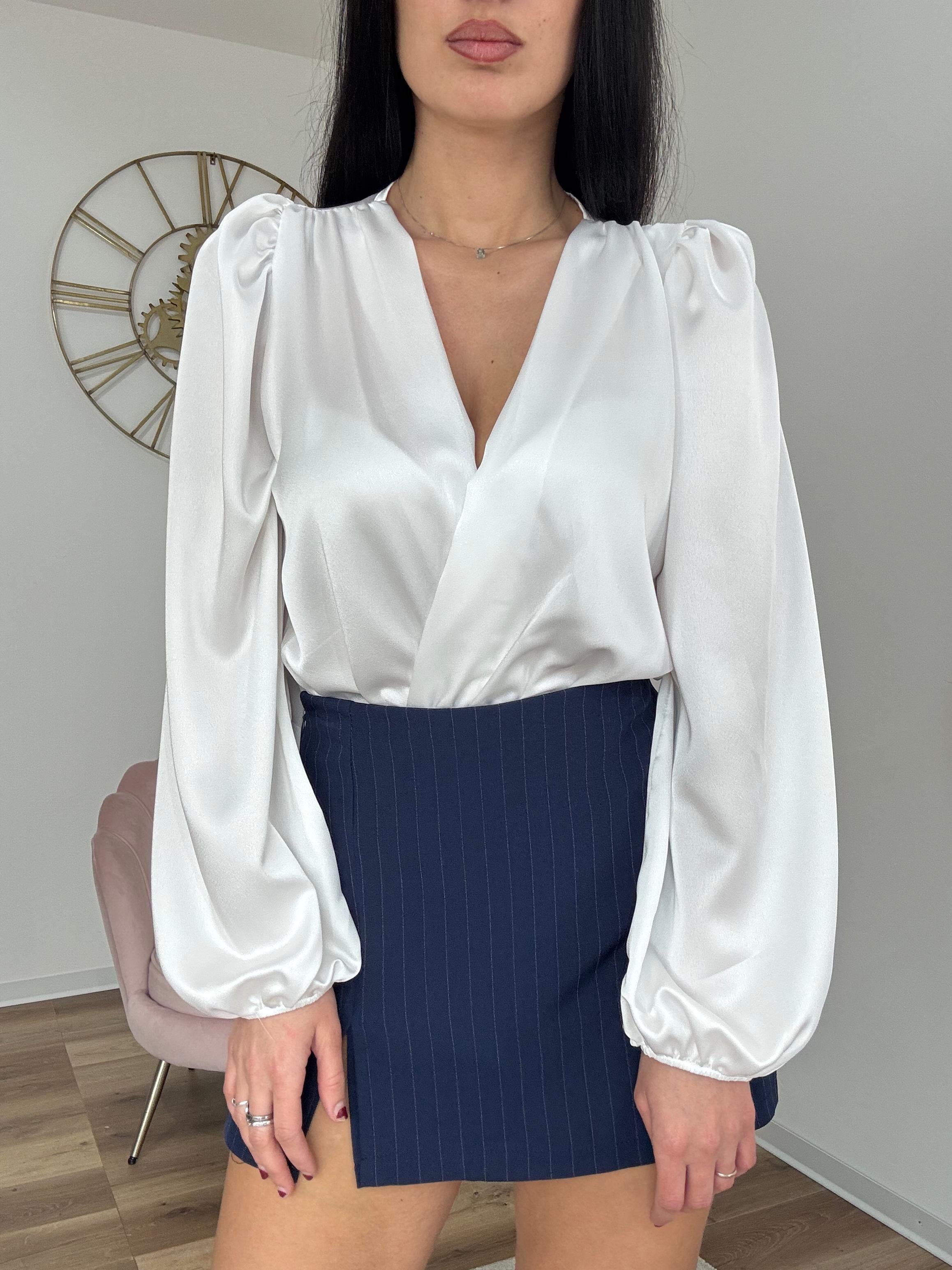 Body con scollo sovrapposto, maniche a sbuffo, vita elastica.