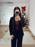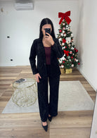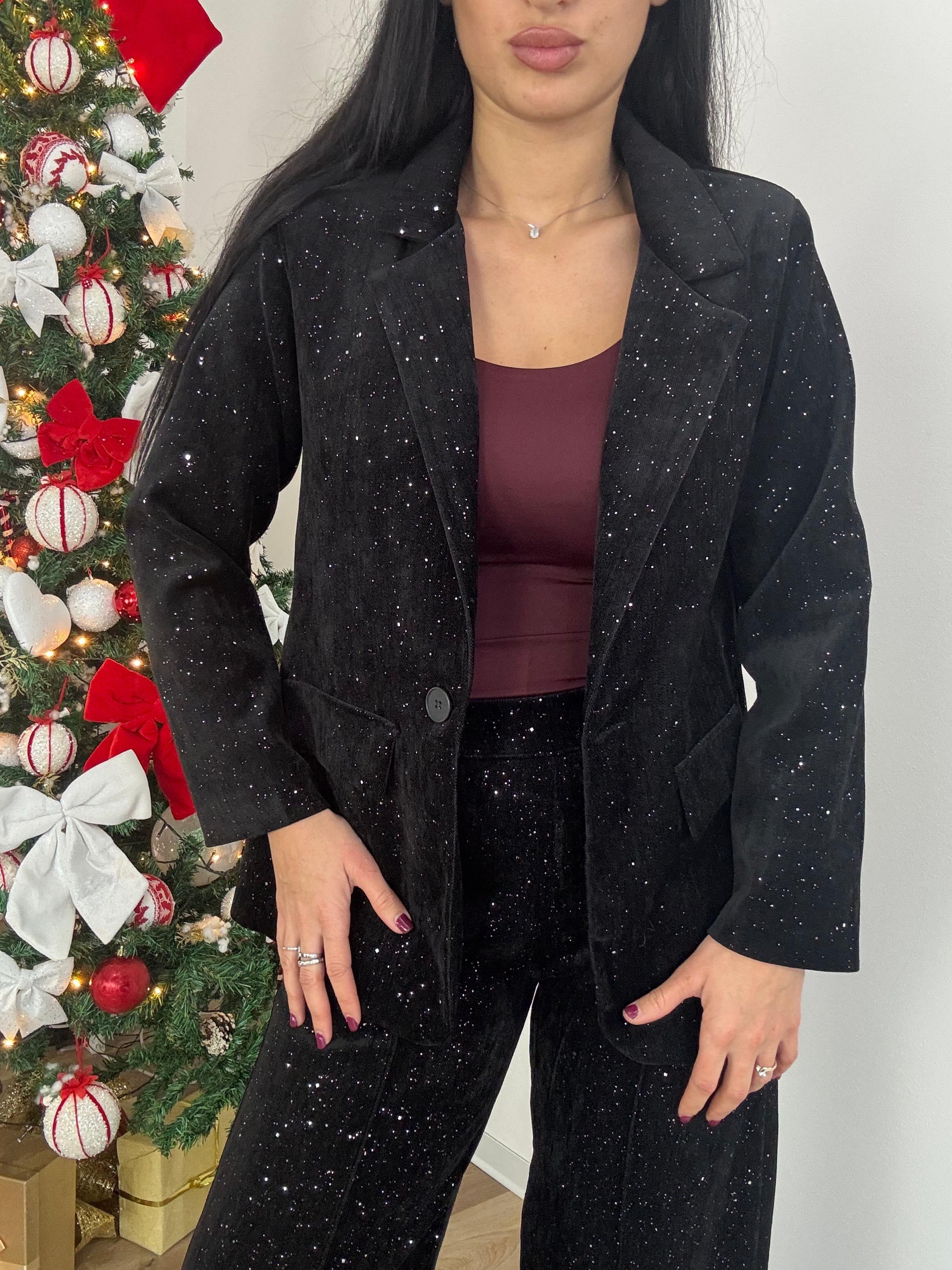 Completo impreziosito da strass composto da pantalone a palazzo con vita elastica e tasche, giacca foderata internamente con spalline imbottite e chiusura con bottoncino