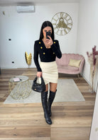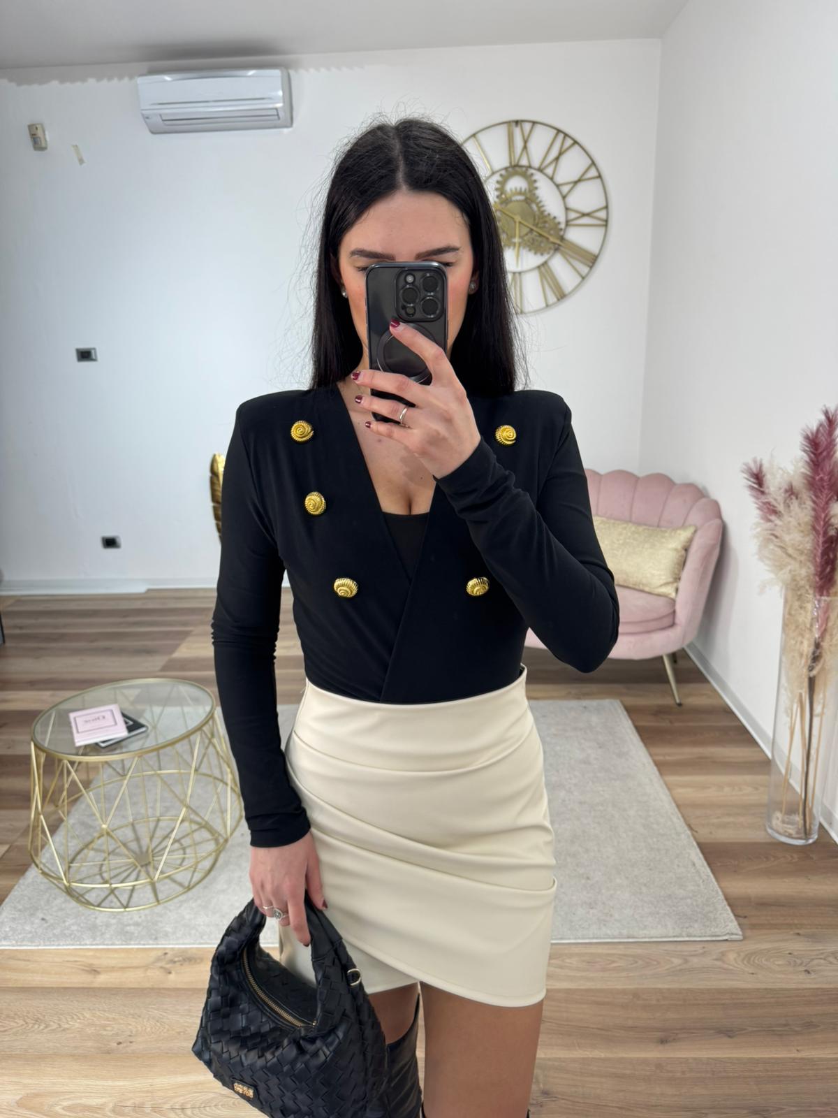 Gonna in ecopelle, vita alta, leggermente elasticizzata, chiusura sul retro con zip