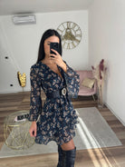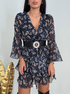 Abito in chiffon, manica ampia nel fondo, Fantasia con filo dorato all’interno, Scende morbido lungo il fianco, scollo sovrapposto, Completo del suo cinturino in tessuto, vita elastica.