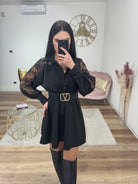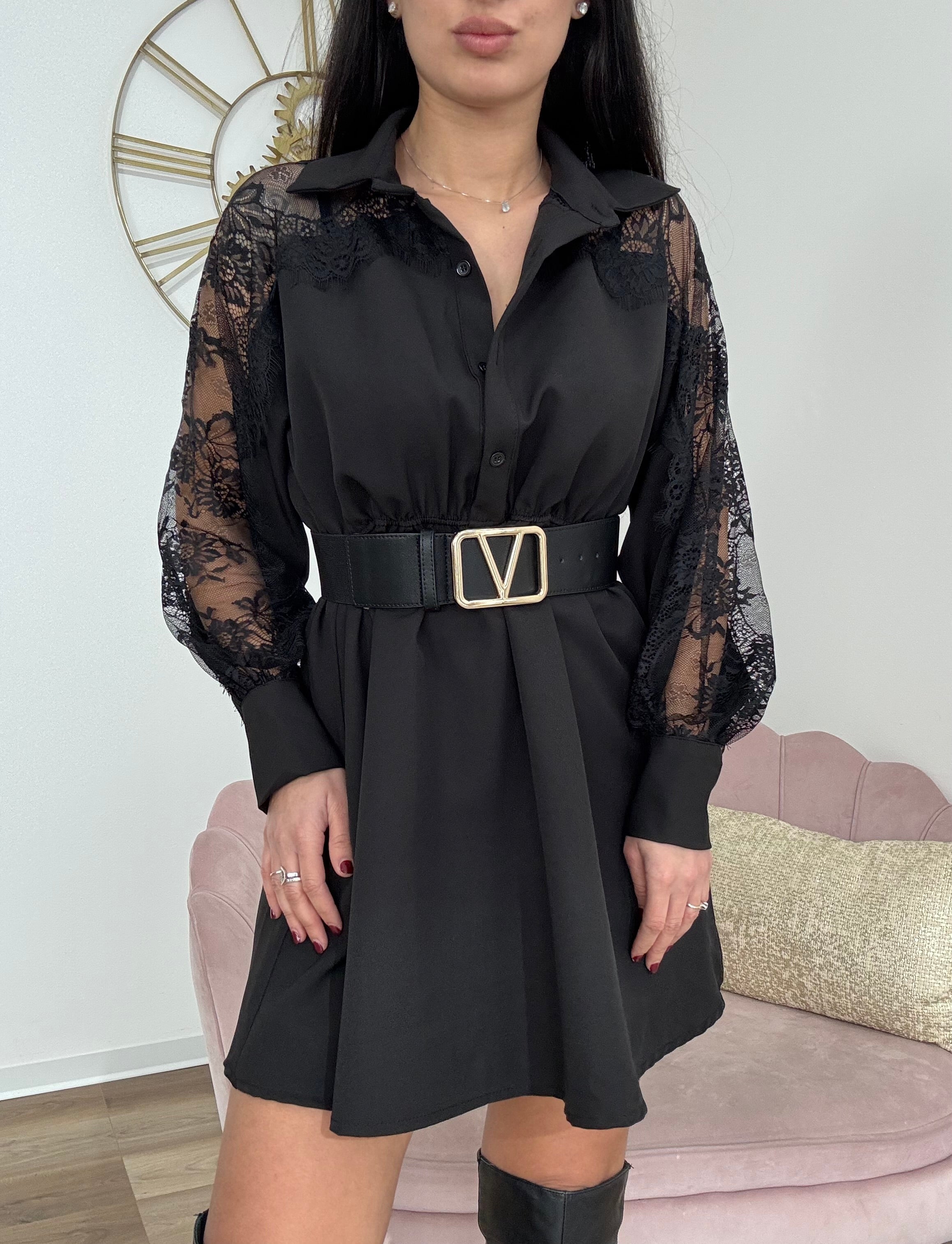 Abito con maniche in pizzo, bottoncini regolabili sul davanti, colletto a camicia, vita elastica