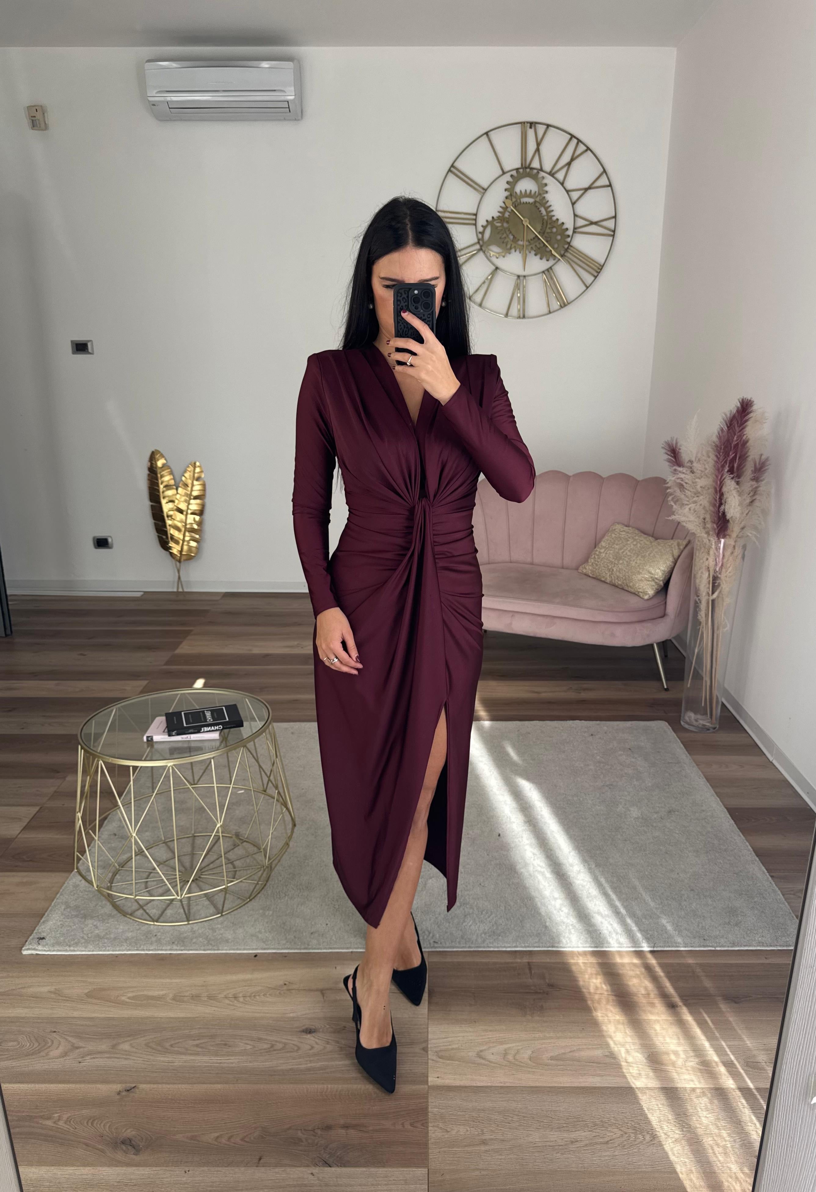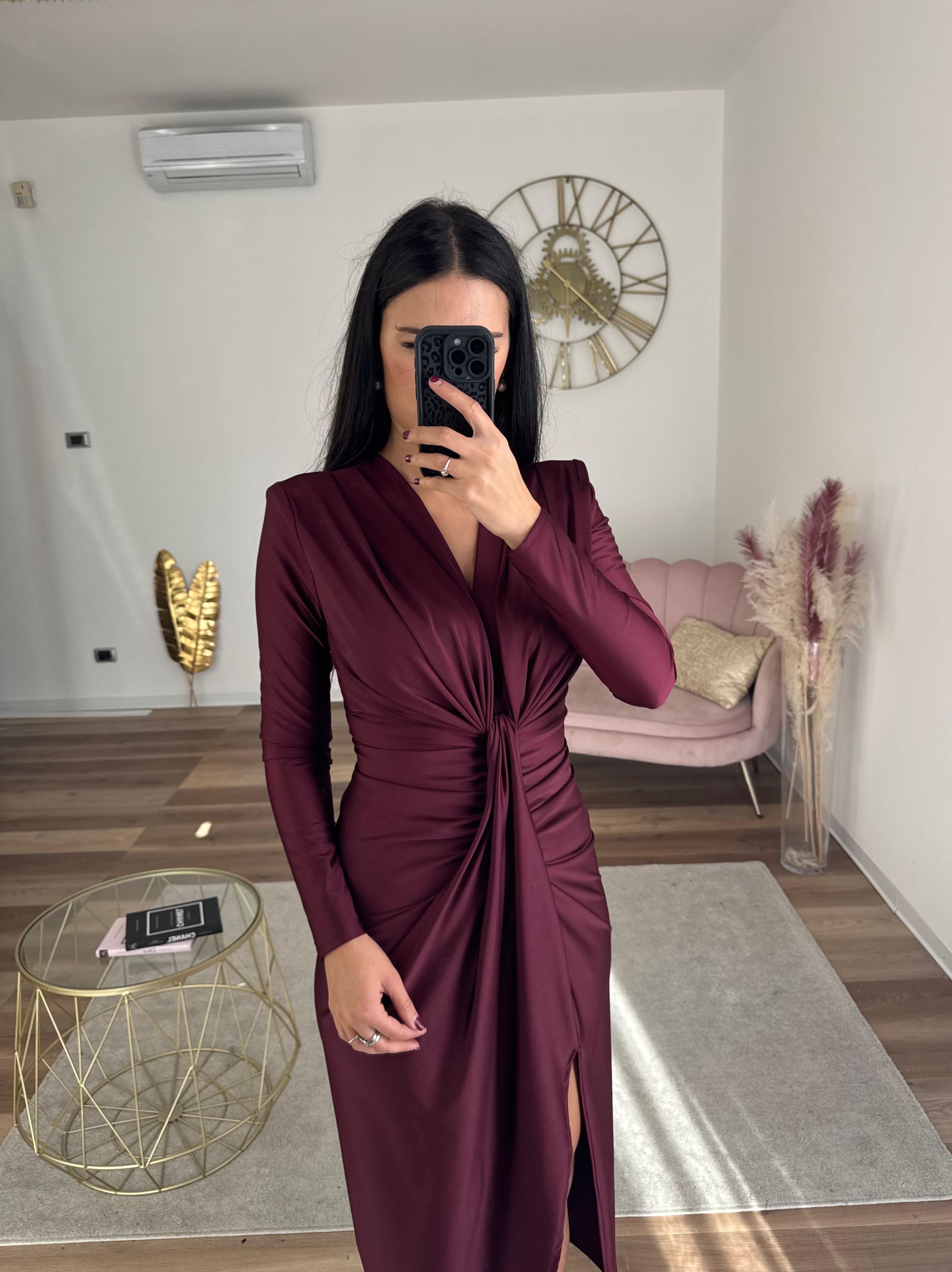 Abito aderente ma elasticizzato, scollo profondo regolabile, spalline imbottite, spacco laterale, vita elastica.
