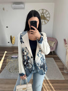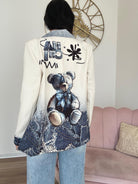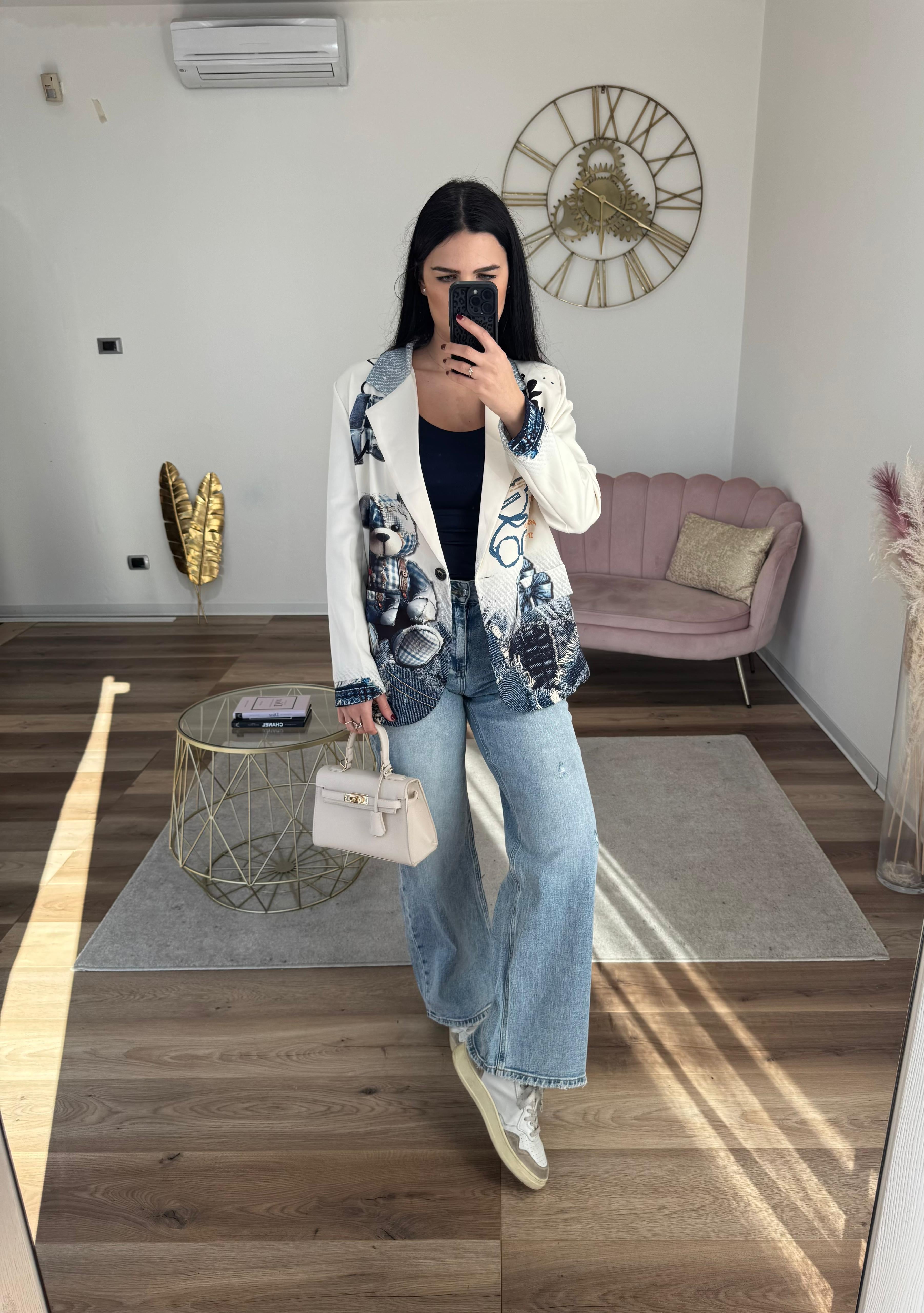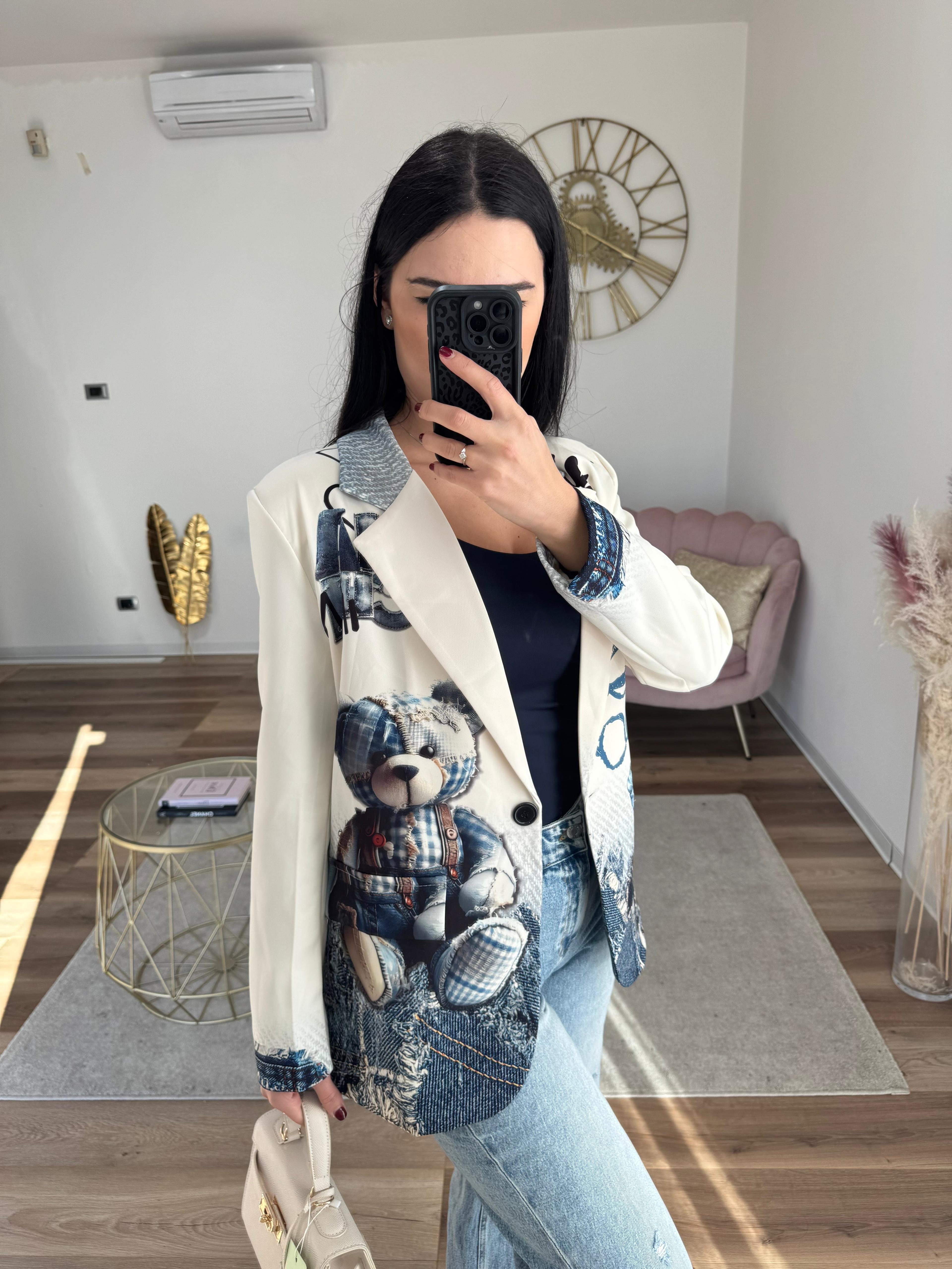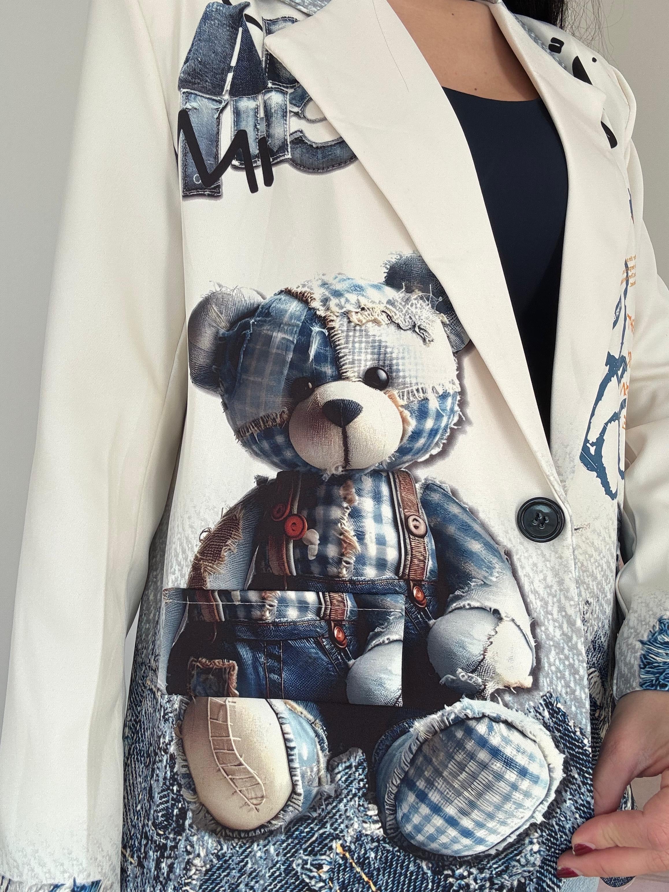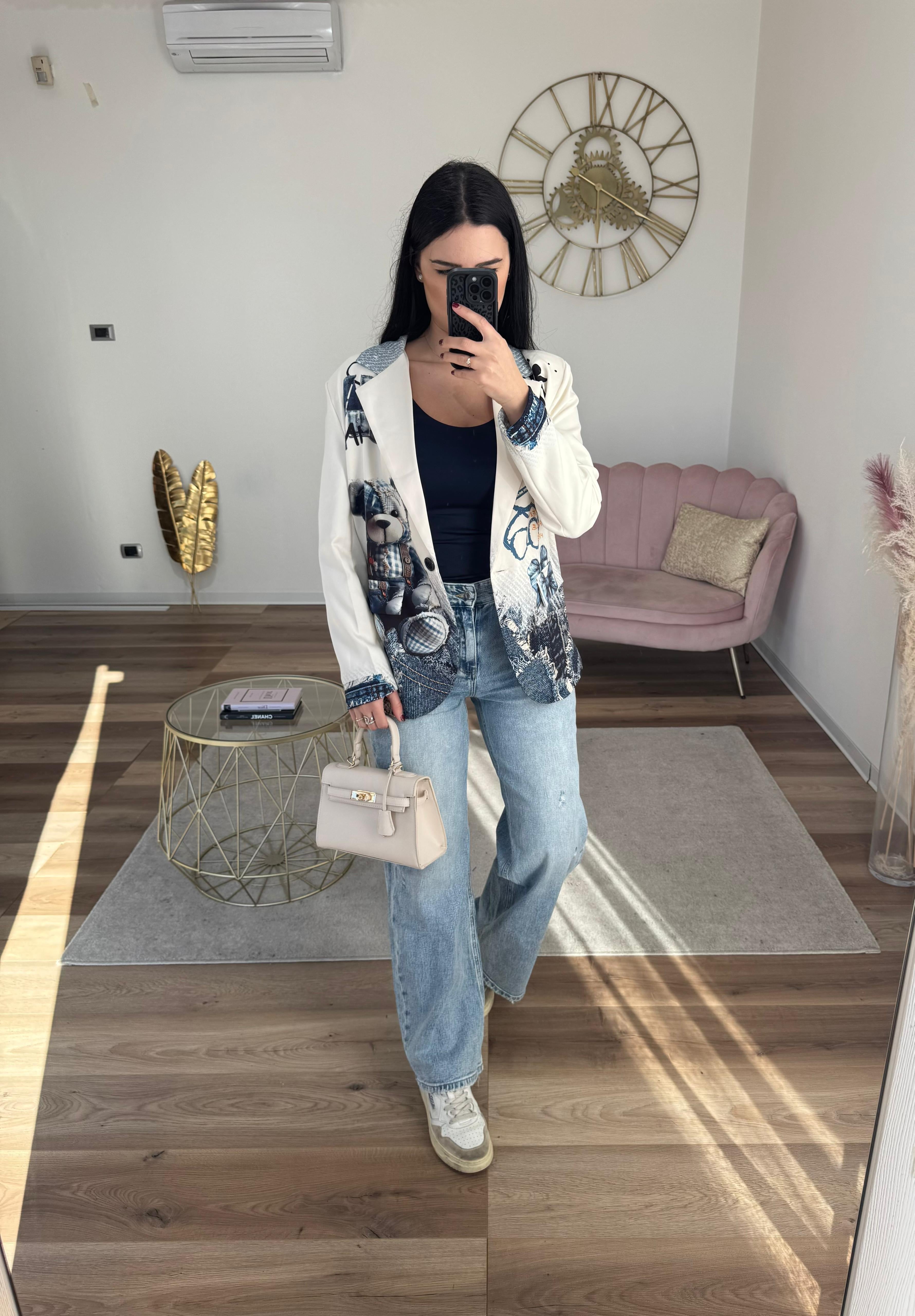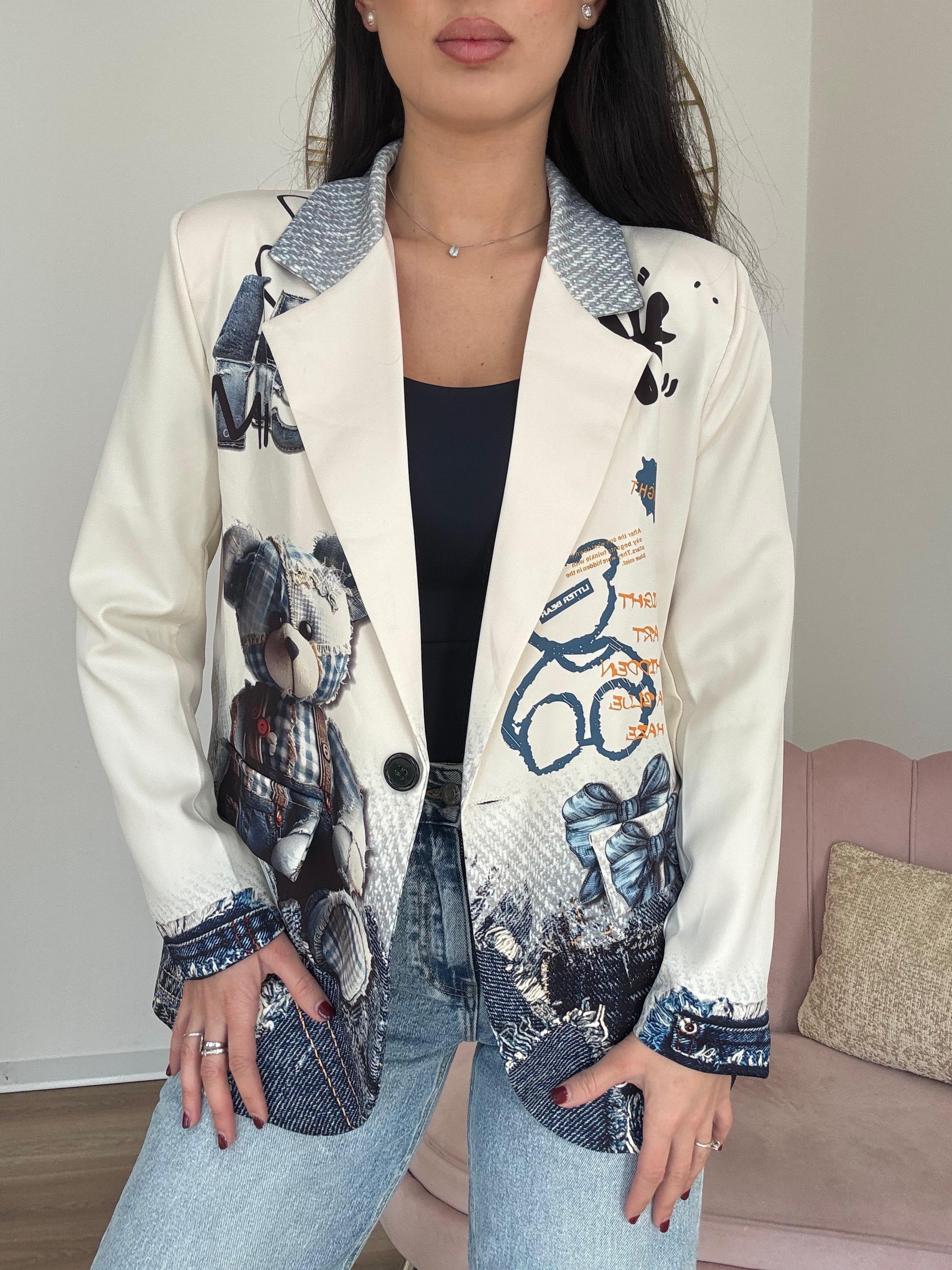 Blazer over grafica Snoopy, foderato internamente,spalline imbottite e finte taschine, chiusura con bottoncino.