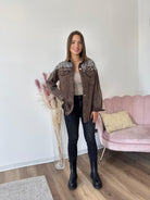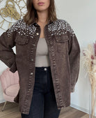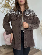 Camicione in denim ricoperto di strass, chiusura con bottoncini.