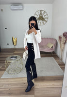 Pantalone impreziosito da bottoni dorati, tessuto elasticizzato, si chiude nel retro con zip