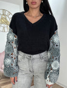 Pull con maniche traforate e rose ricamate, scollo a V, lunghezza normale, morbido e caldo, elasticizzato