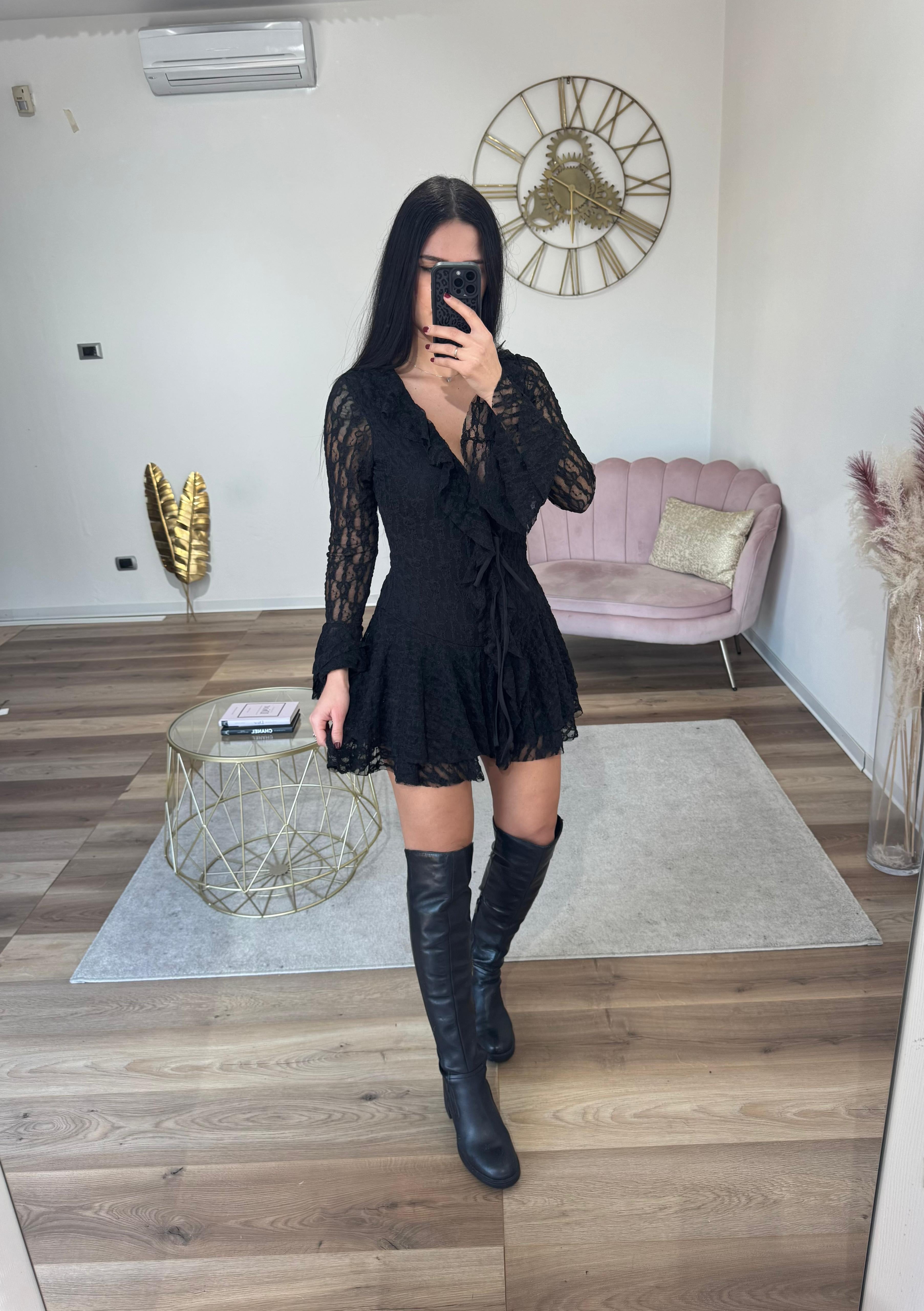 Abito in satin con pizzo nel fondo, modello effetto rimbordato, si lega al collo con fusciacca, spalline imbottite, scende morbido lungo i fianchi, vita elastica