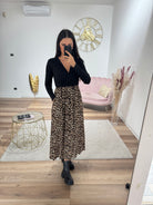 Abito lungo con fantasia animalier, la parte superiore è elasticizzata, vita elastica e gonna morbida lungo i fianchi.