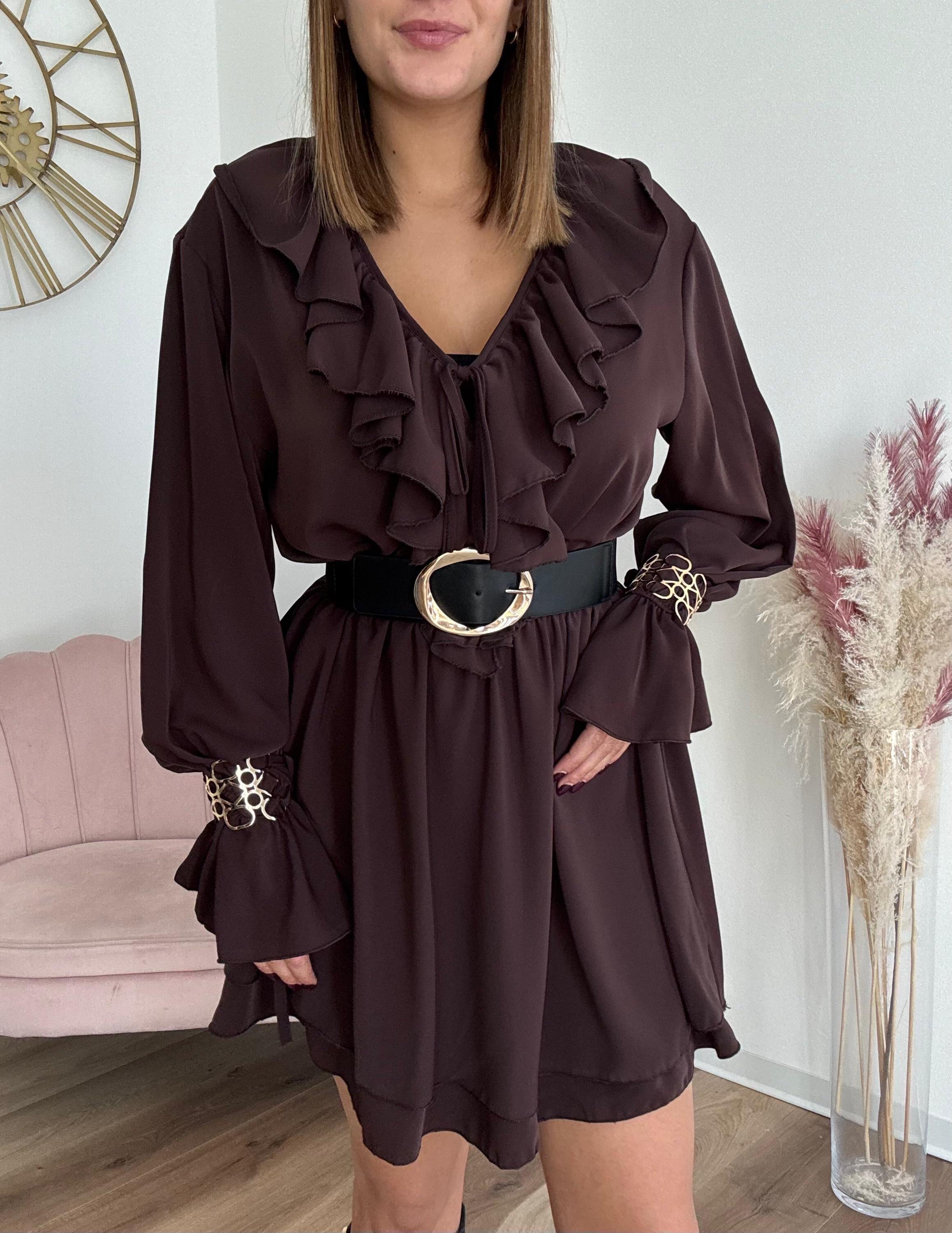 Abito corto con bracciali dorati removibili, lacceto sullo scollo, maniche a sbuffo, vita elastica