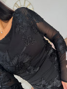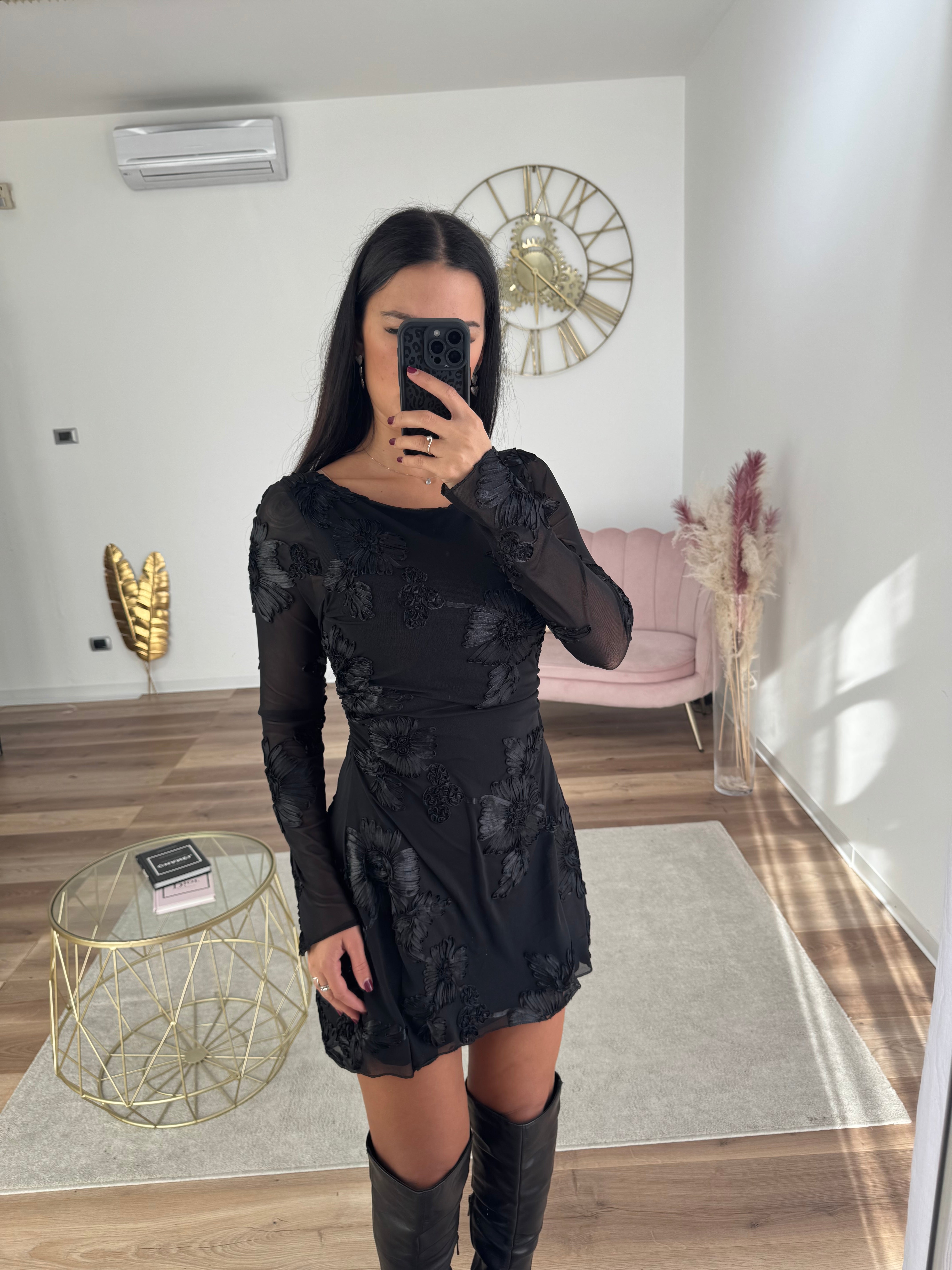 Abito che scende leggermente svasato, in doppio tessuto con fantasia floreale in rilievo, le coppe non sono preformate, ha la sottoveste, tessuto elasticizzato