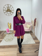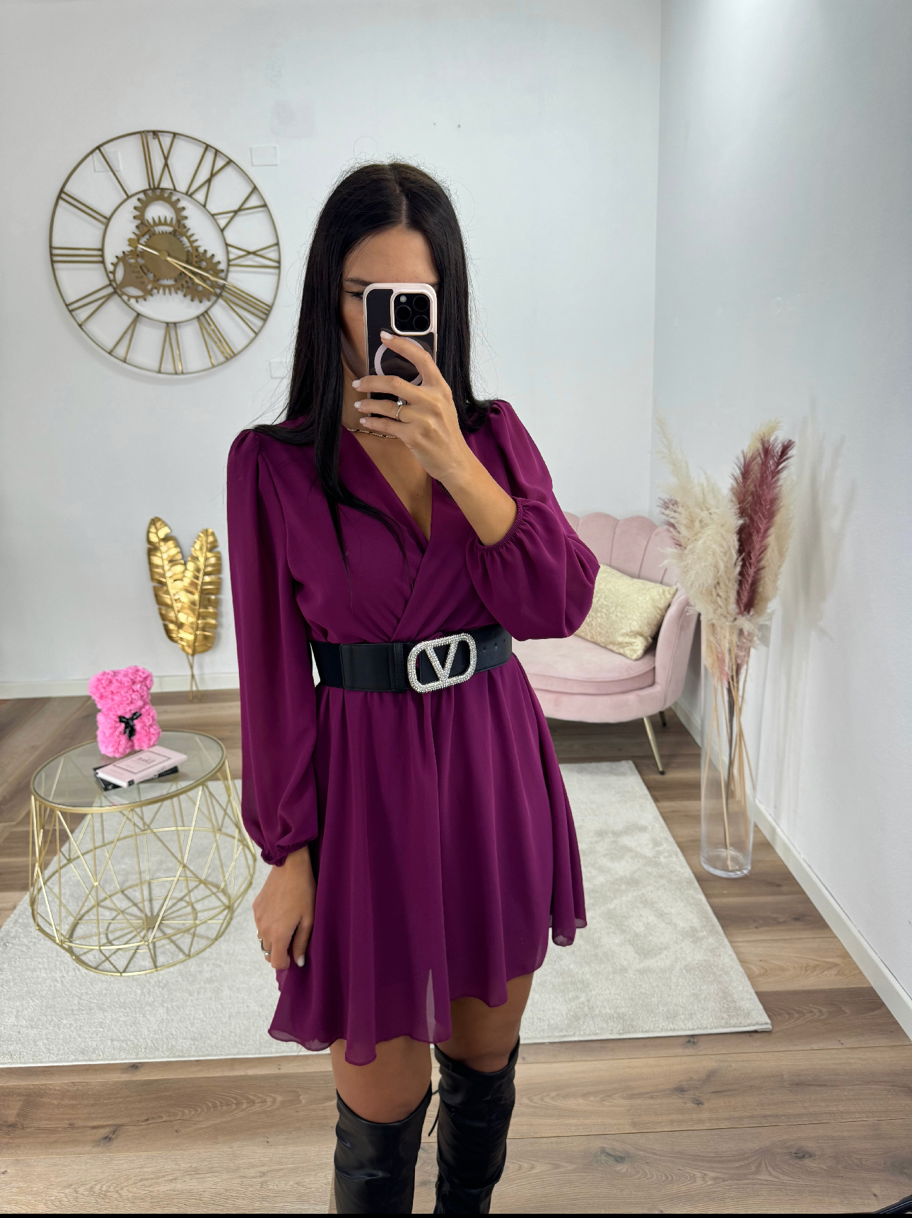 Abito morbido lungo i fianchi, scollo sovrapposto, maniche leggermente velate, completo del proprio cinturino e vita elastica.