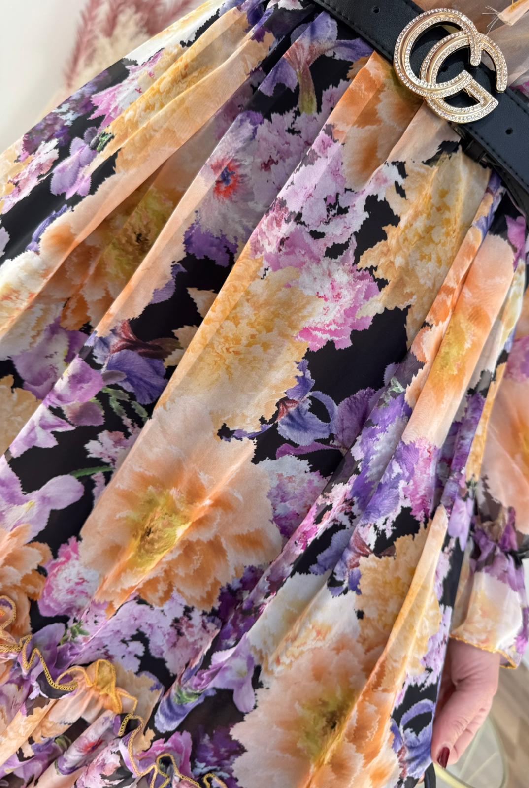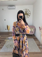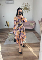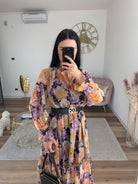 Abito midi fantasia floreale, in chiffon, laccetto sul davanti, completo di sottoveste non cucita, vita elastica.