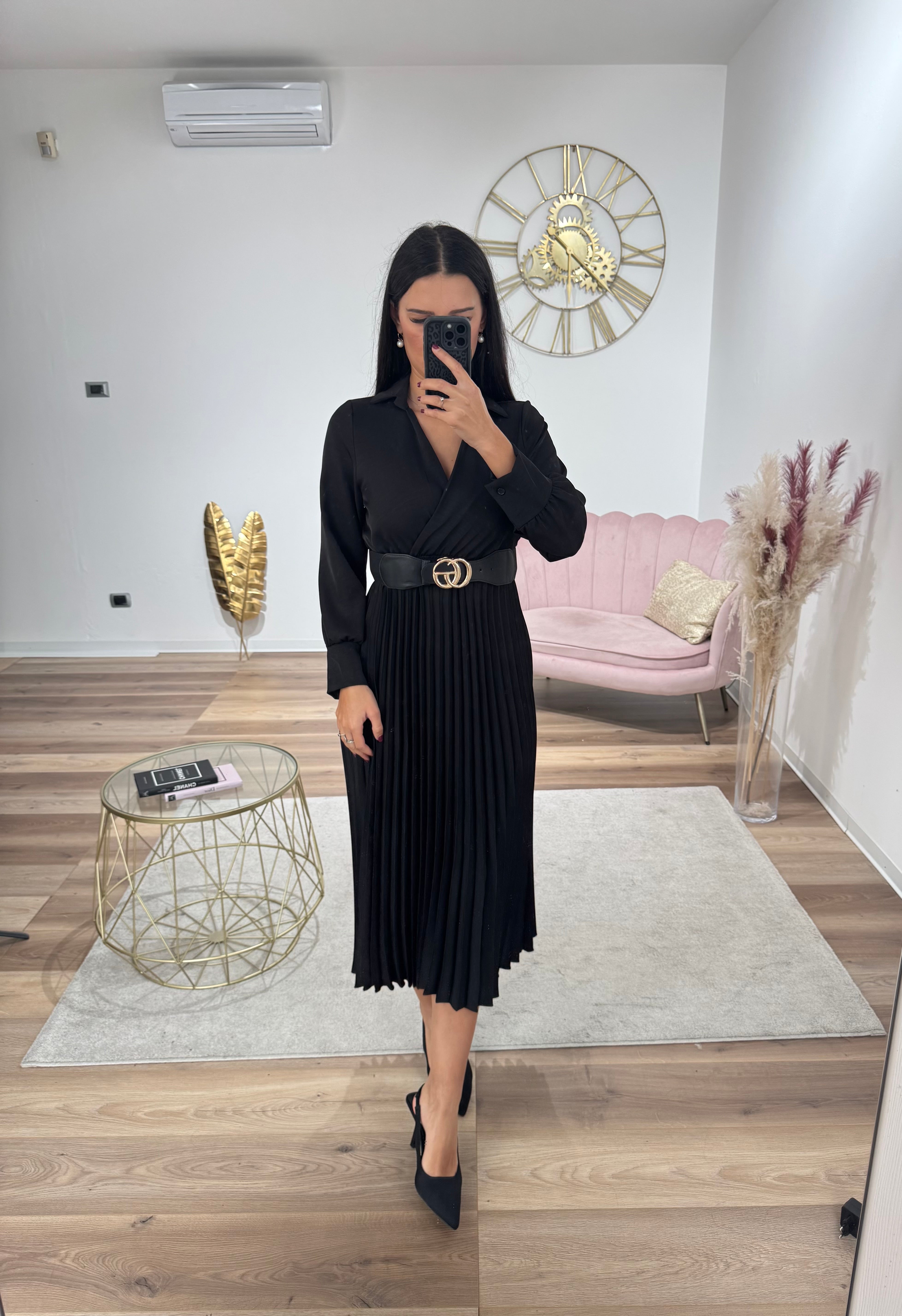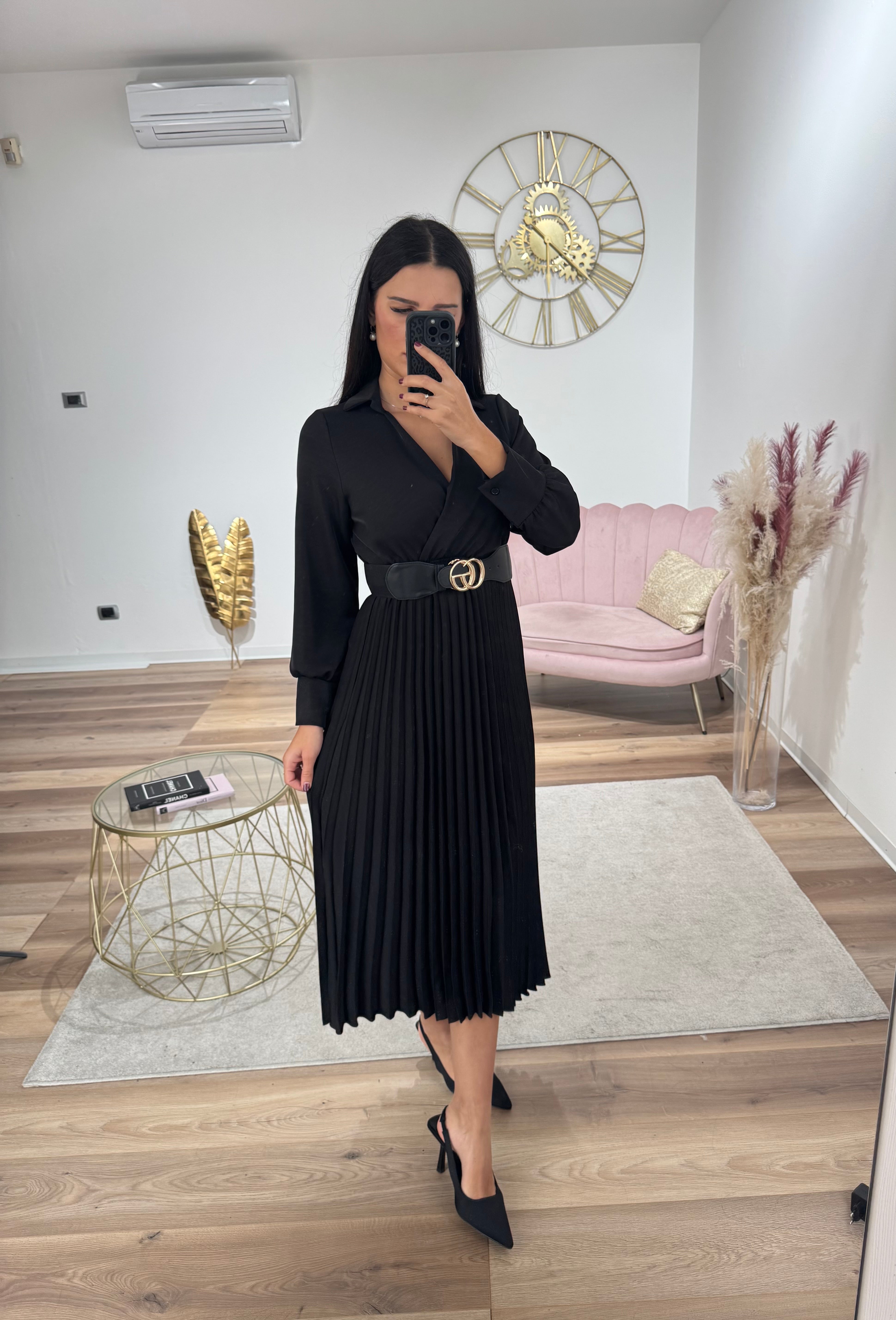 Abito modello midi, gonna plissetata, scollo sovrapposto, colletto a camicia, completo di cinturone (non quello della foto), vita elastica