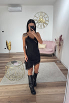 Abito in satin con pizzo, modello trapezio, bretelle regolabili, aperto lateralmente,