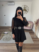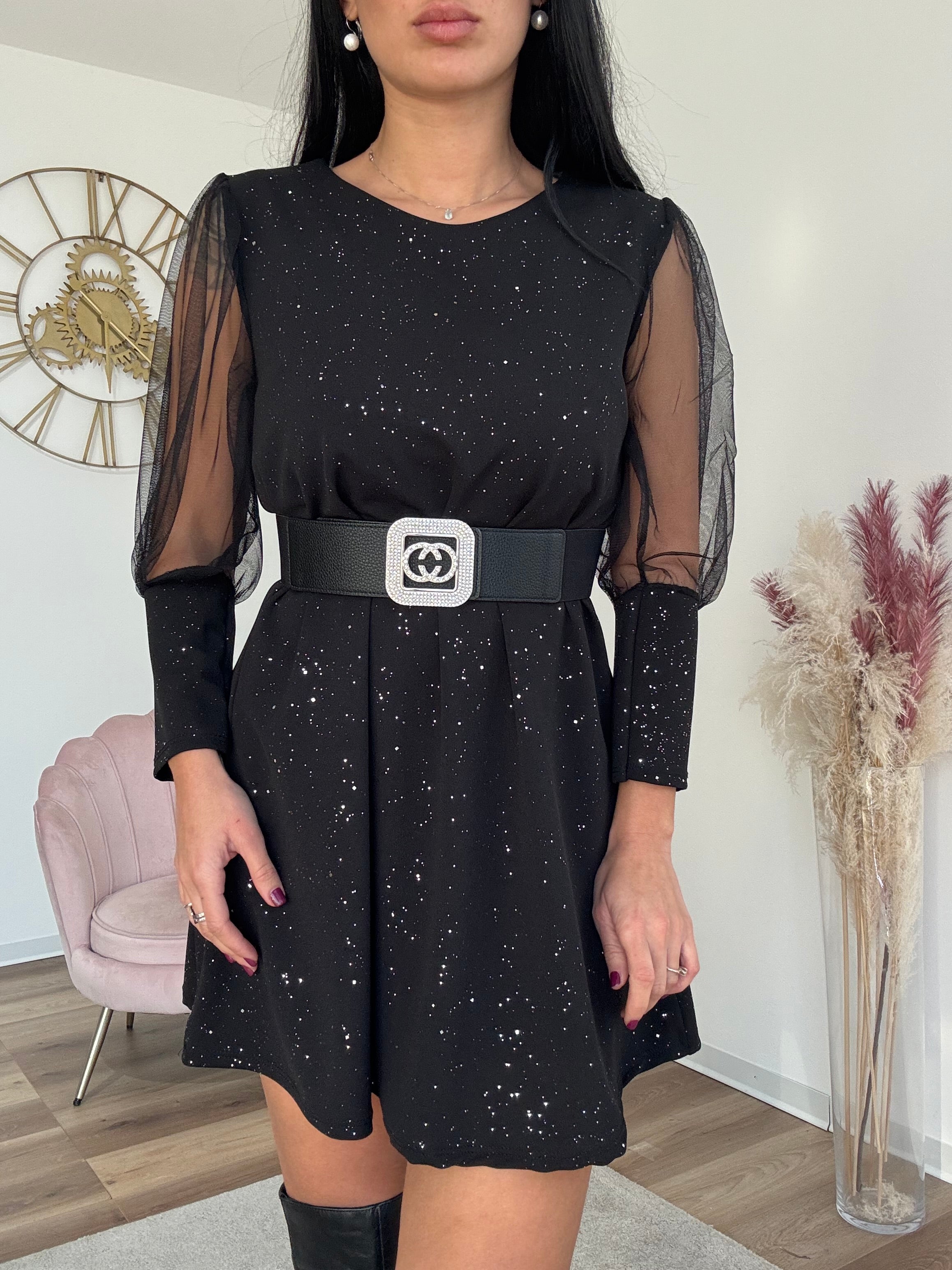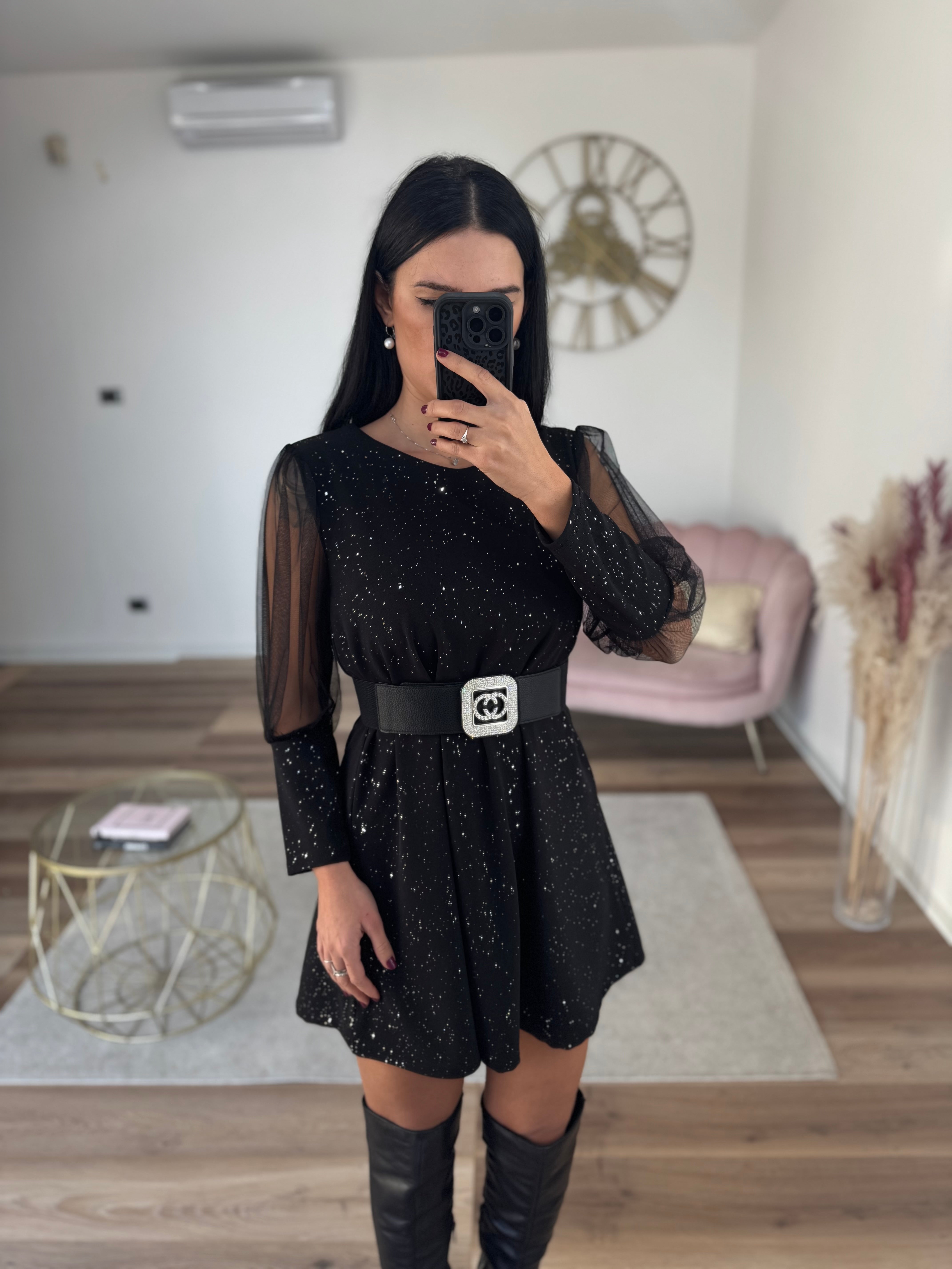 Abito con maniche velate a palloncino, morbido lungo i fianchi, modello svasato