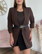 Blazer lungo completo della propria cintura, foderato internamente, spalline imbottite, maniche arricciate.