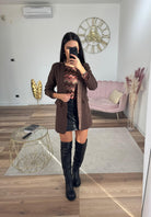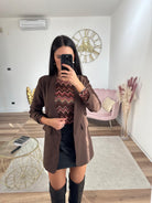 Blazer lungo completo della propria cintura, foderato internamente, spalline imbottite, maniche arricciate.