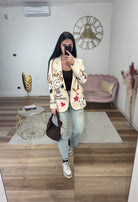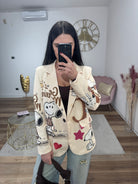 Blazer over grafica Snoopy, foderato internamente,spalline imbottite e finte taschine, chiusura con bottoncino.