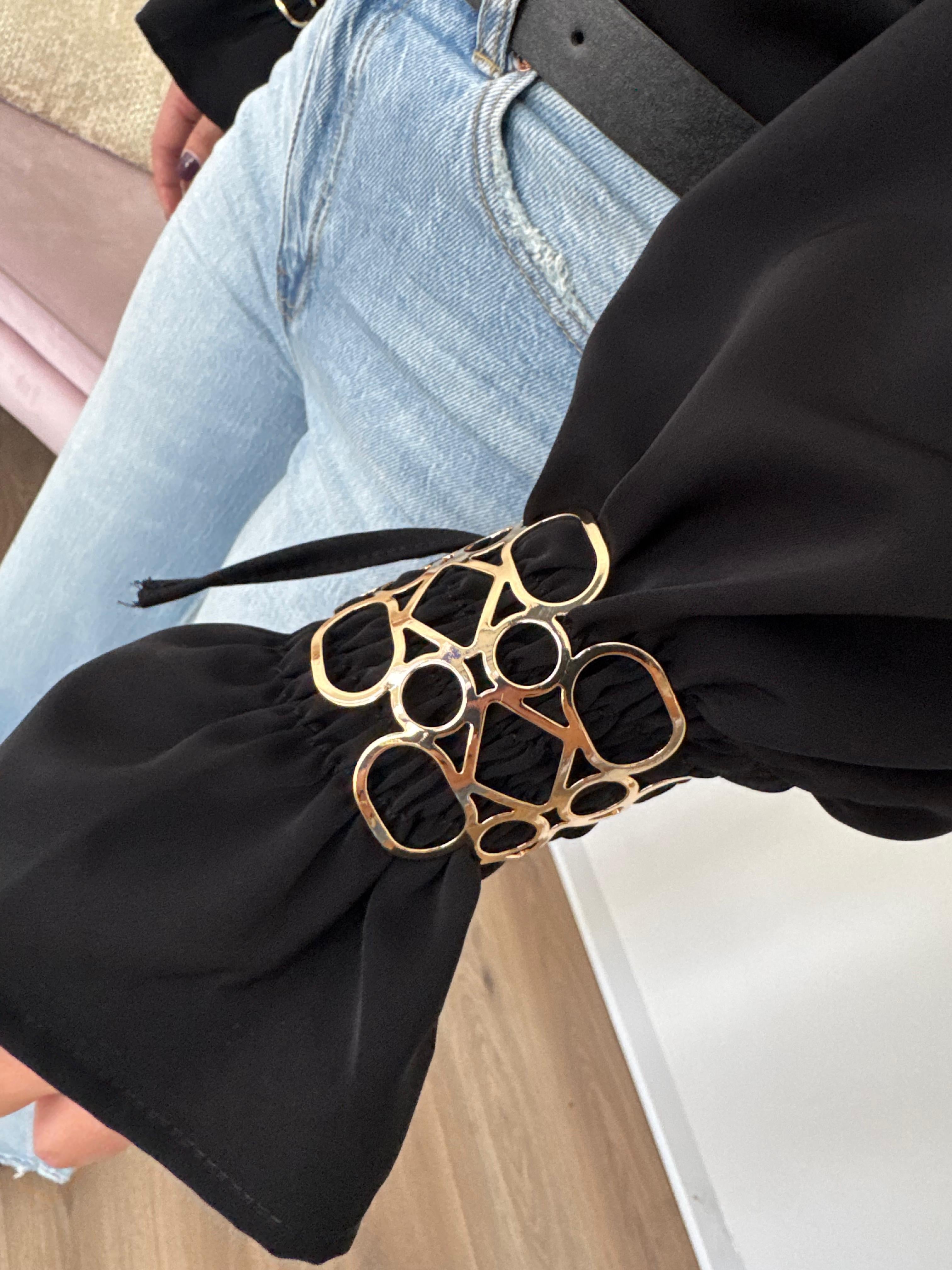Camicia lunghezza normale con maniche arriciate ed elasticizzate sul fondo, scendono ampie e Impreziosita da bracciali dorati removibili