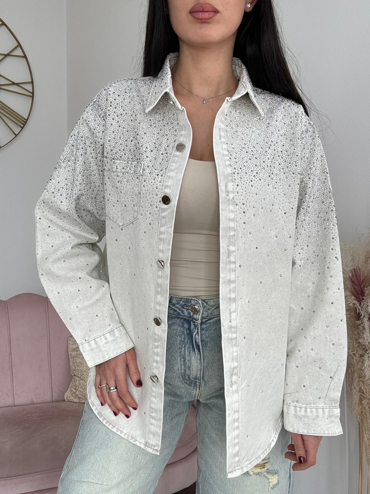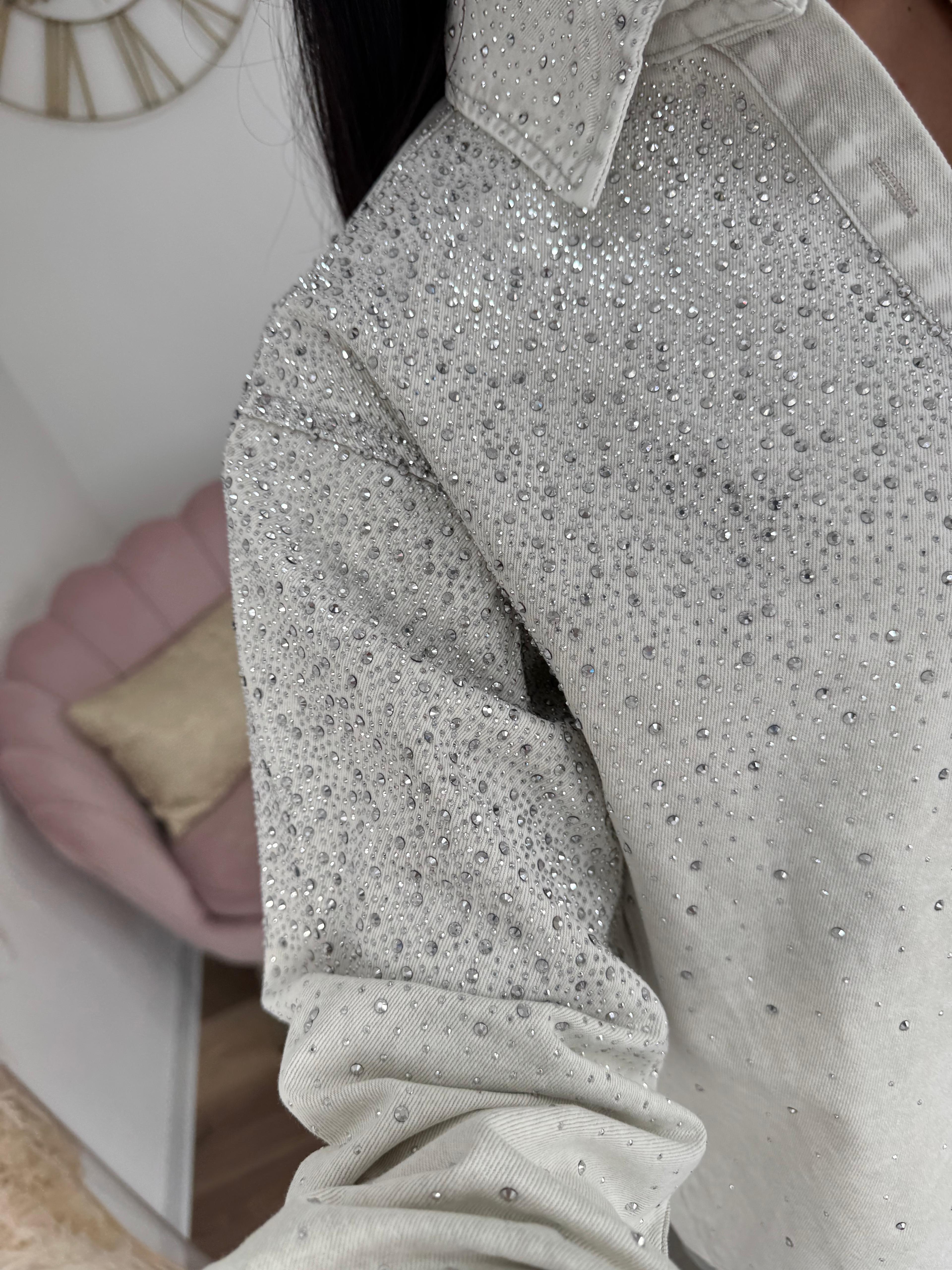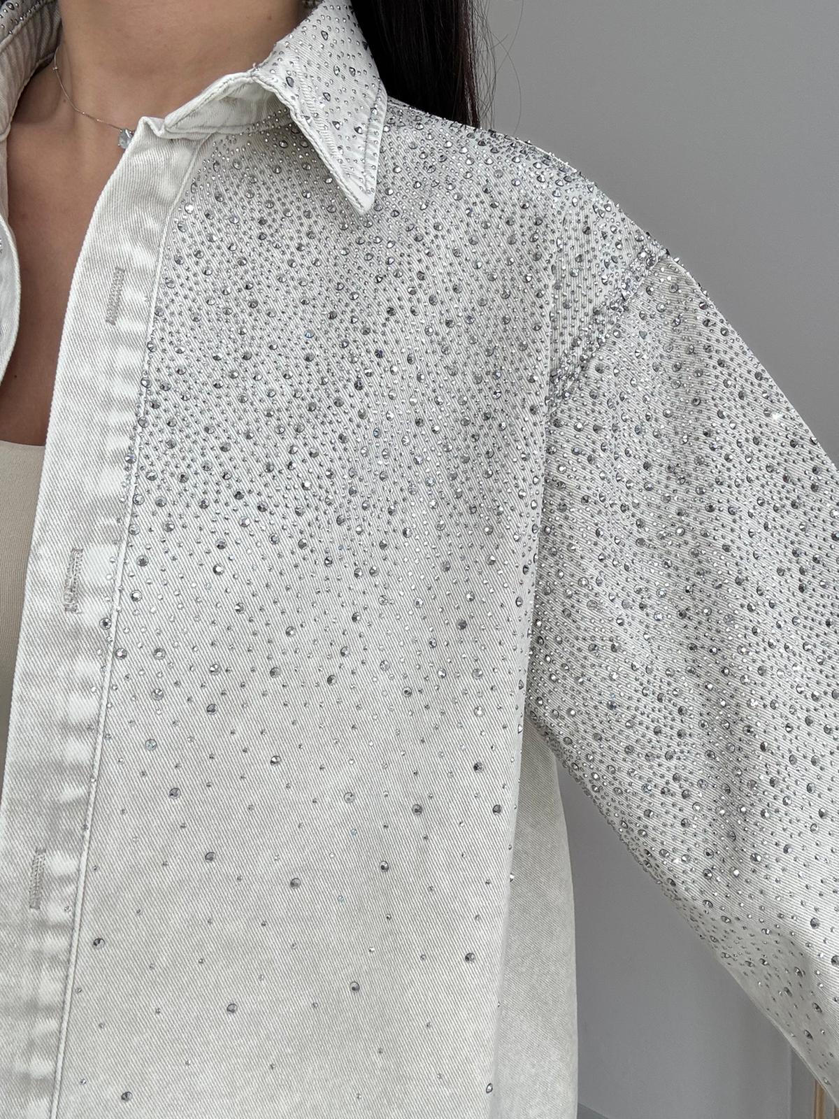 Camicione modello over in denim ricoperto di strass, chiusura con bottoncini