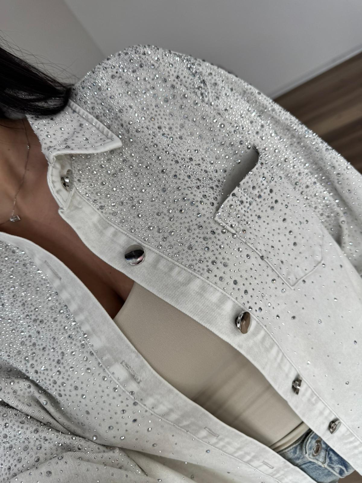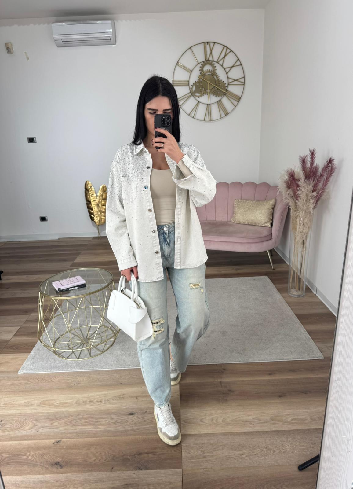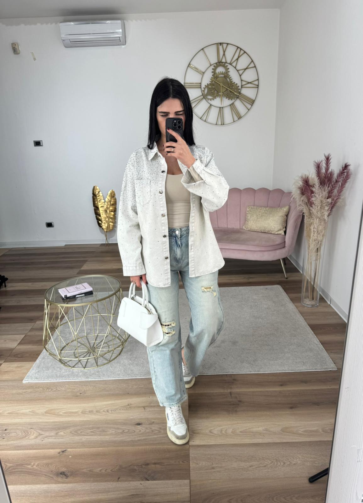 Camicione modello over in denim ricoperto di strass, chiusura con bottoncini