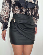Gonna in ecopelle morbidissima, drappeggio laterale, modello a vita alta, chiusura con zip