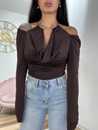Maglia con scollo profondo, spalle scoperte, sul collo ha una collana rigida dorata