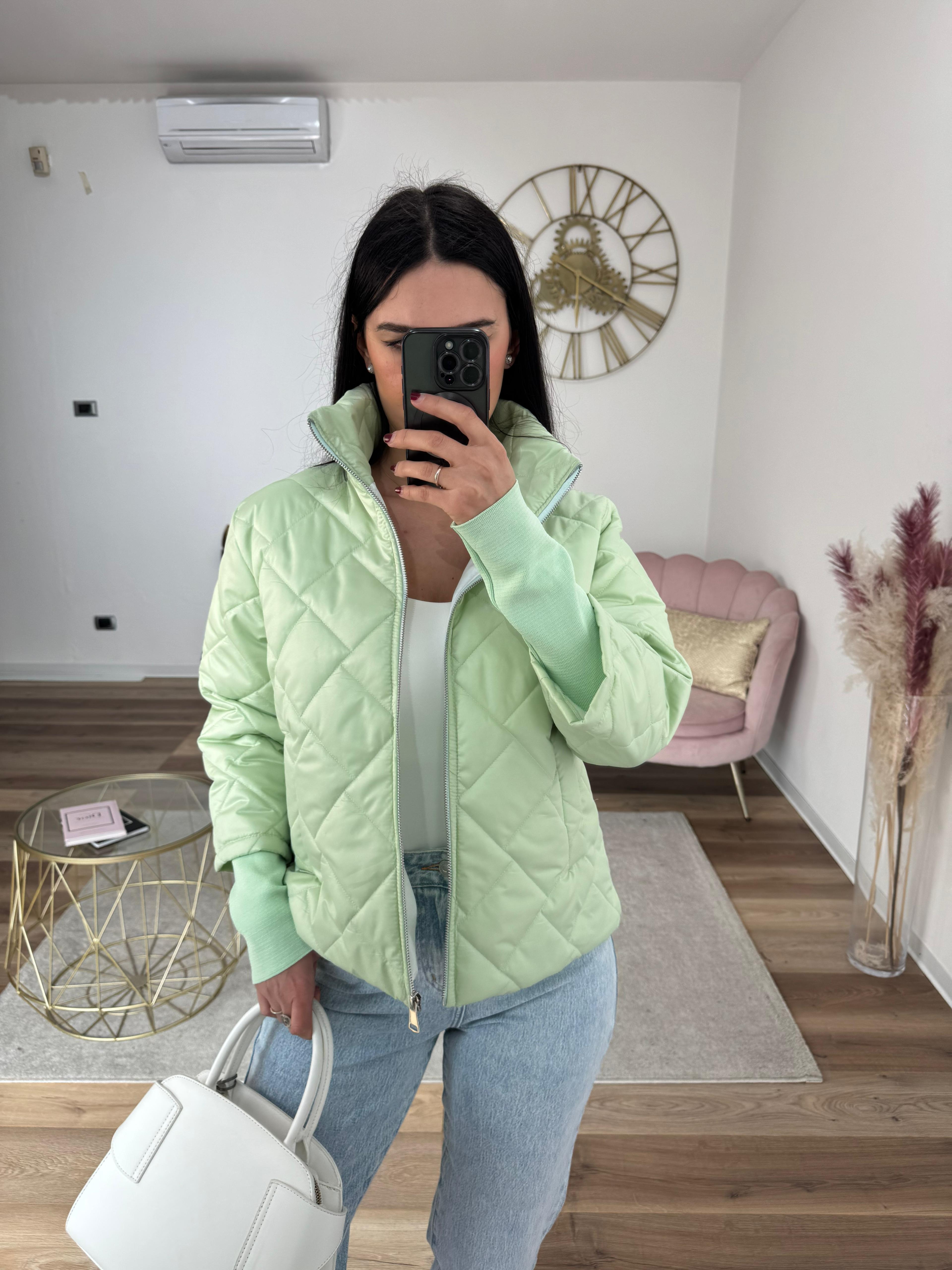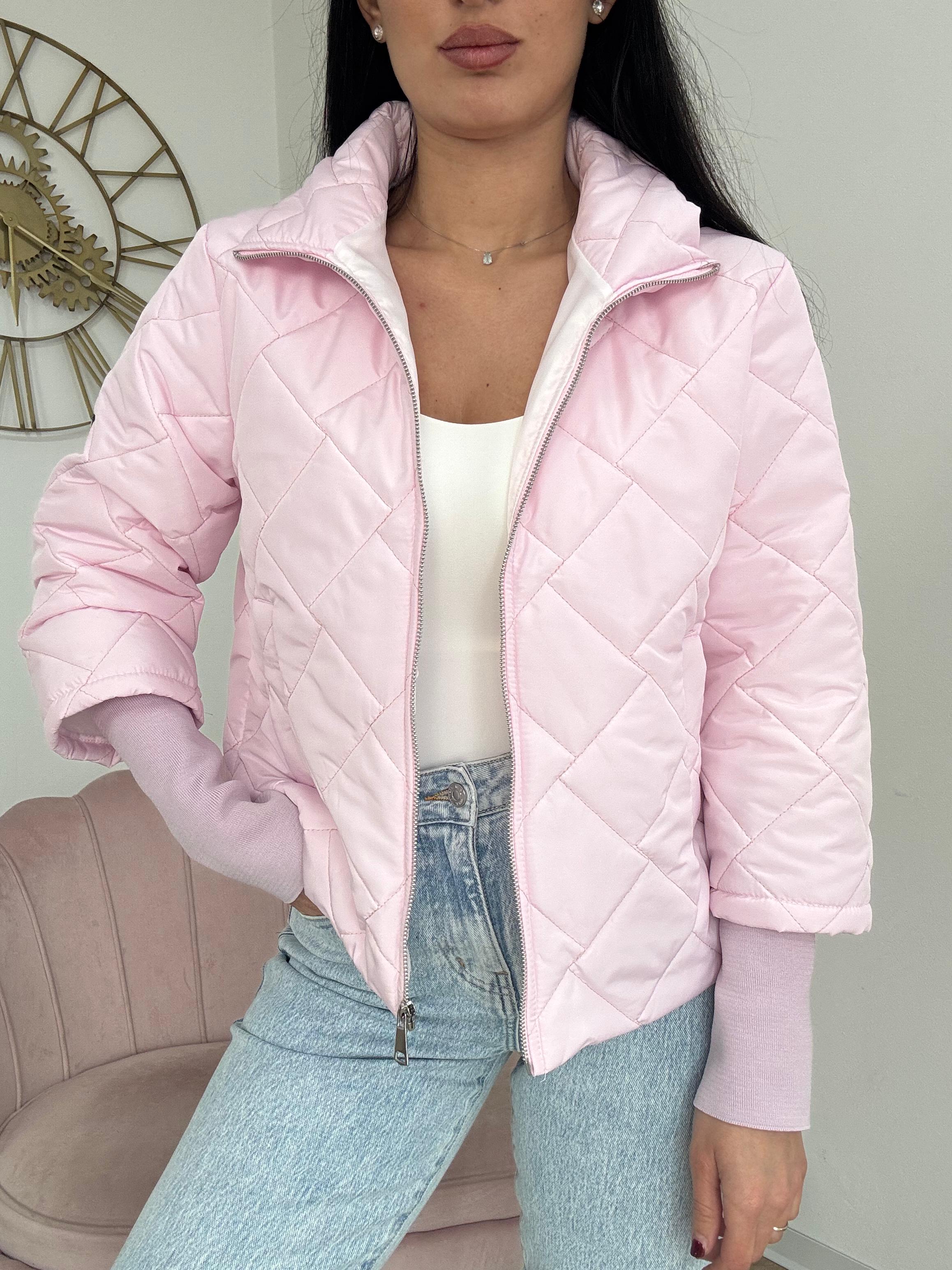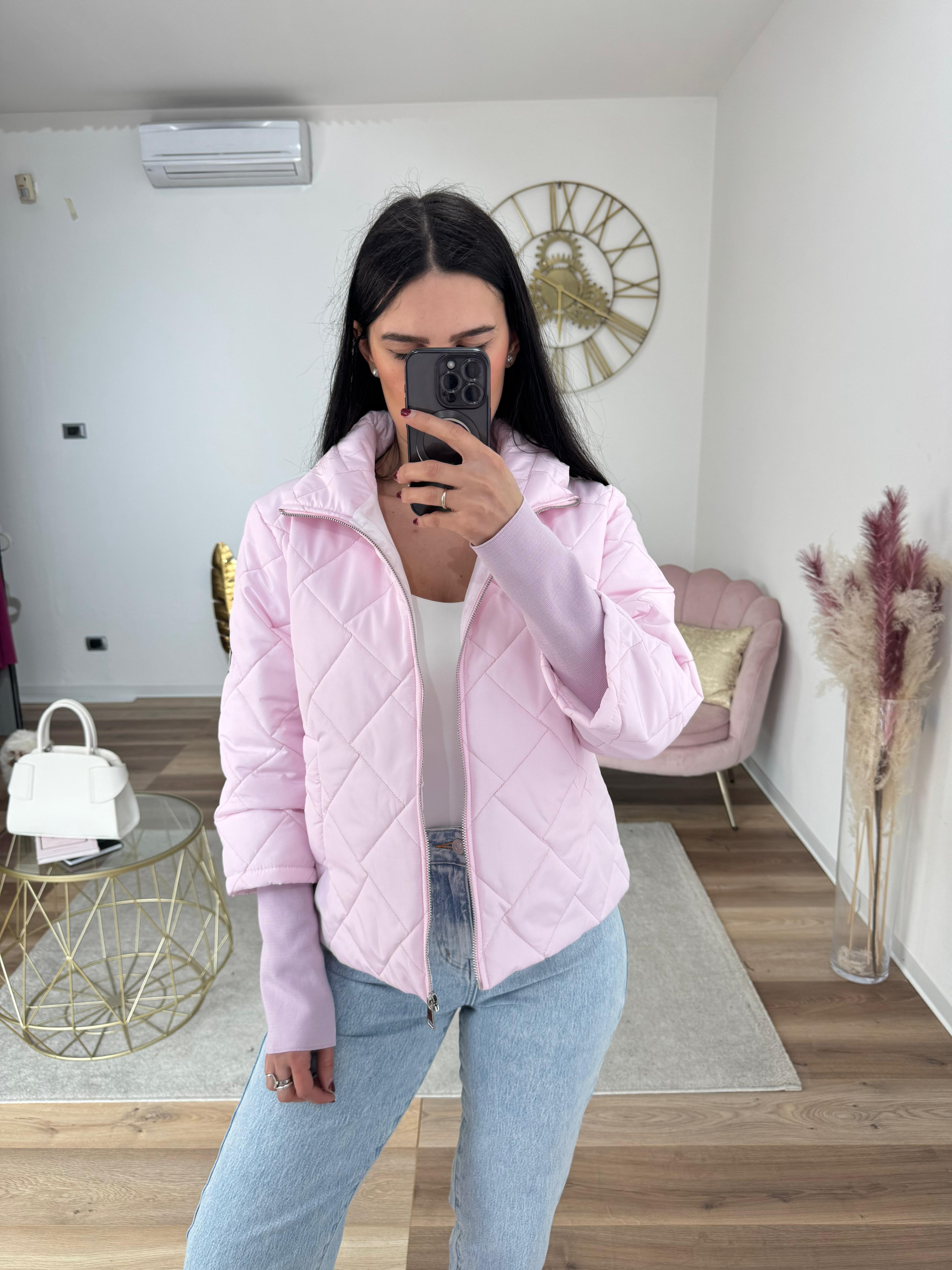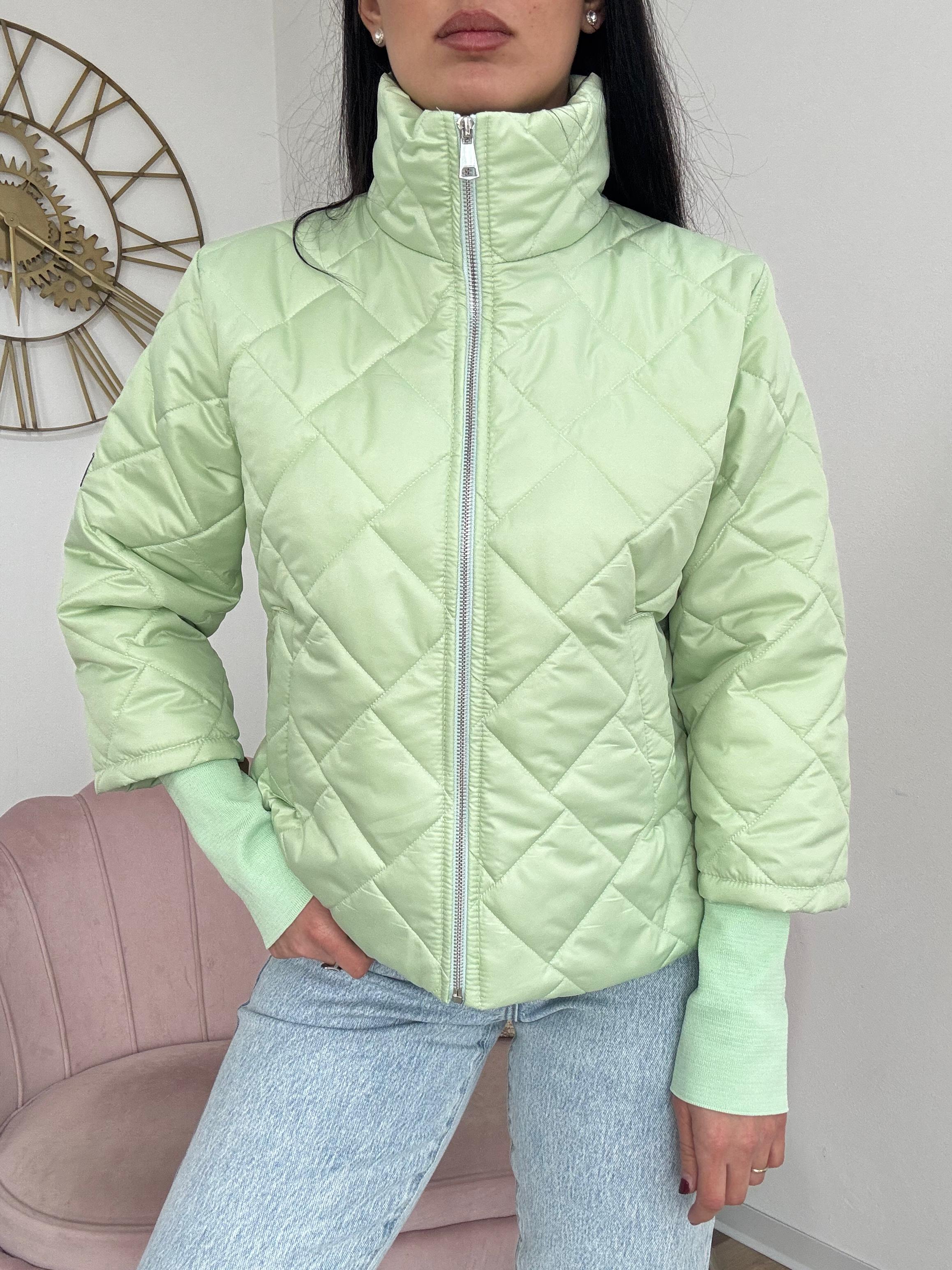 Micro piumino primaverile trapuntato, chiusura con zip, foderato internamente, con tasche.