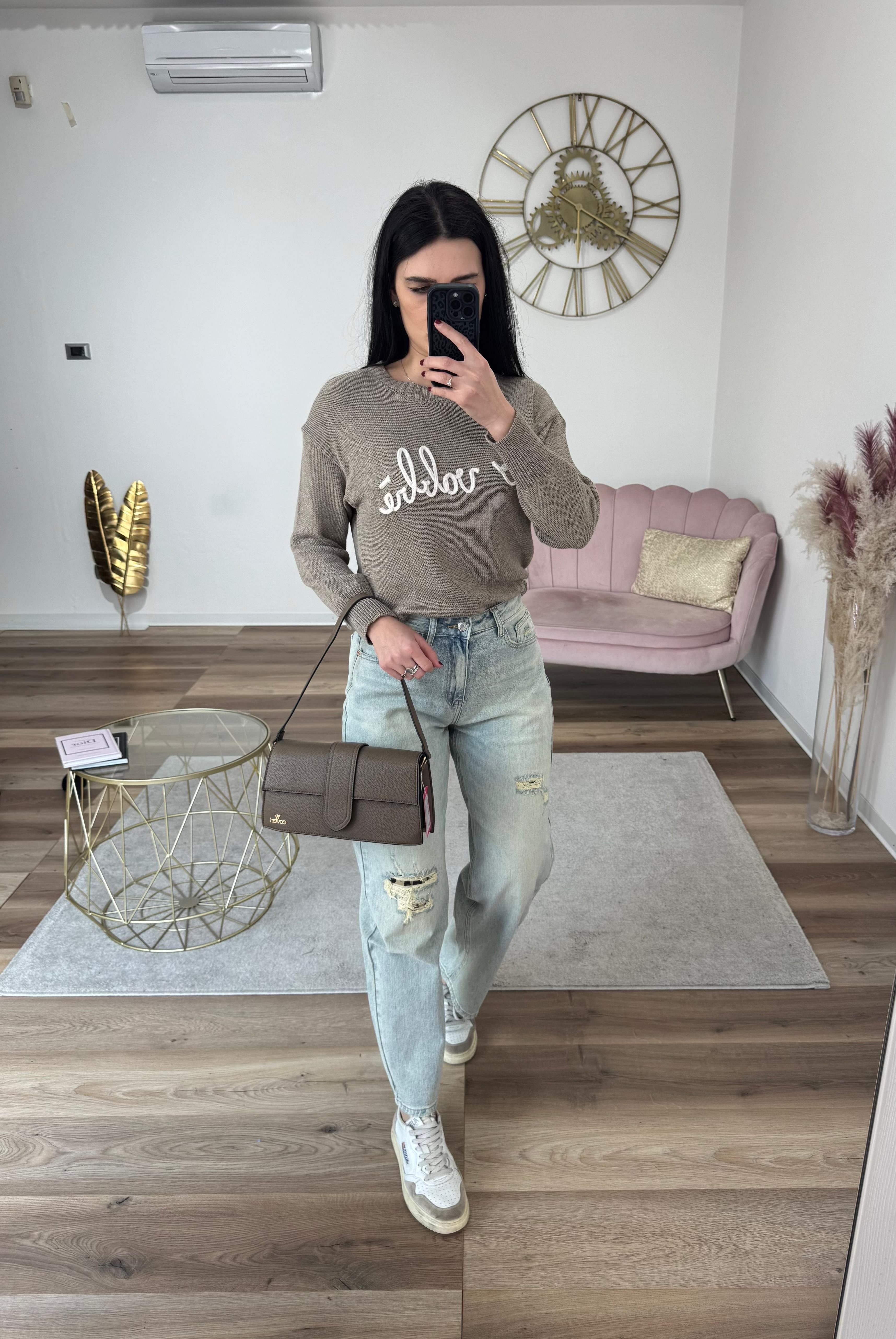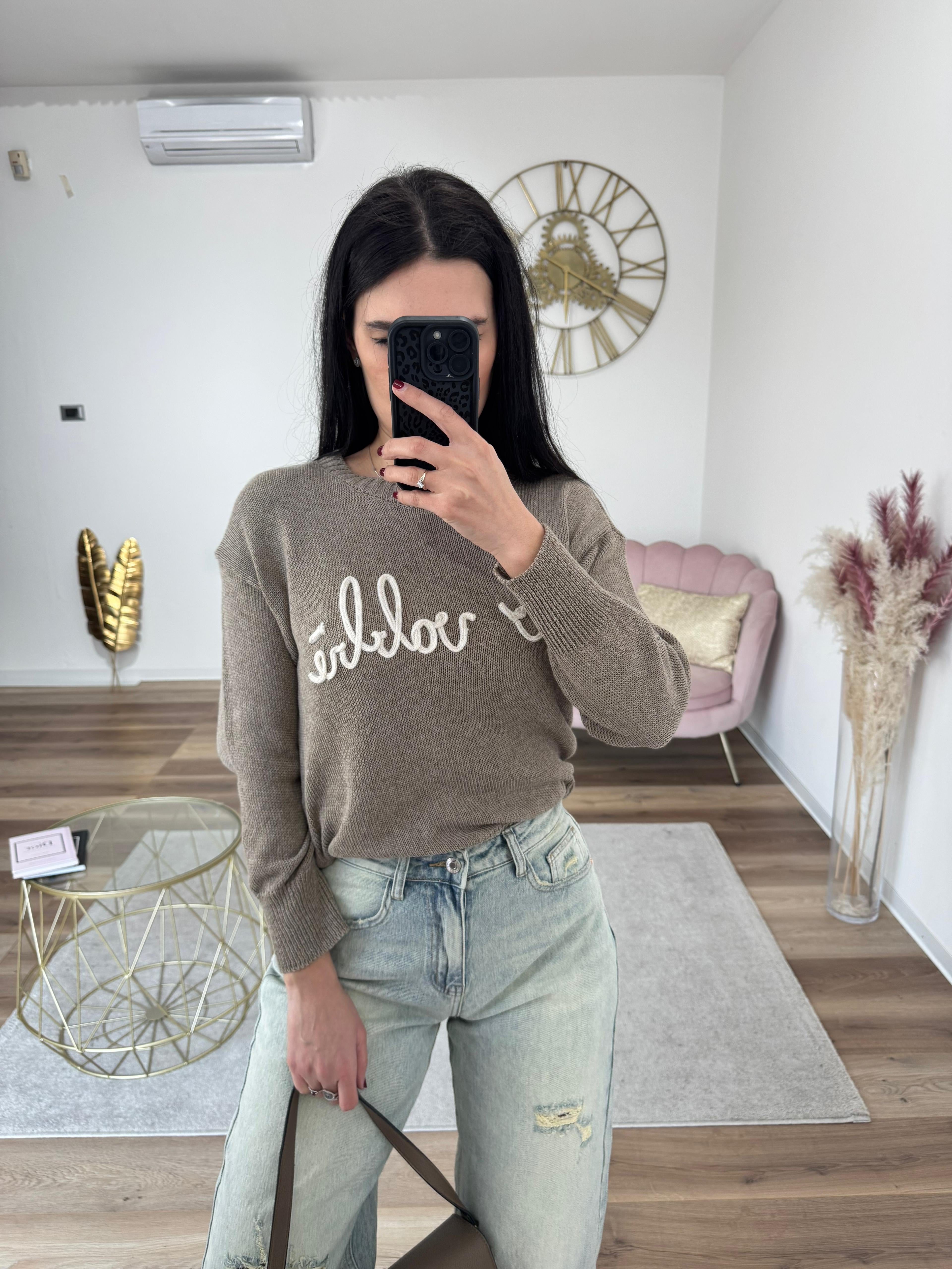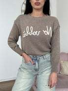 Pull morbido e caldo con scritta in rilievo, elasticizzato, maniche a sbuffo, lunghezza normale,