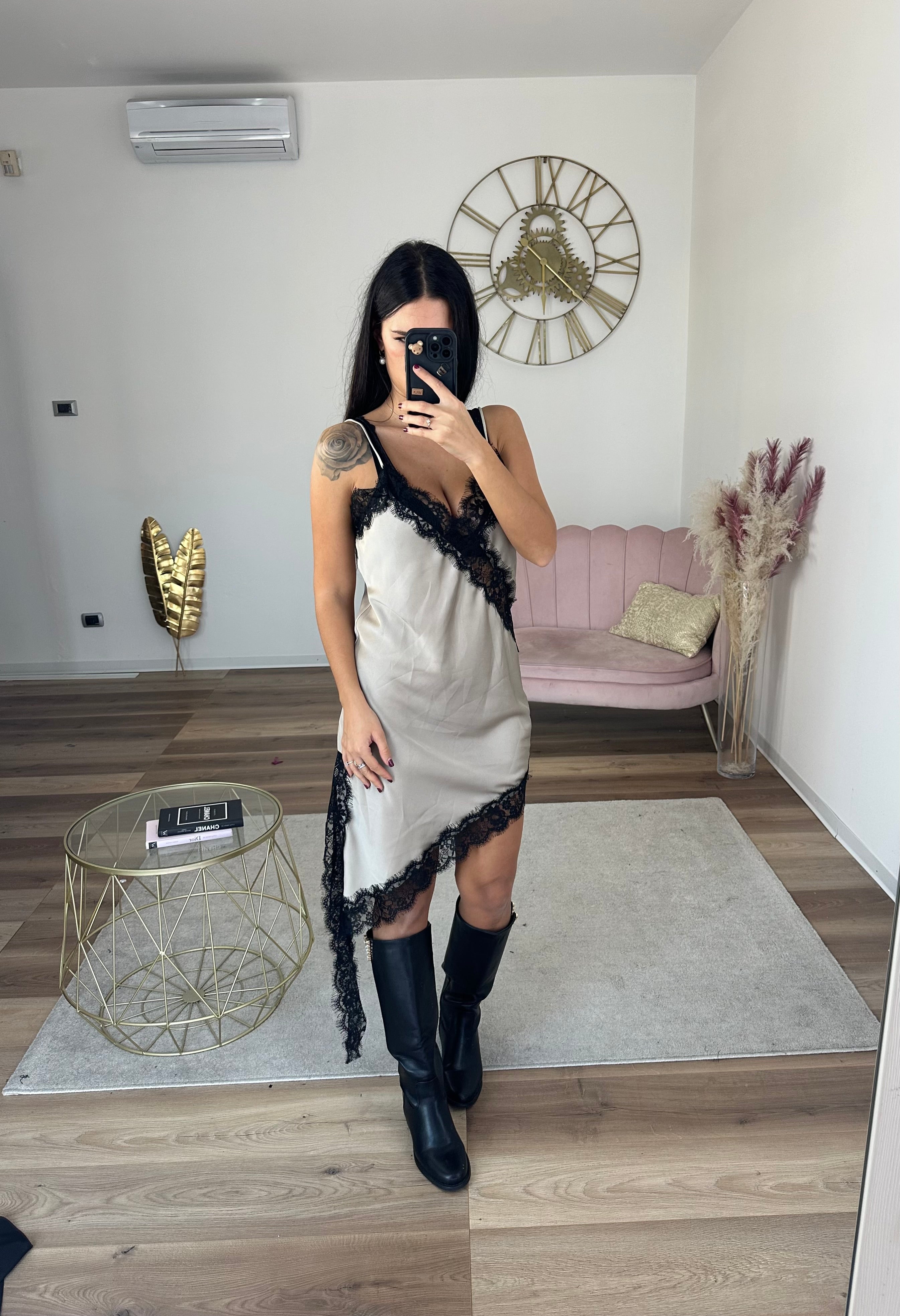 Abito in satin con pizzo, modello trapezio, bretelle regolabili, aperto lateralmente,