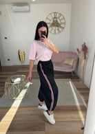 Pantalone tuta con banda laterale simil adidas, modello a palloncino, con vita elastica, polsino elastico nel fondo