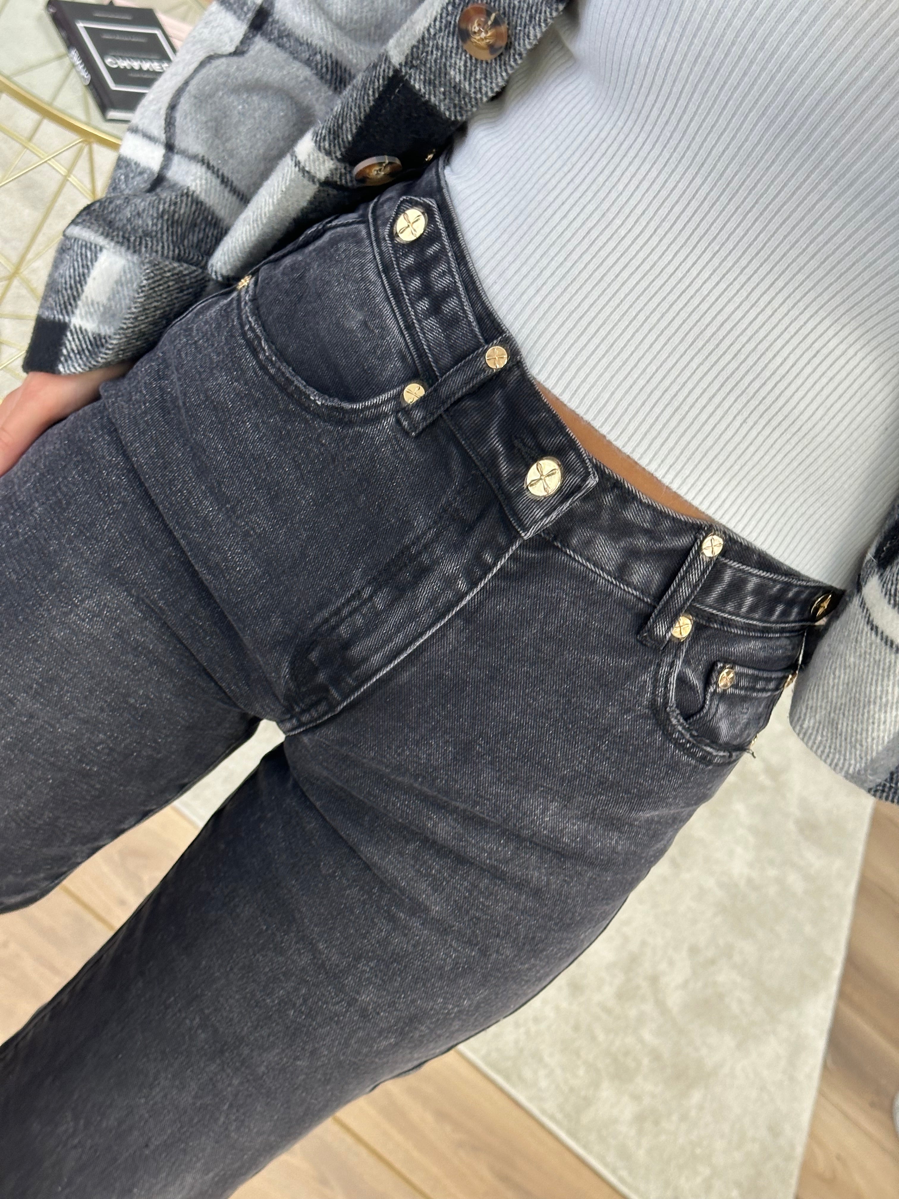 Jeans wide leg, lavaggio nero, a vita alta, leggermente elasticizzato, veste regolare.