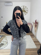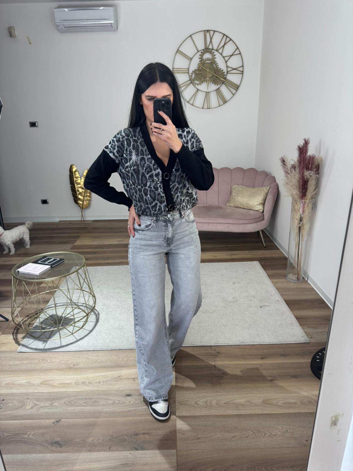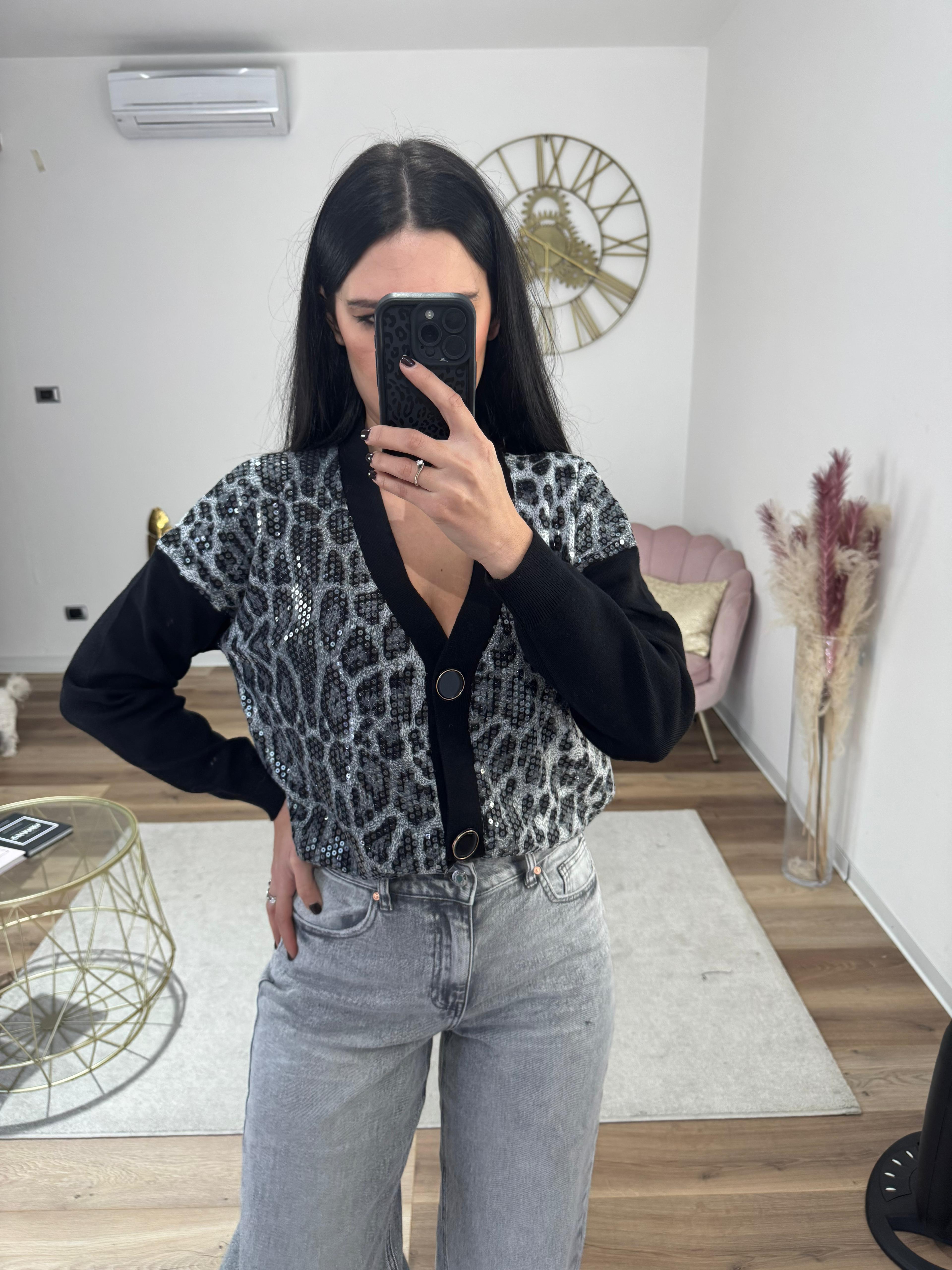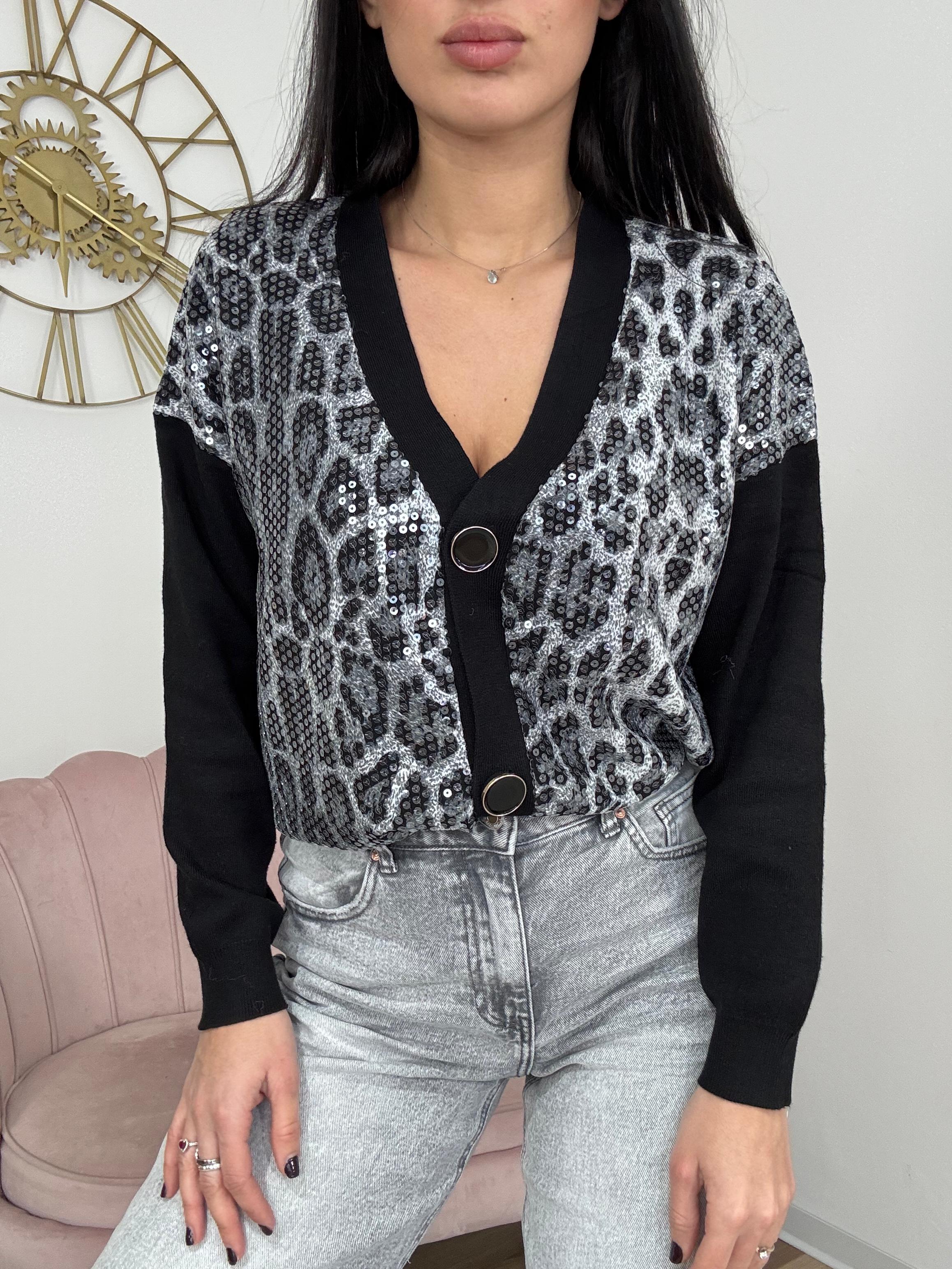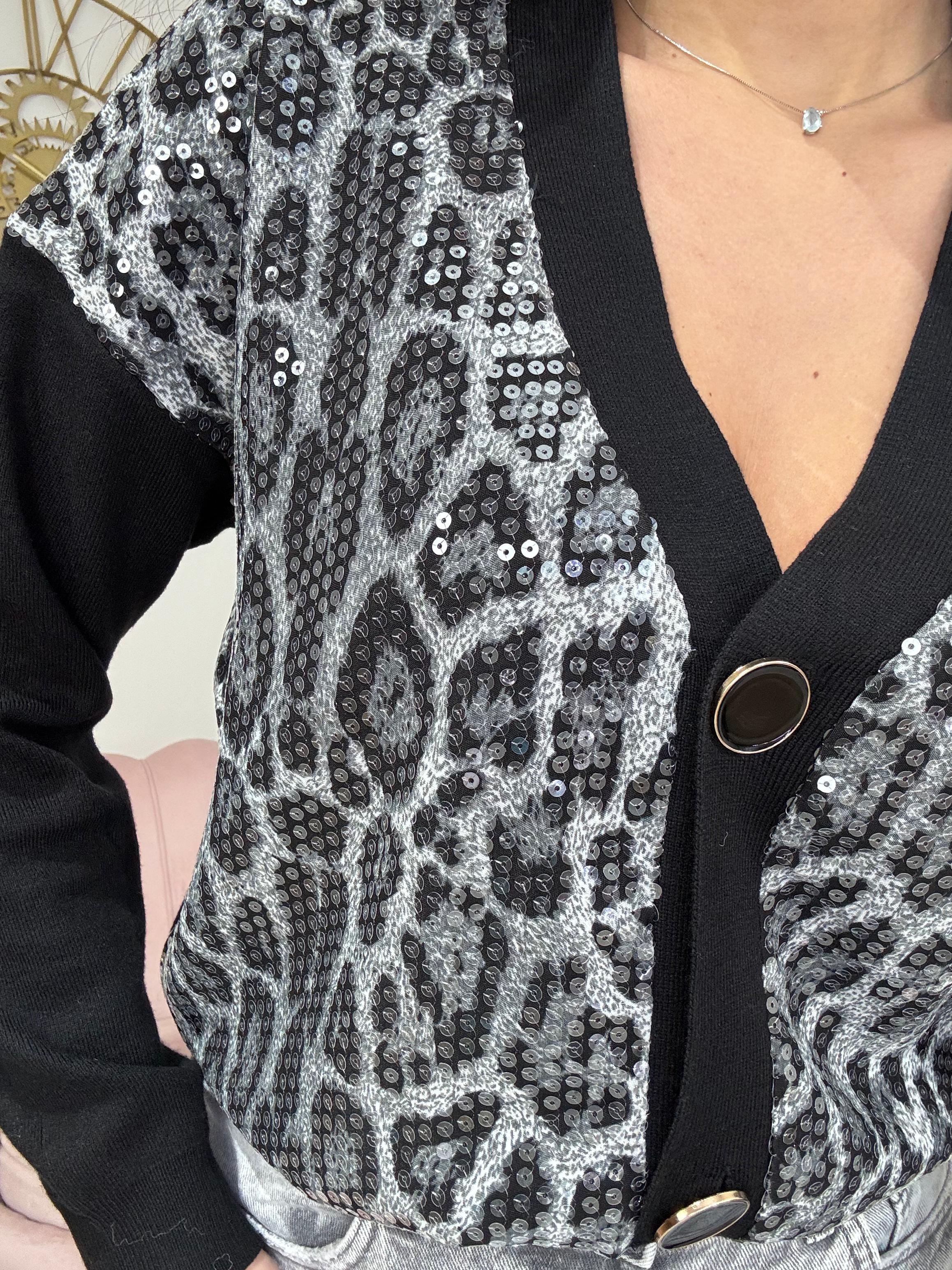 Cardigan caldo e morbido, impreziozito da paillettes, maniche a sbuffo, bottoni regolabili sul davanti