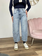 Jeans modello Barrell, morbido alla coscia e alla caviglia, elasticizzato, comodissimo, vestibilità regolare a vita alta.