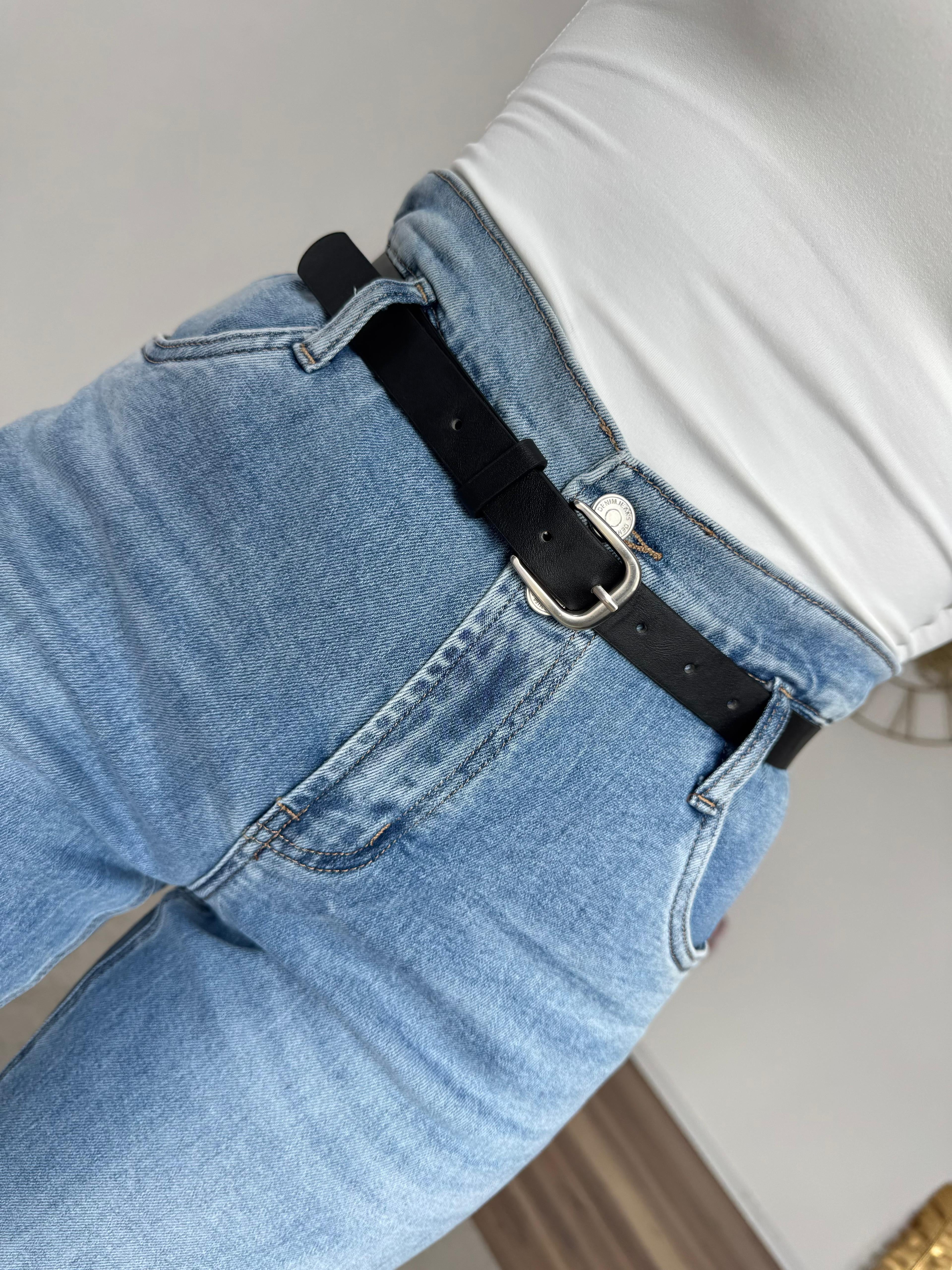 Jeans modello a caramella, vita alta ed elastica , morbido alla coscia, elasticizzato e completo della propria cintura.