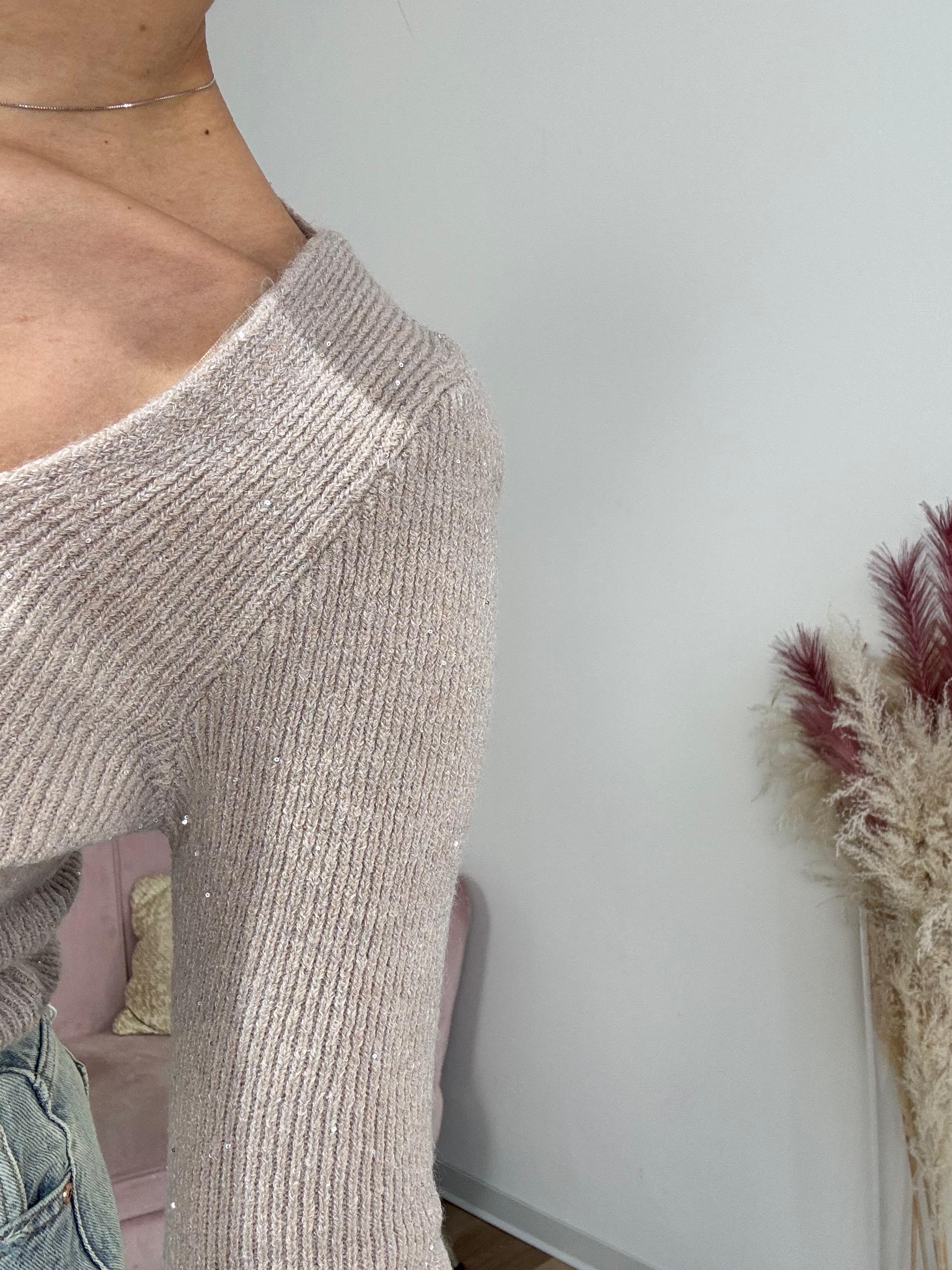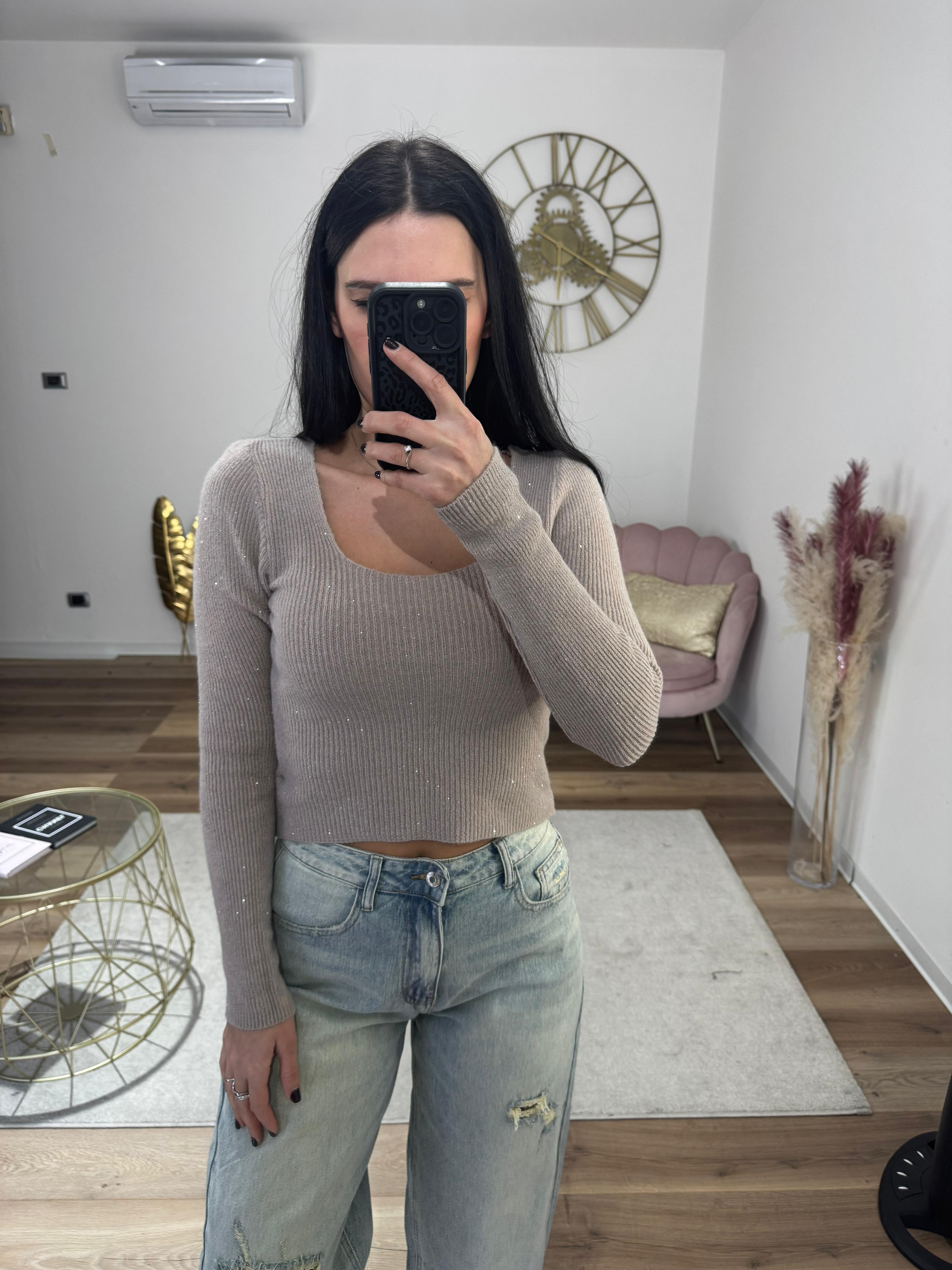Pull morbido e caldo, elasticizzato, crop lunghezza fino ombelico, impreziosito da micropailettes.