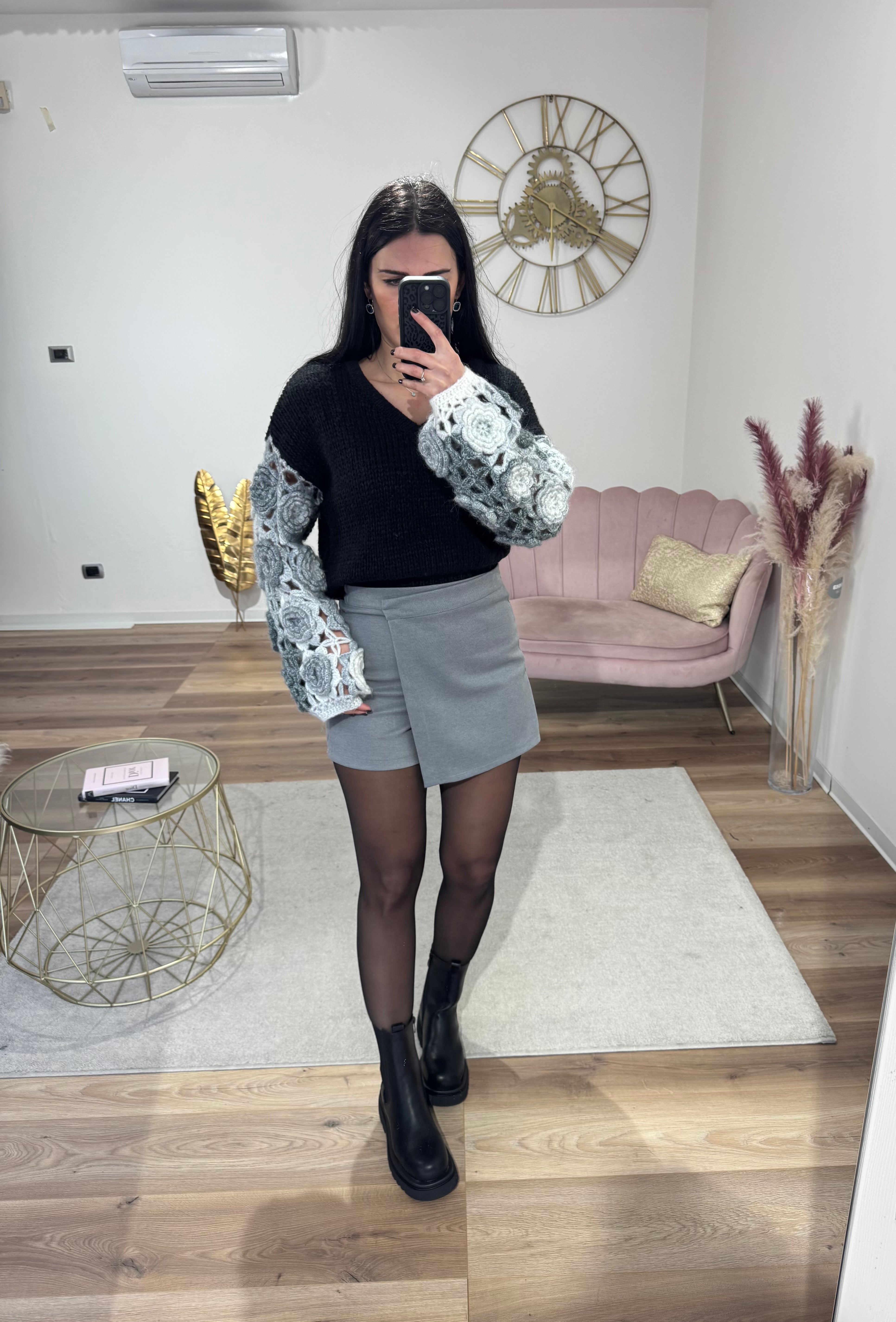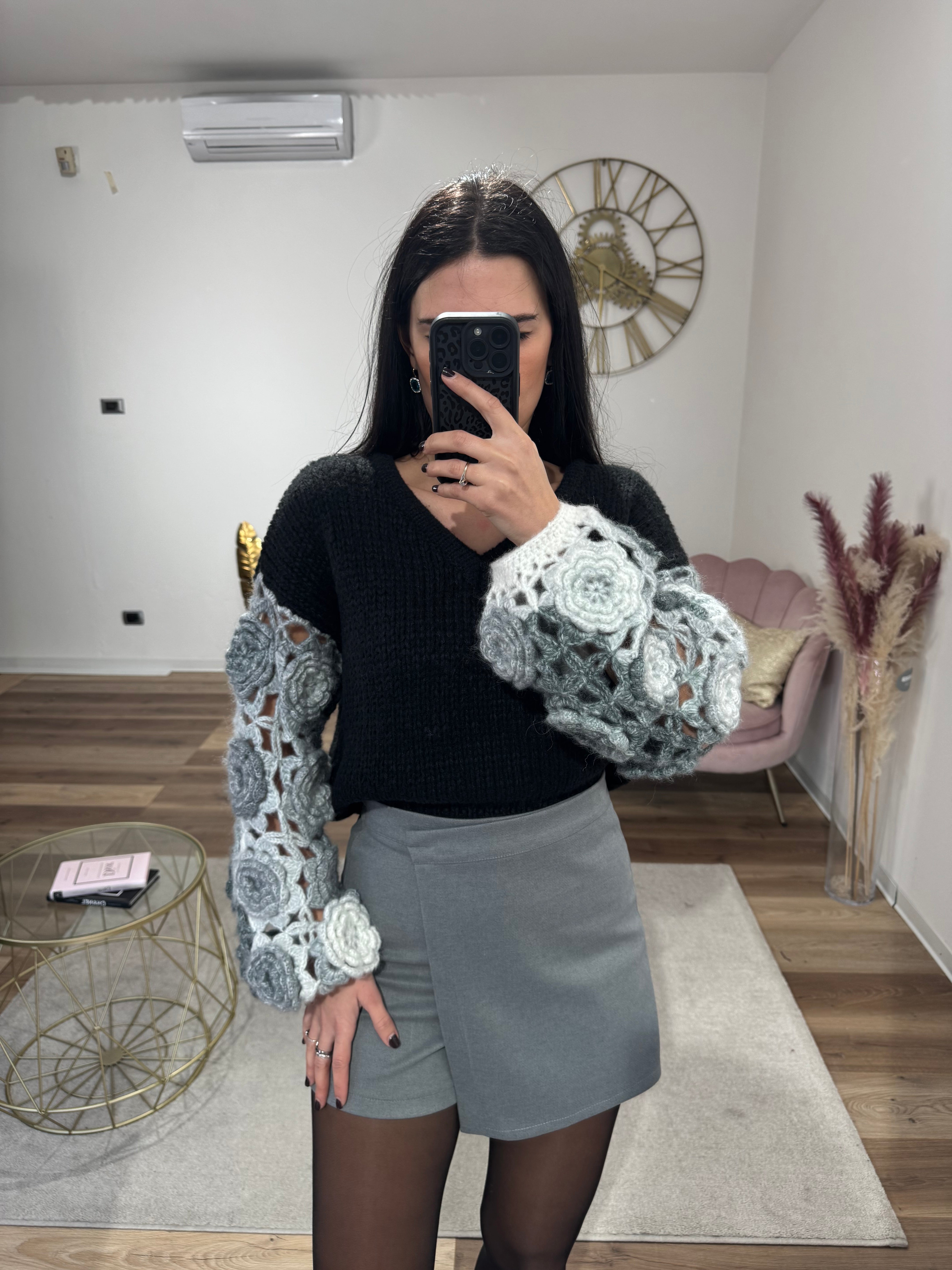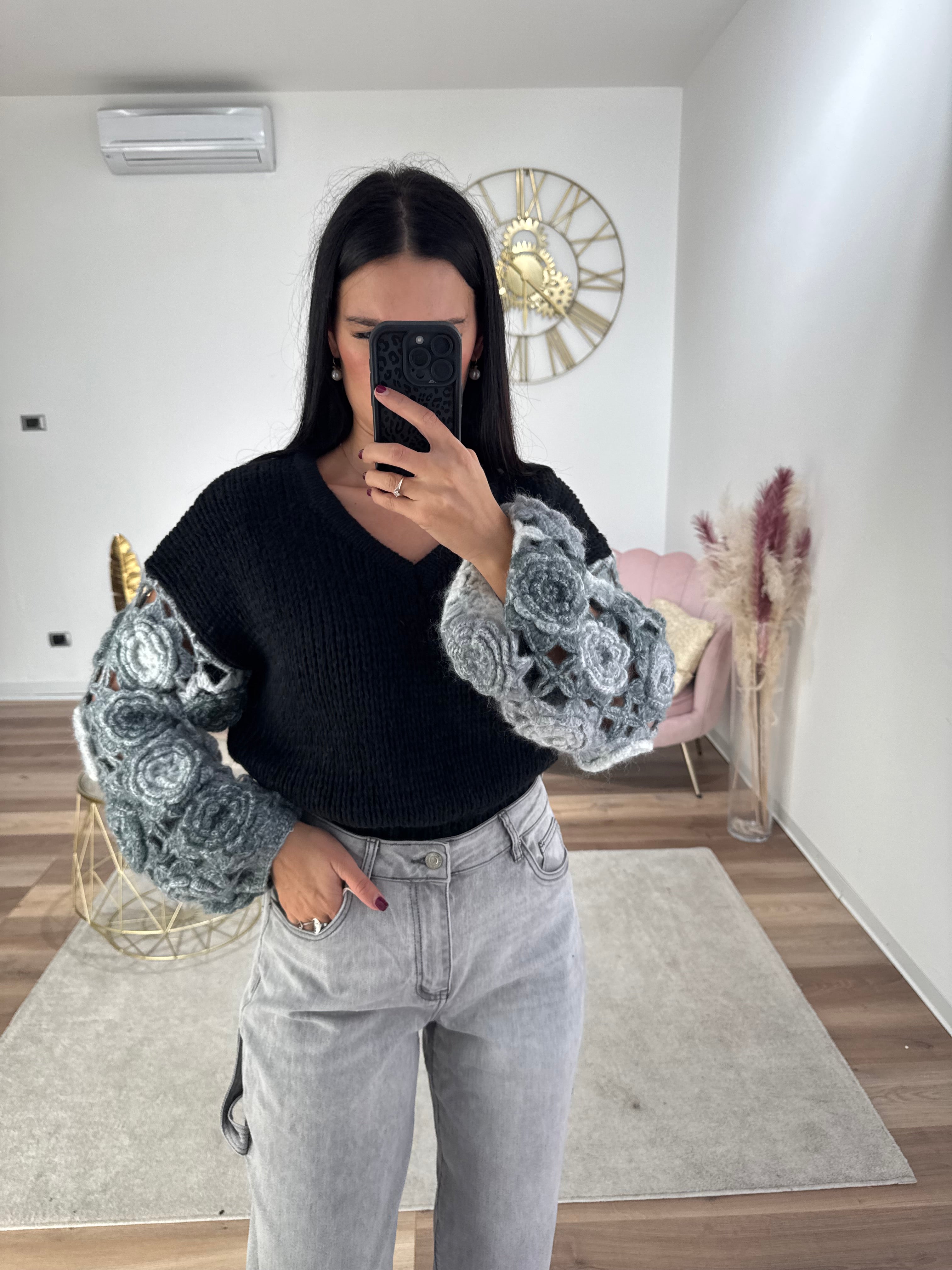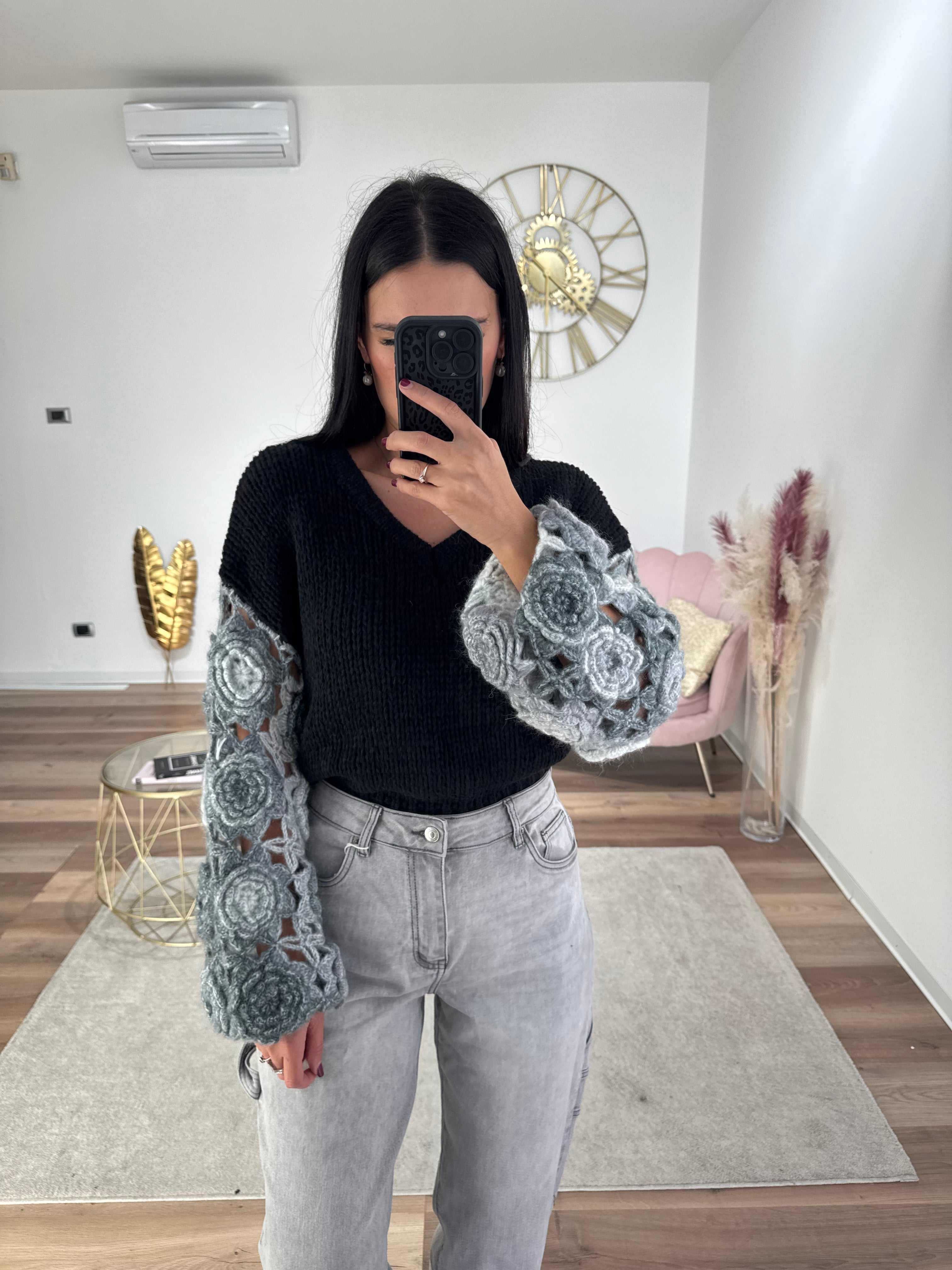 Pull con maniche traforate e rose ricamate, scollo a V, lunghezza normale, morbido e caldo, elasticizzato