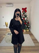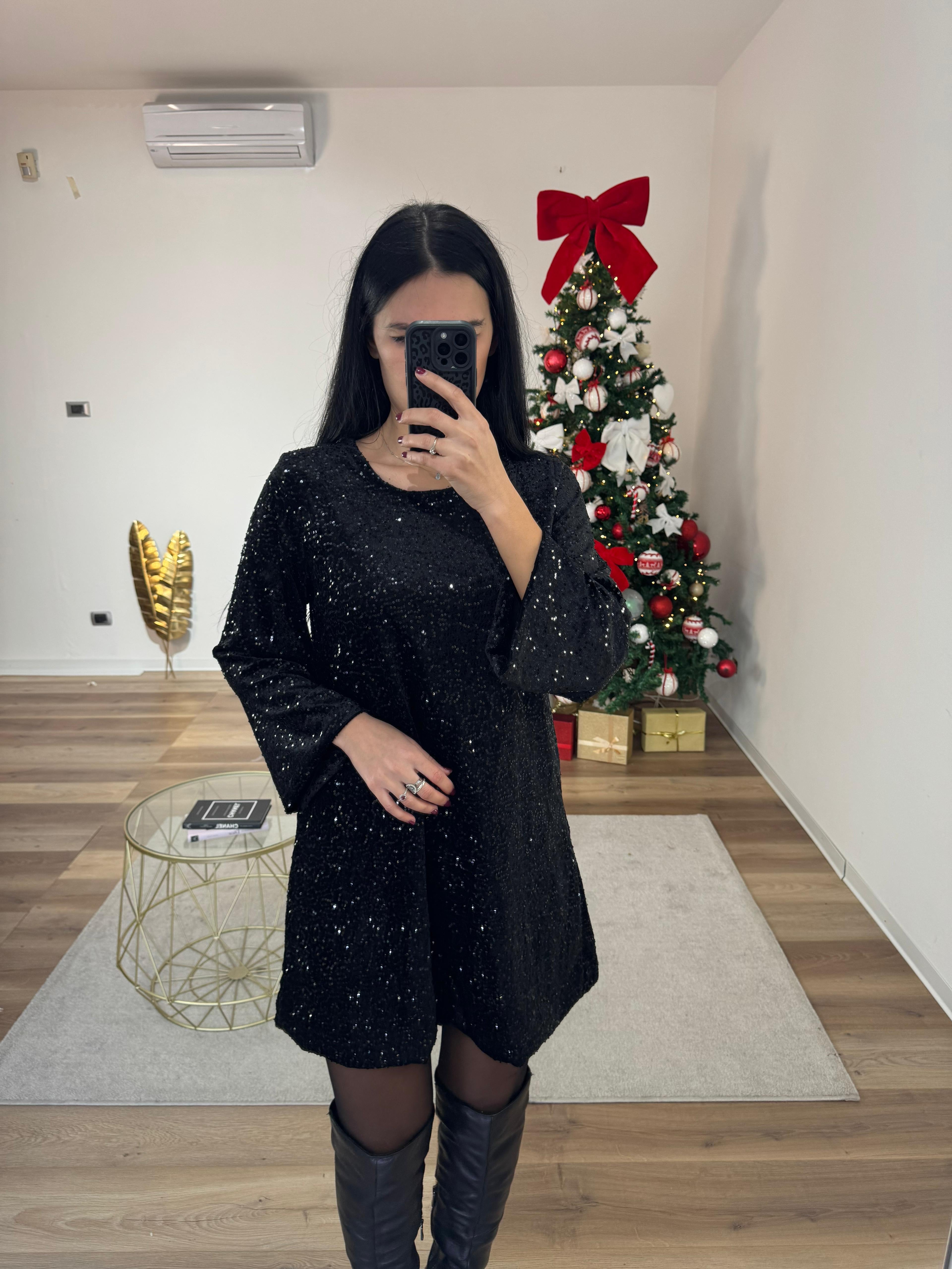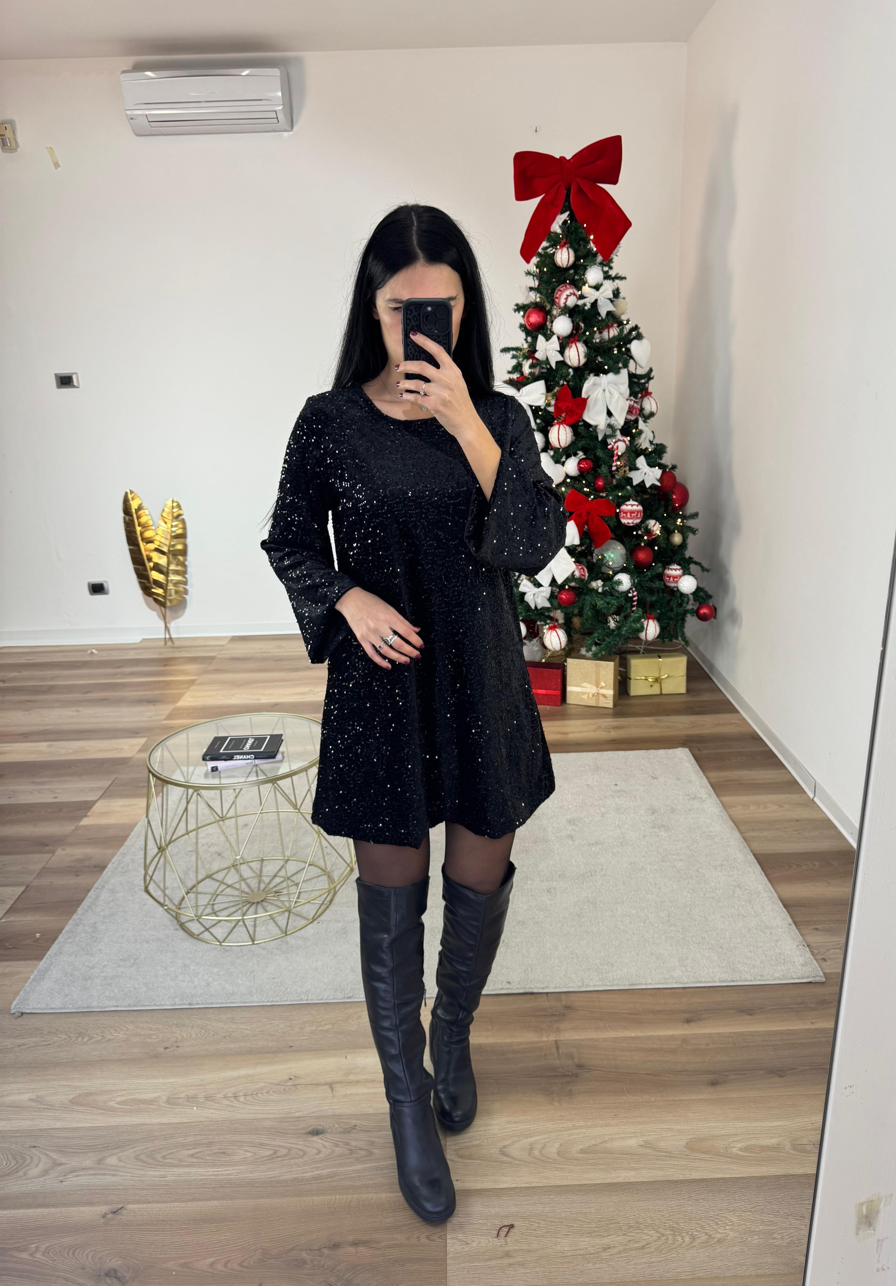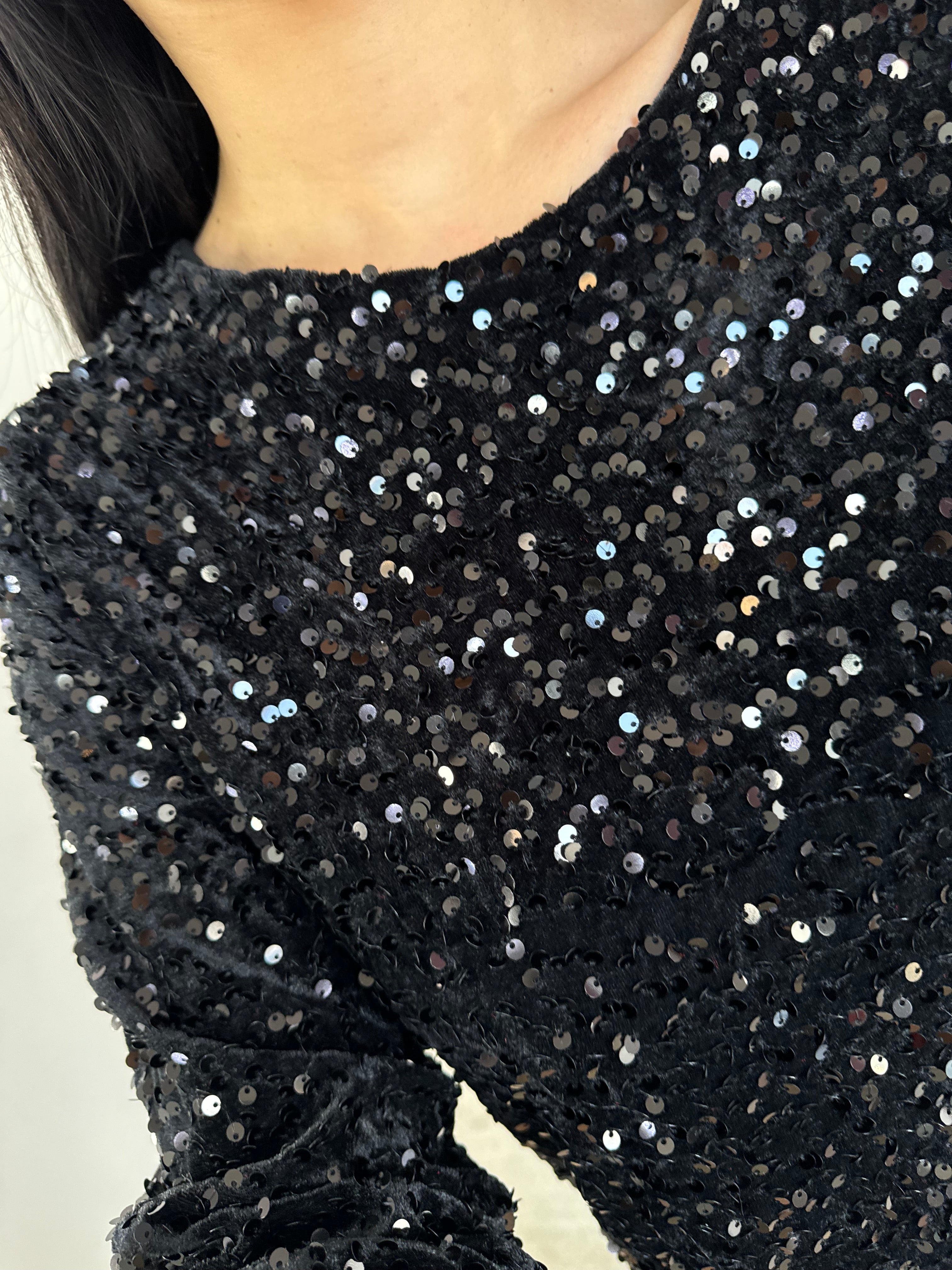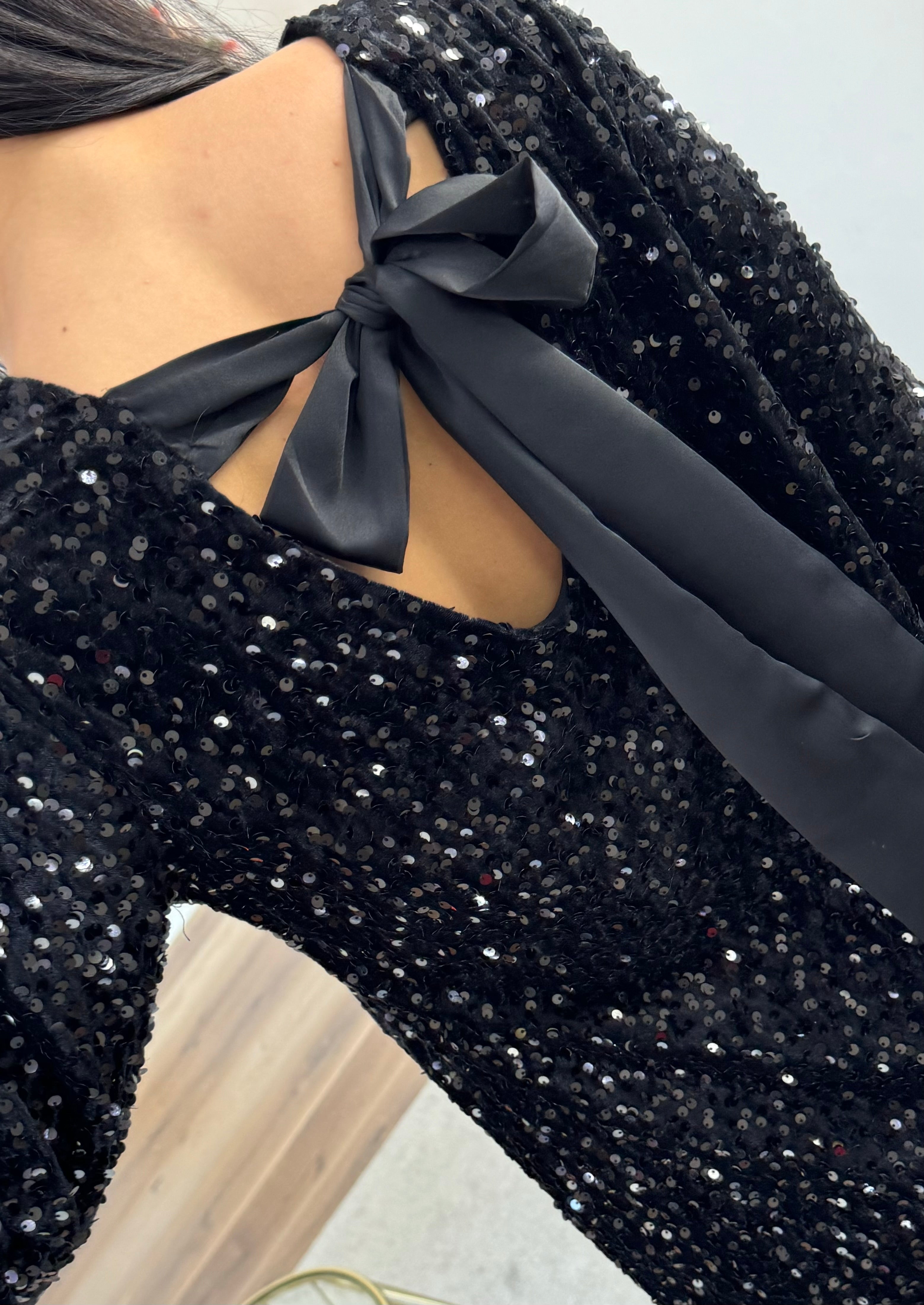 Abito in velluto ricoperto di paillettes argento, manica leggermente ampie, fiocco sul retro, con sottoveste, morbido lungo i fianchi.