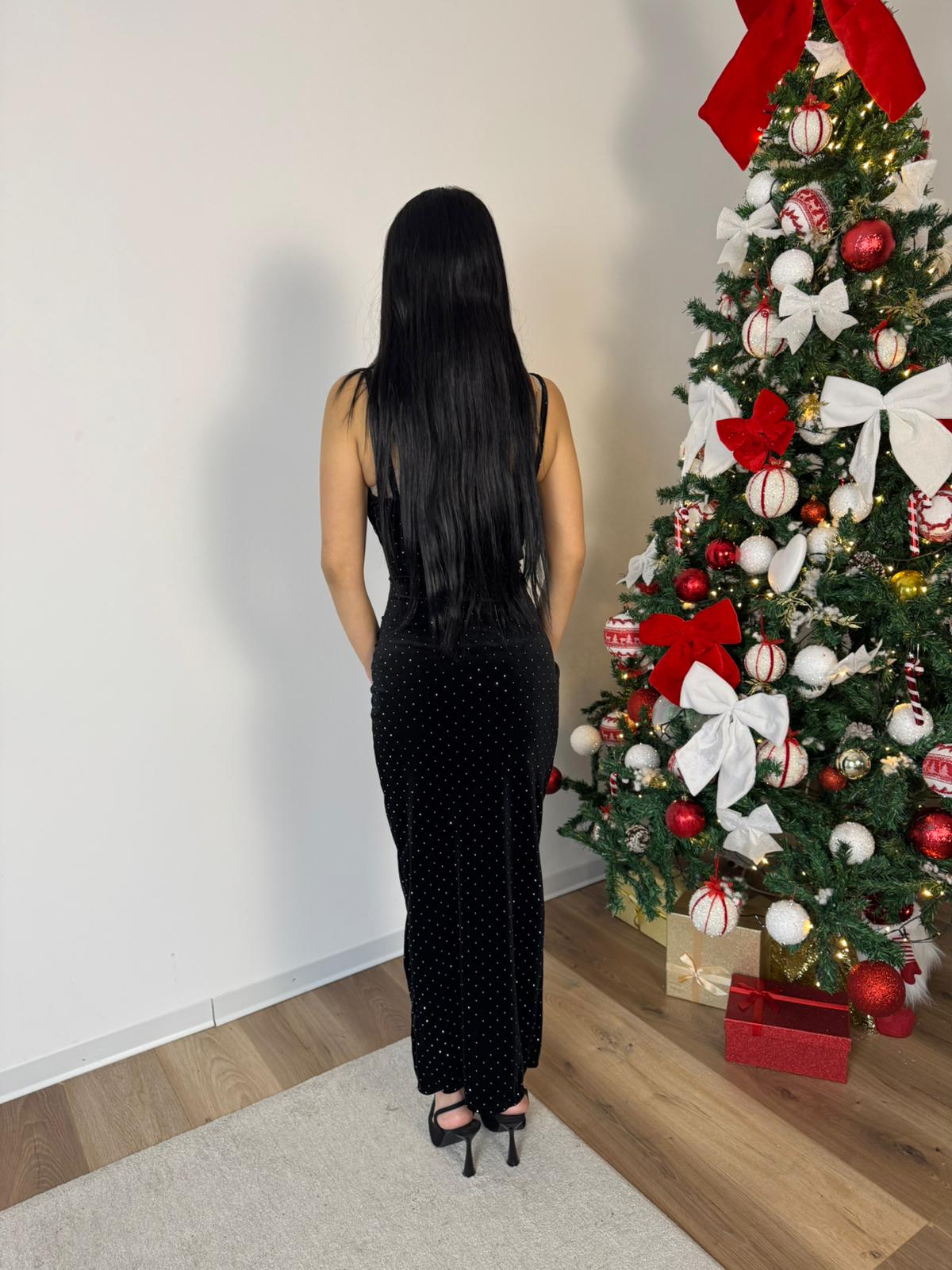 Abito in velluto con strass, coppe preformate, le bretelle non sono regolabili, presenta uno spacco, leggermente elasticizzato.