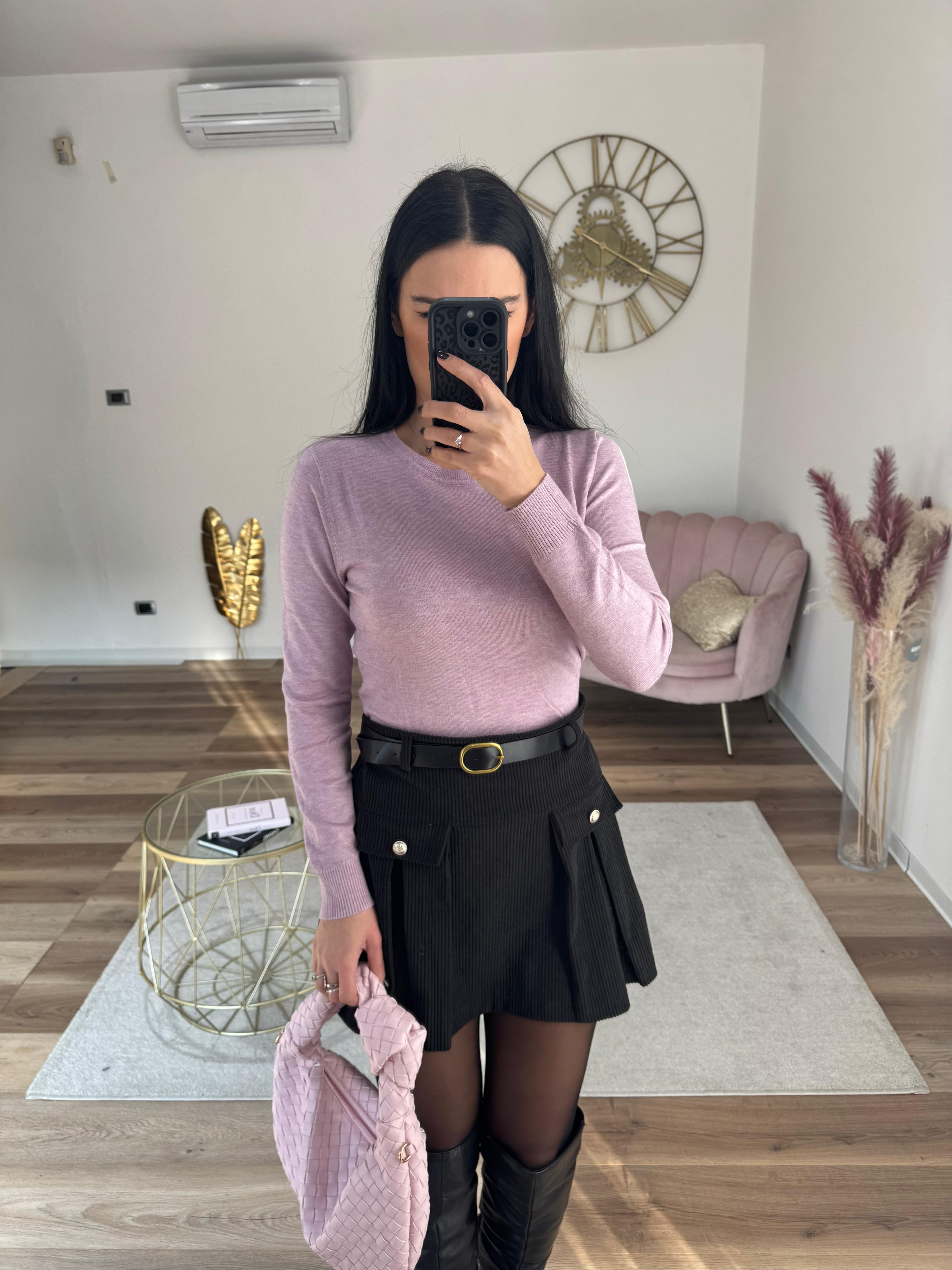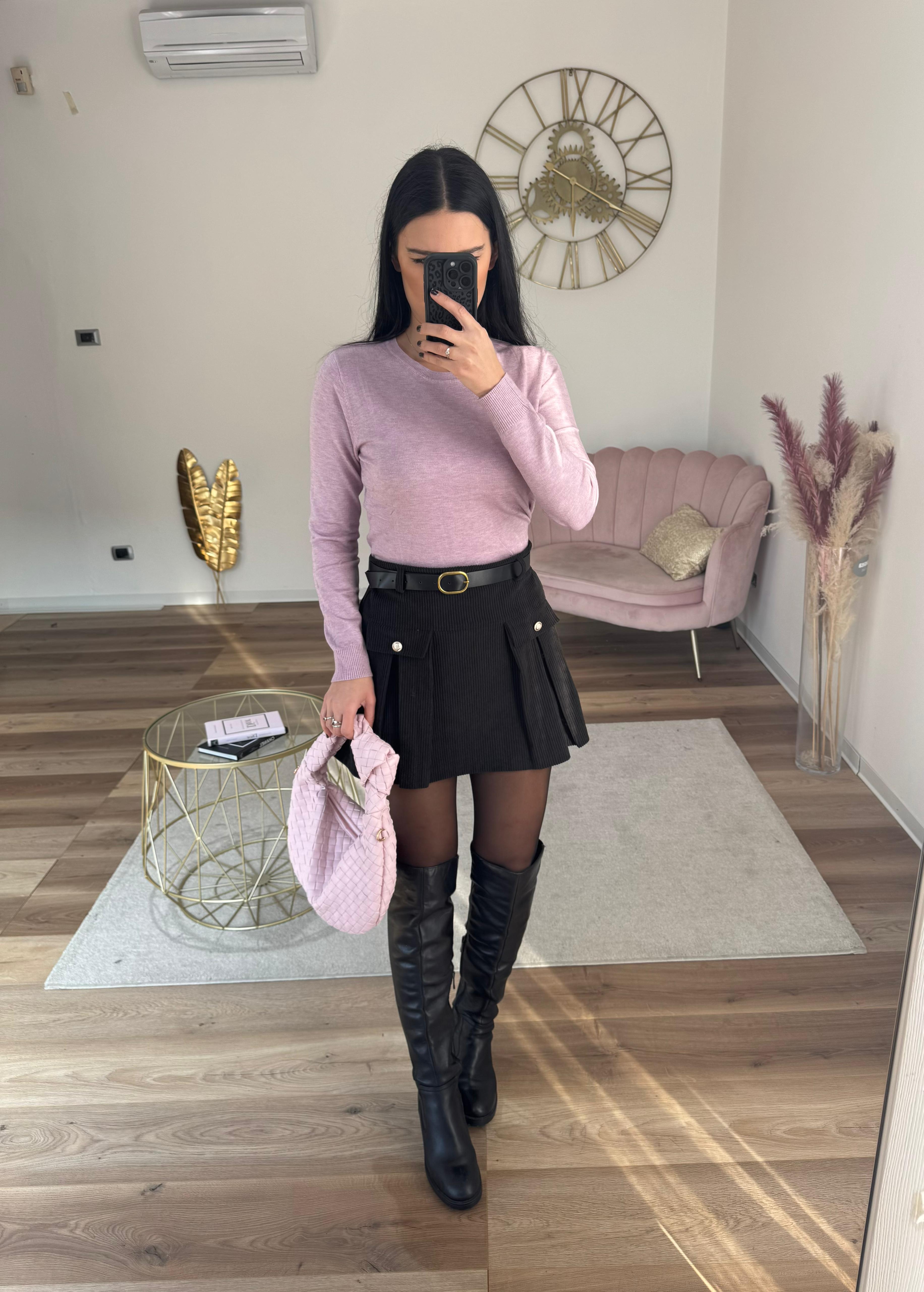 Gonna in velluto, finte tasche con bottoncini, vita non elastica, chiusura con zip sul retro, completa del proprio cinturino (non in foto), va a taglie, vestibilità regolare