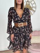 Abito in chiffon, manica ampia nel fondo, Fantasia con filo dorato all’interno, Scende morbido lungo il fianco, scollo sovrapposto, Completo del suo cinturino in tessuto, vita elastica.