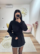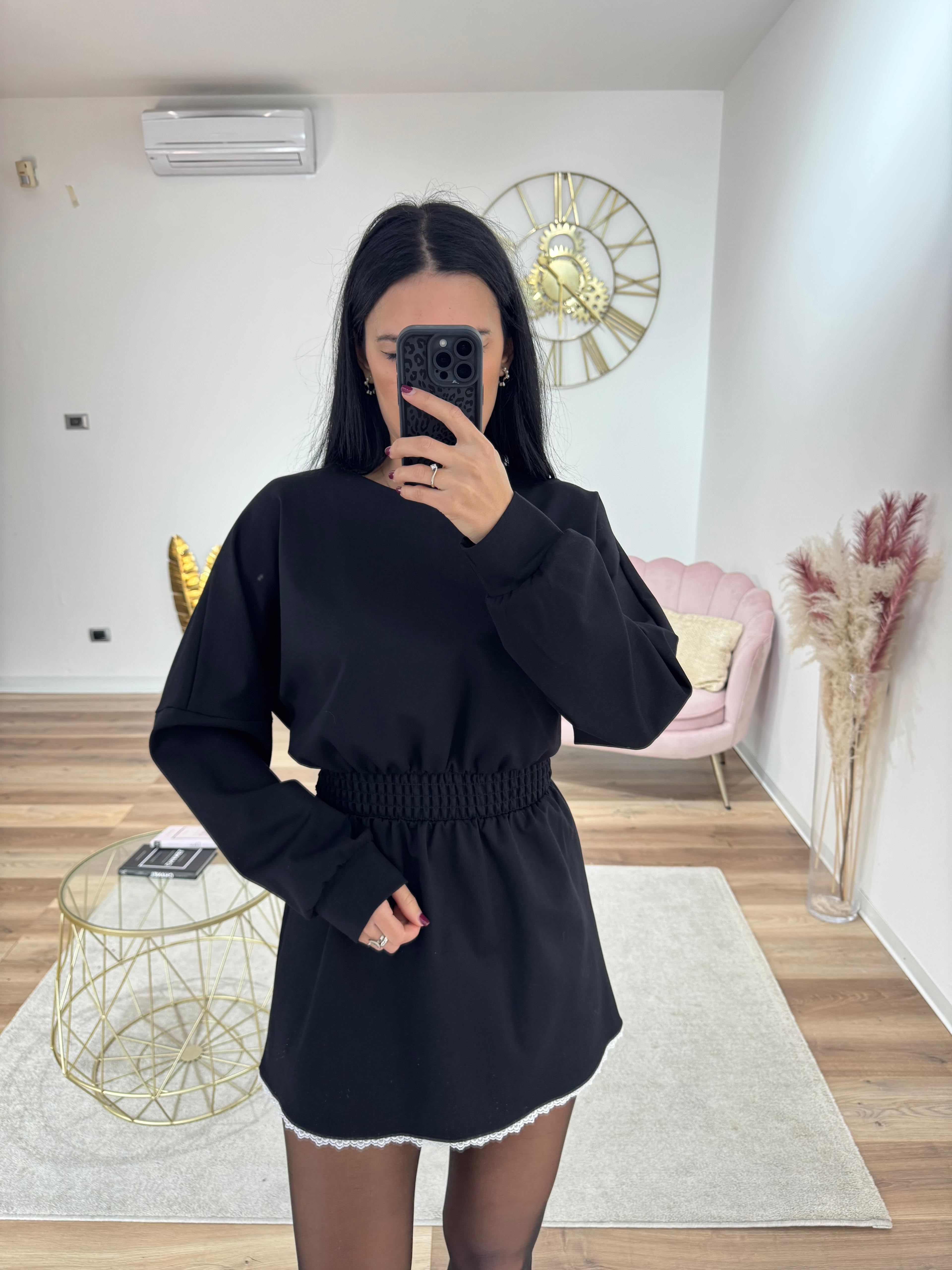Abito con parte finale in pizzo bianco, punto vita arricciato ed elastico, tessuto come una tuta, non foderato intermanete