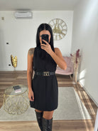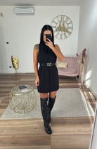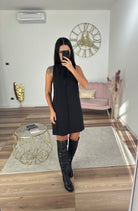 Abito con scollatura profonda ma ricoperta da tessuto velato, effetto vedo e non vedo, si lega al collo, scende morbido lungo i fianchi