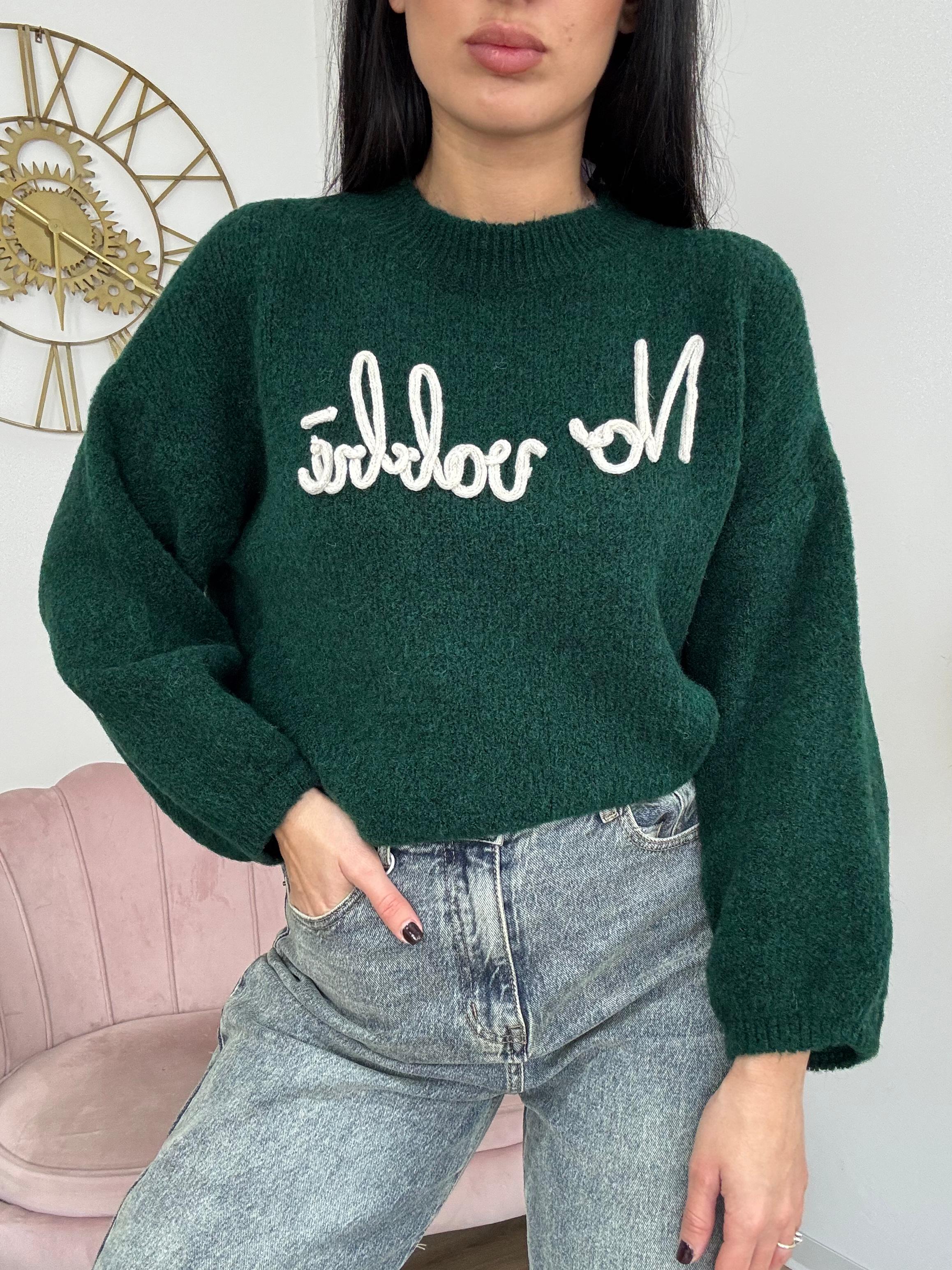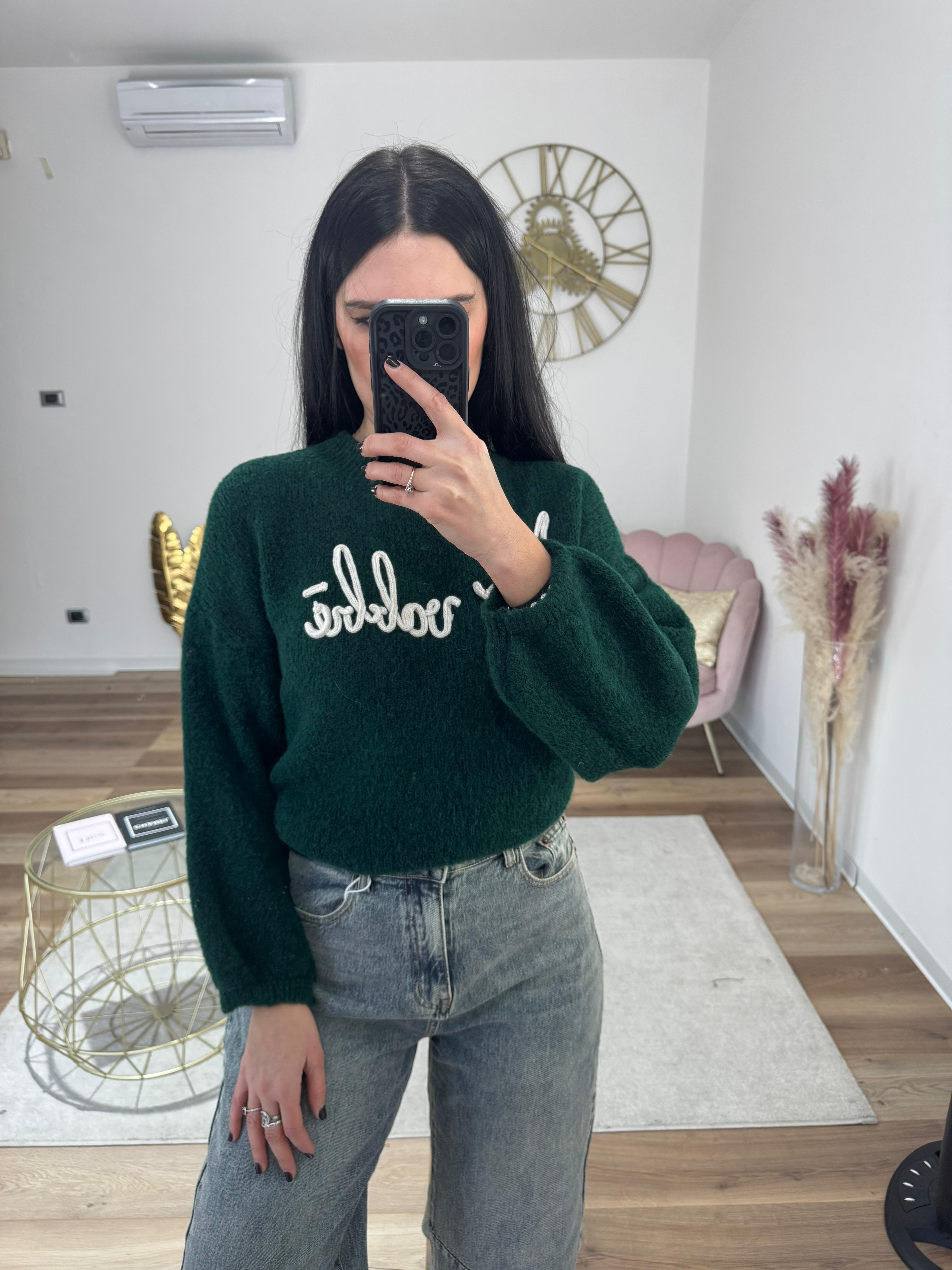 Pull morbido e caldo con scritta in rilievo, elasticizzato, maniche a sbuffo, lunghezza normale