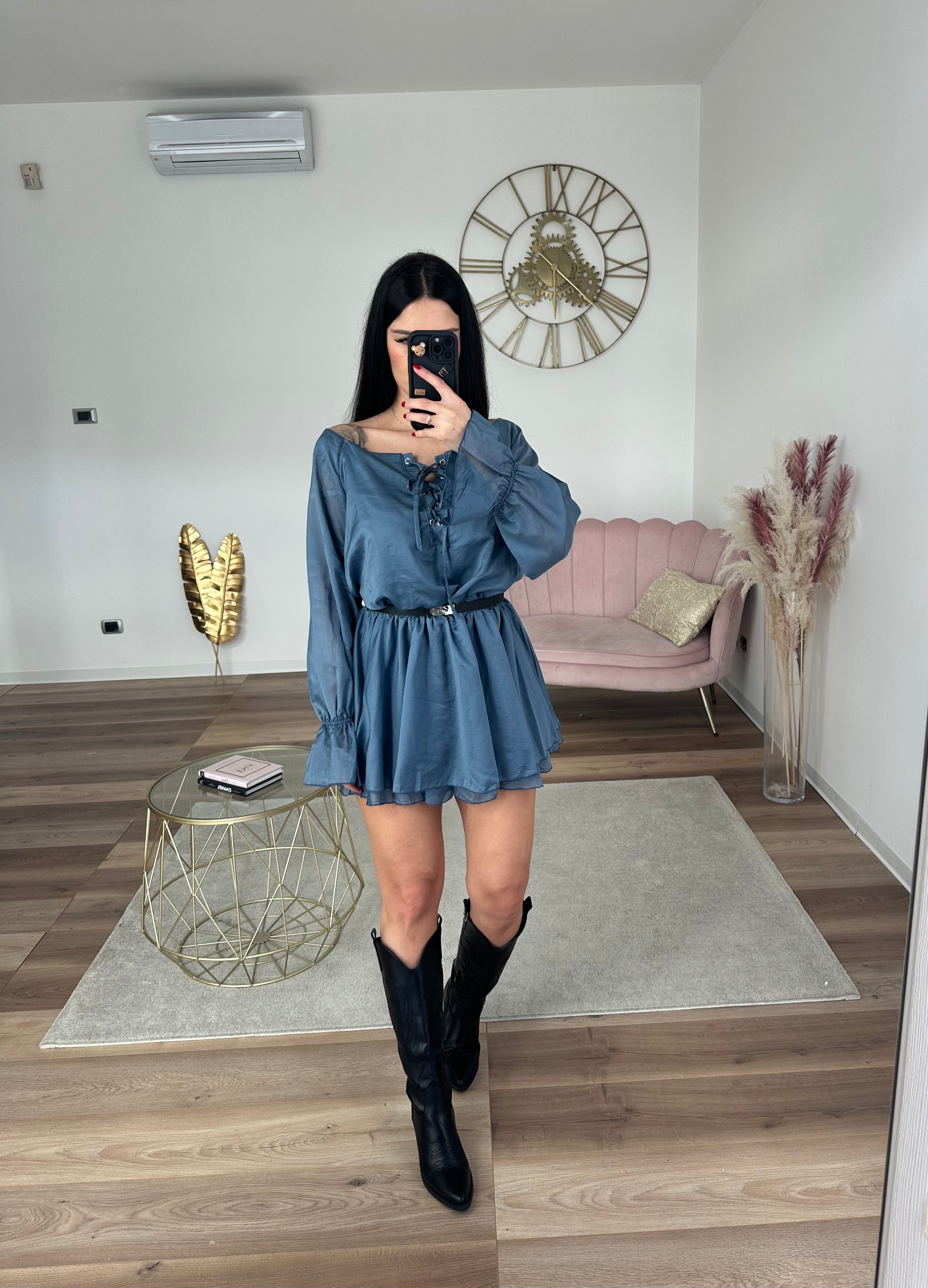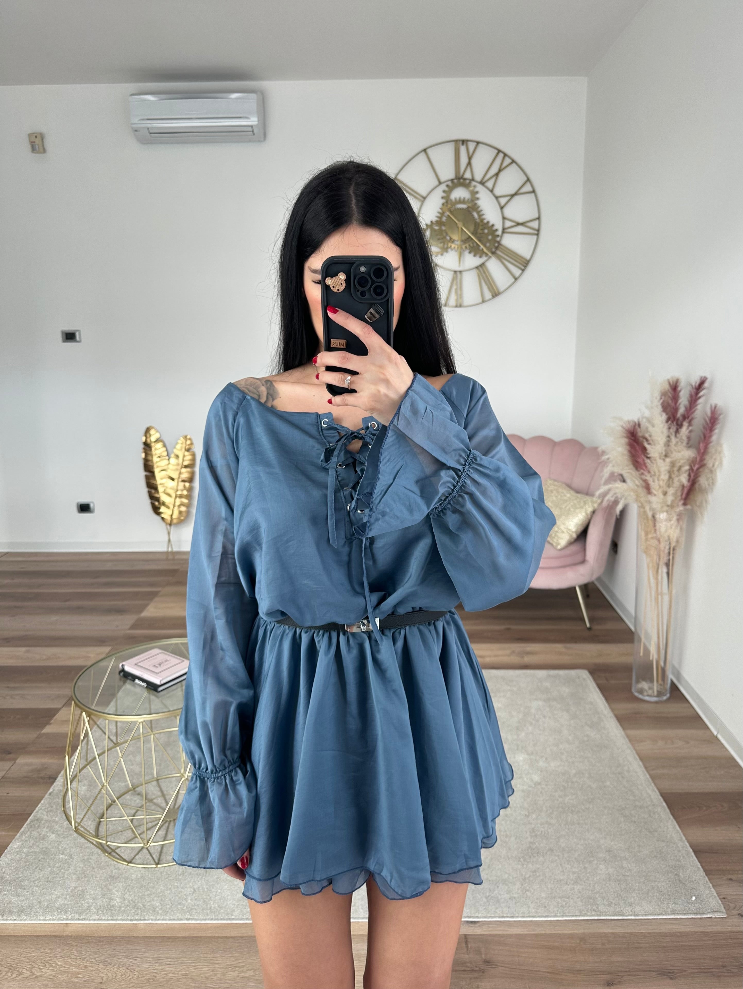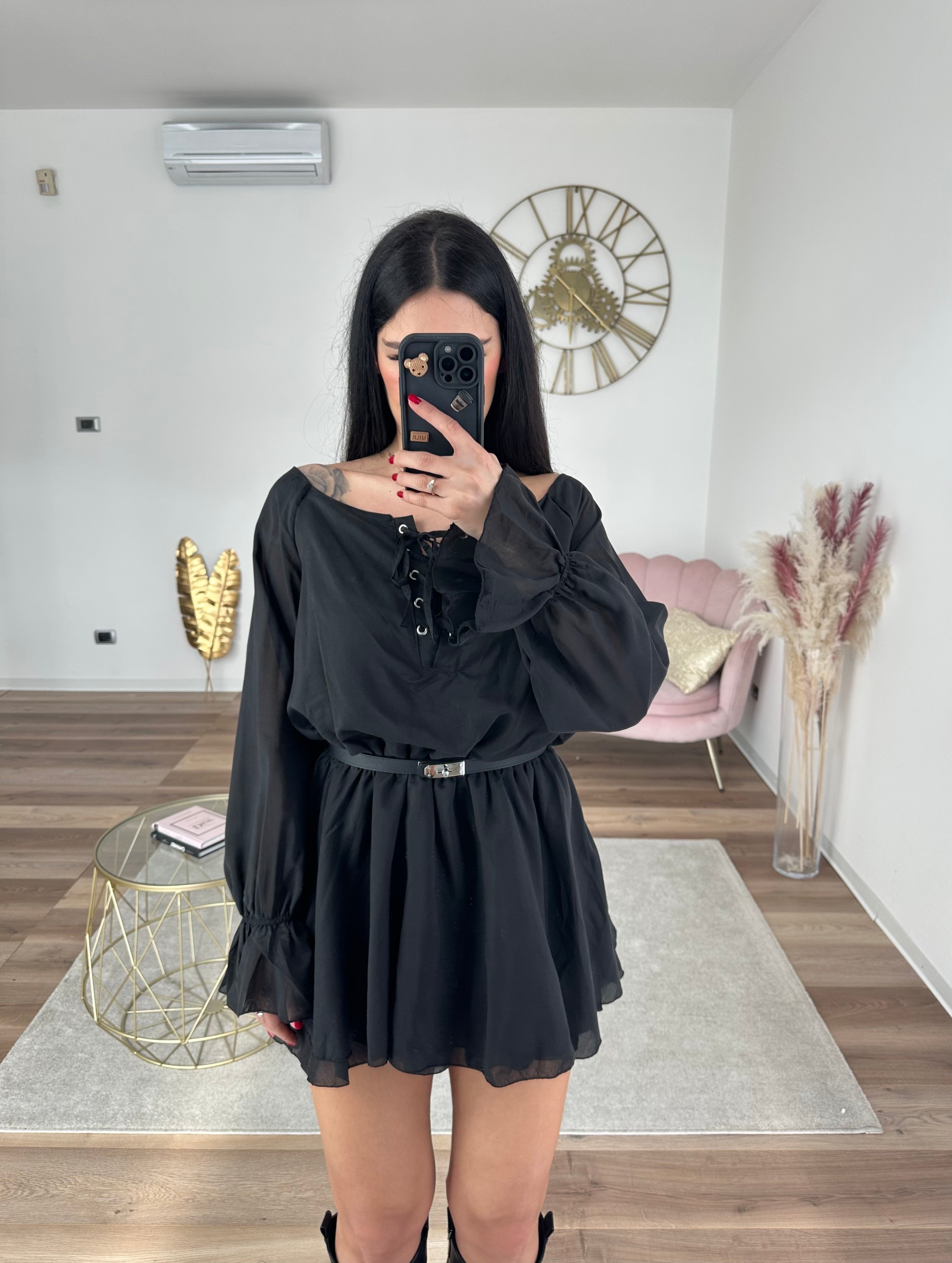 Abito con vita elastica, chiusura sul davanti, scollo elasticizzato.