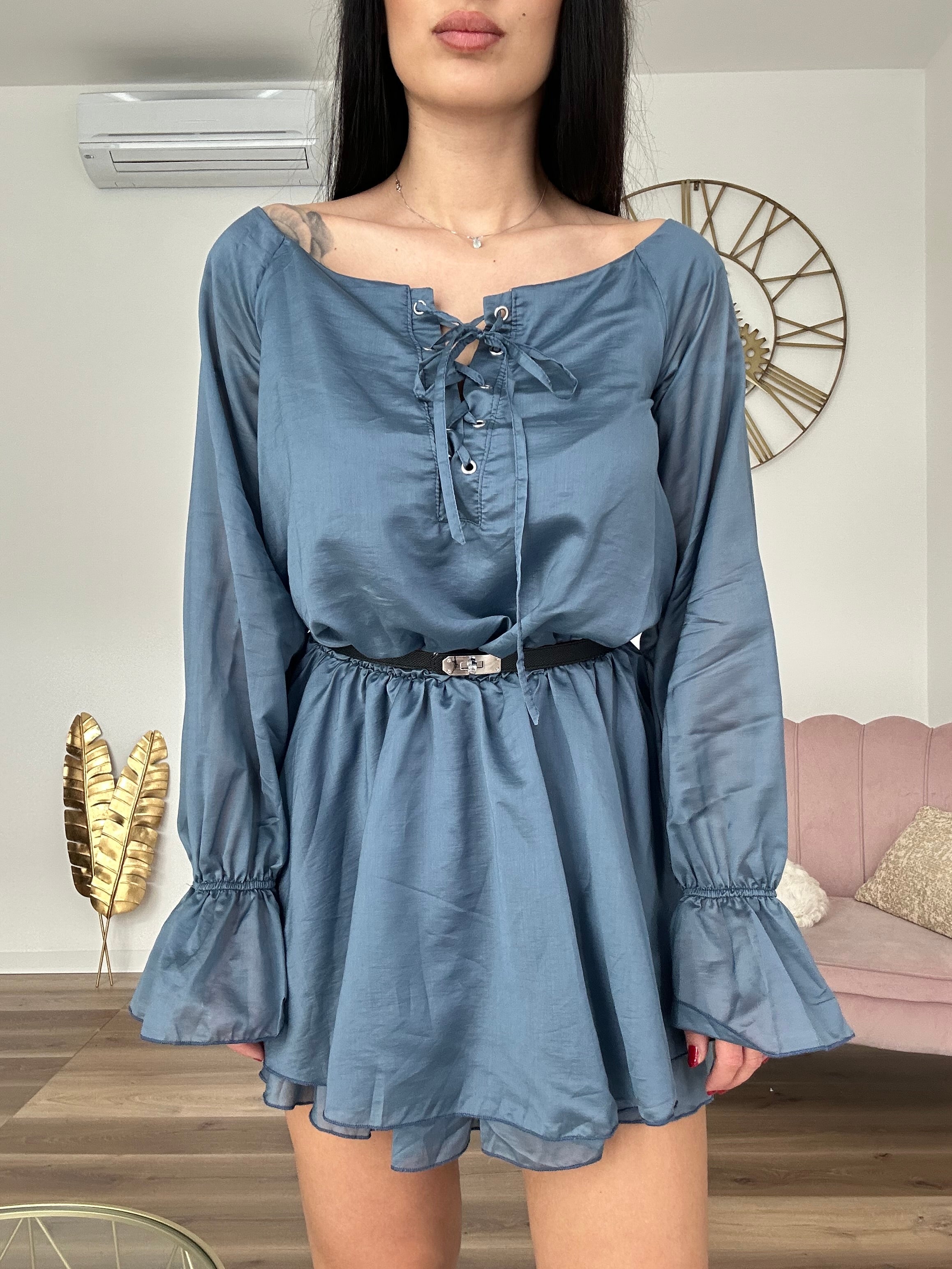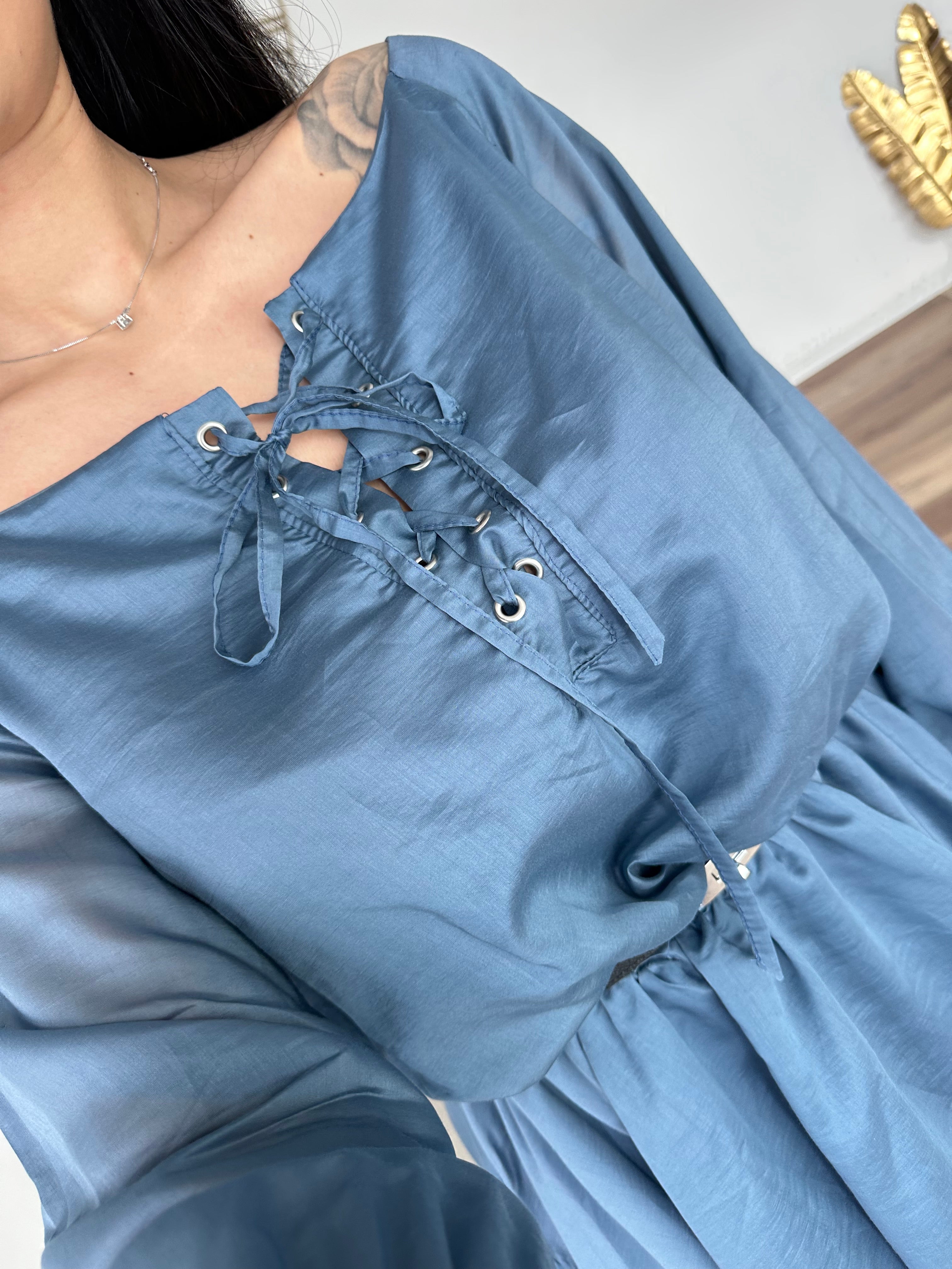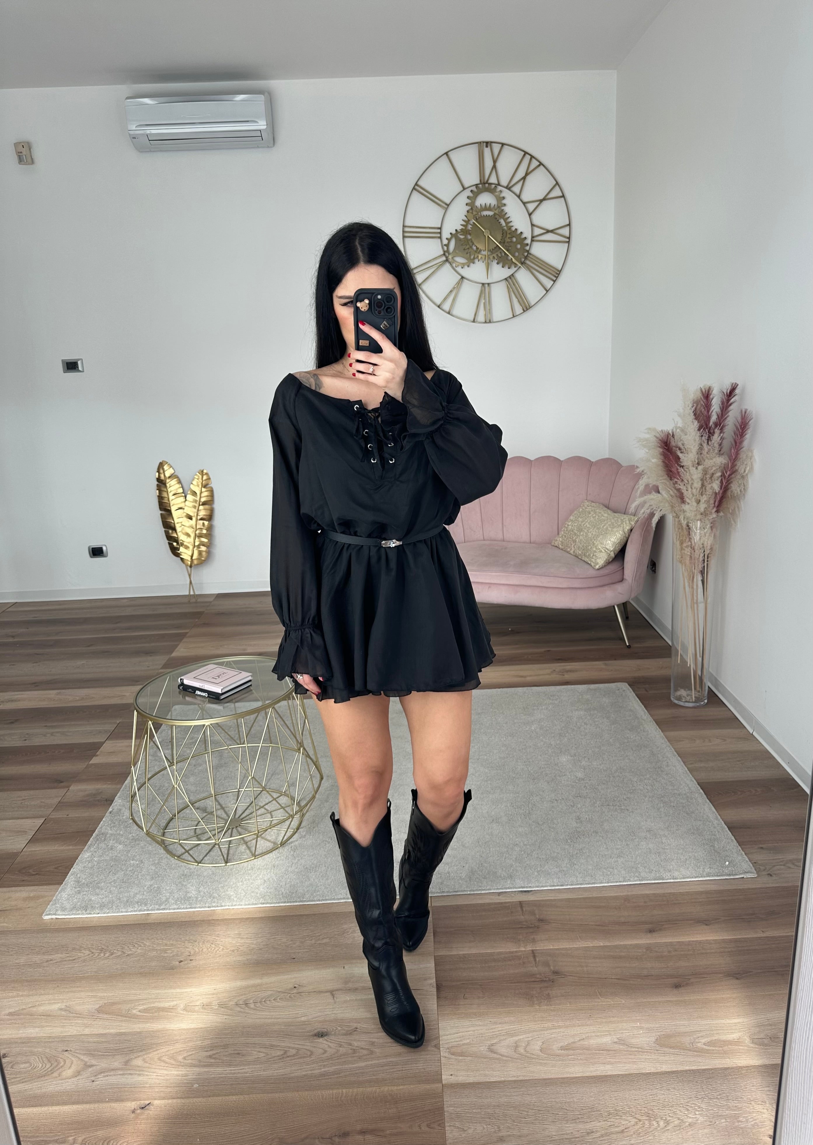 Abito con vita elastica, chiusura sul davanti, scollo elasticizzato.