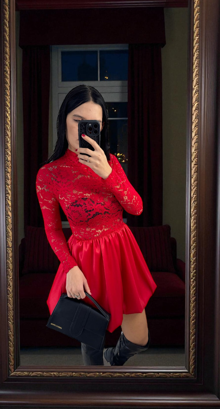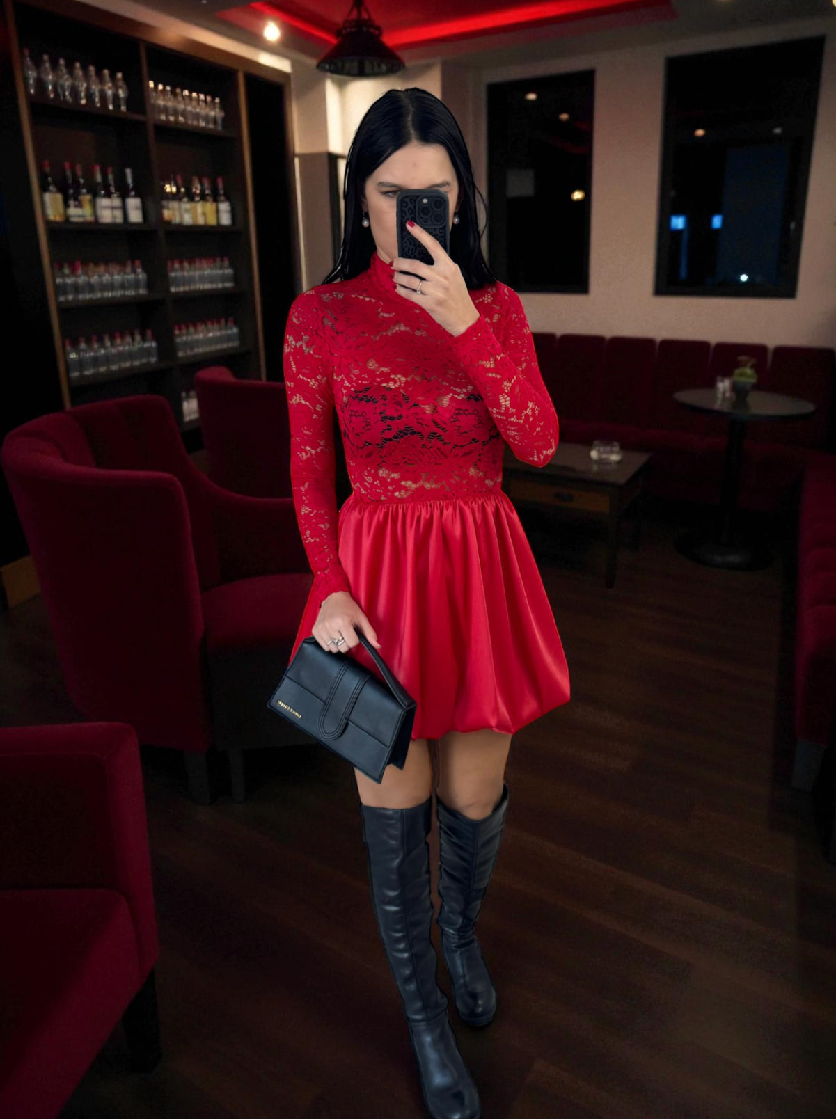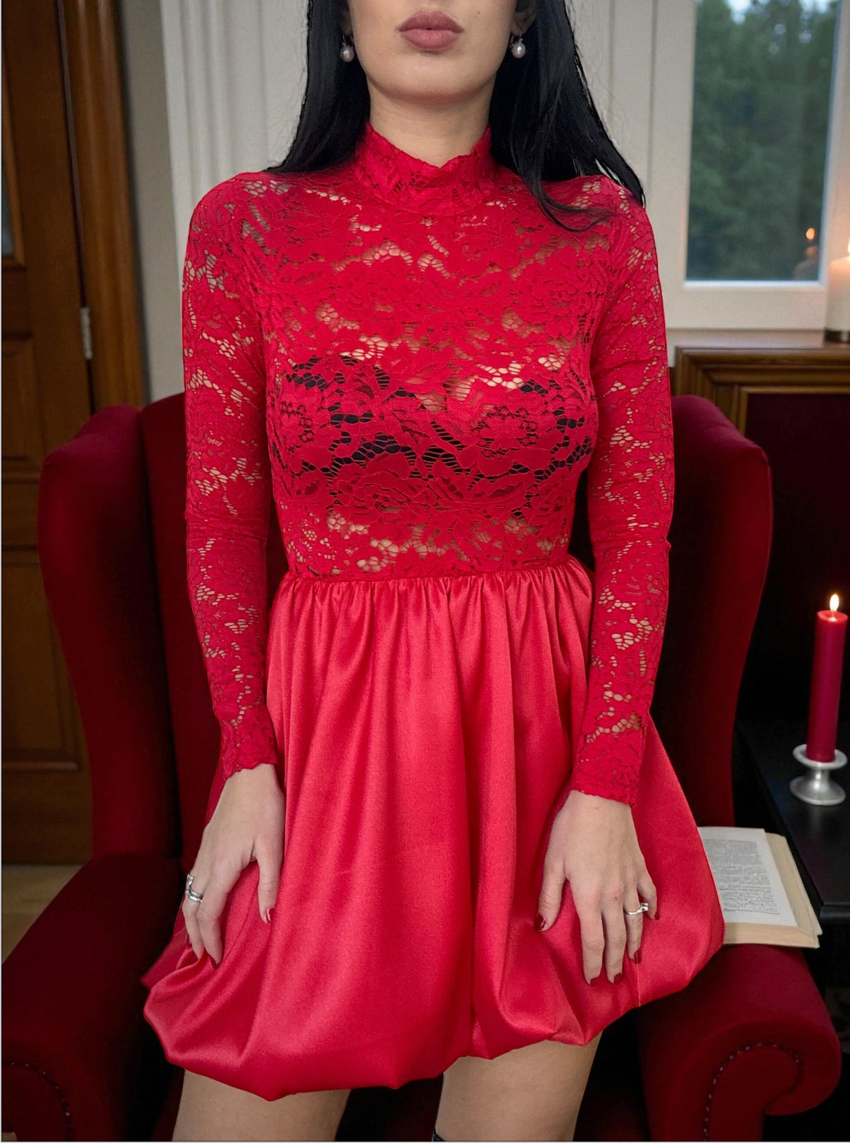 Abito con parte superiore in pizzo, gonna palloncino in satin.