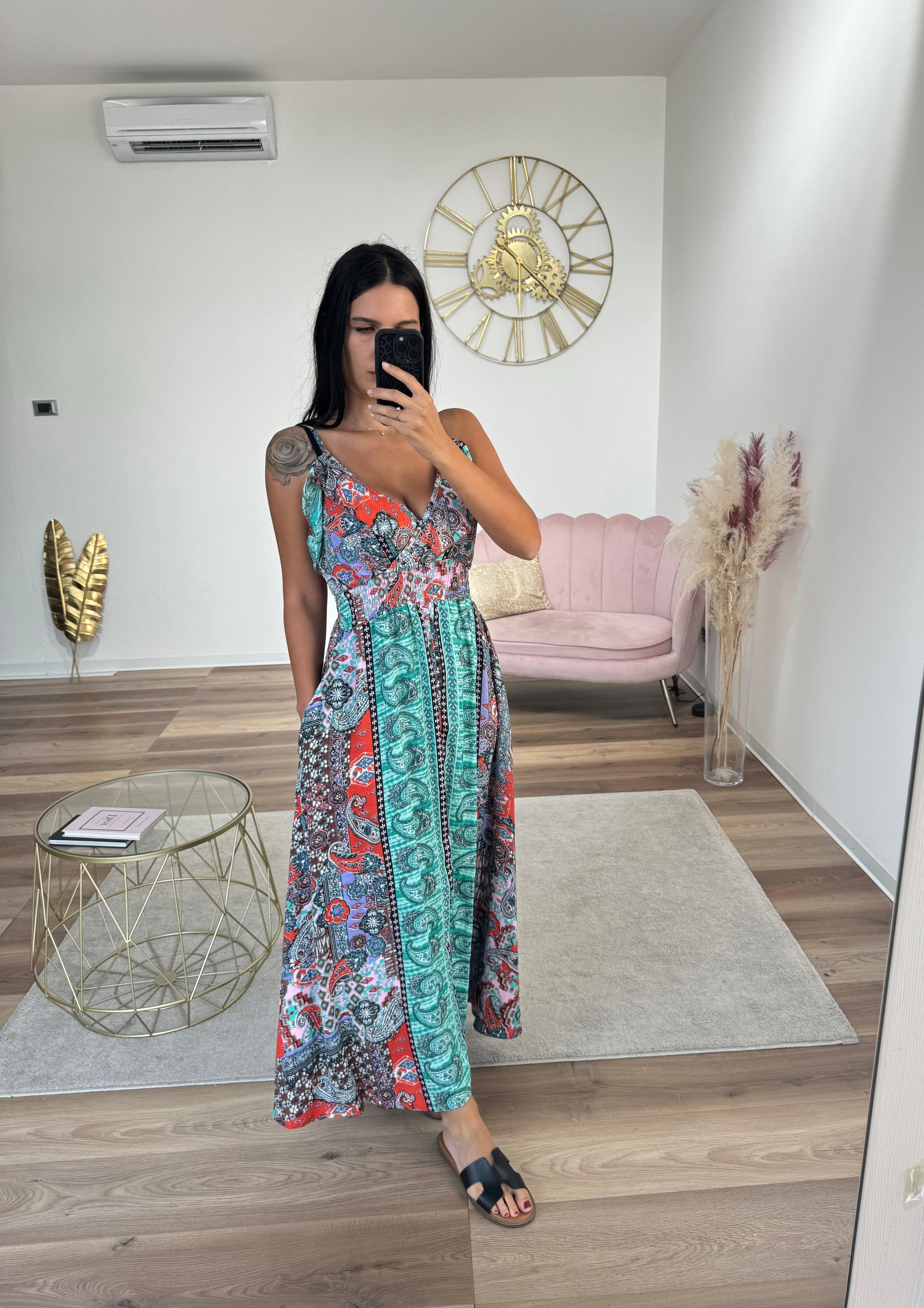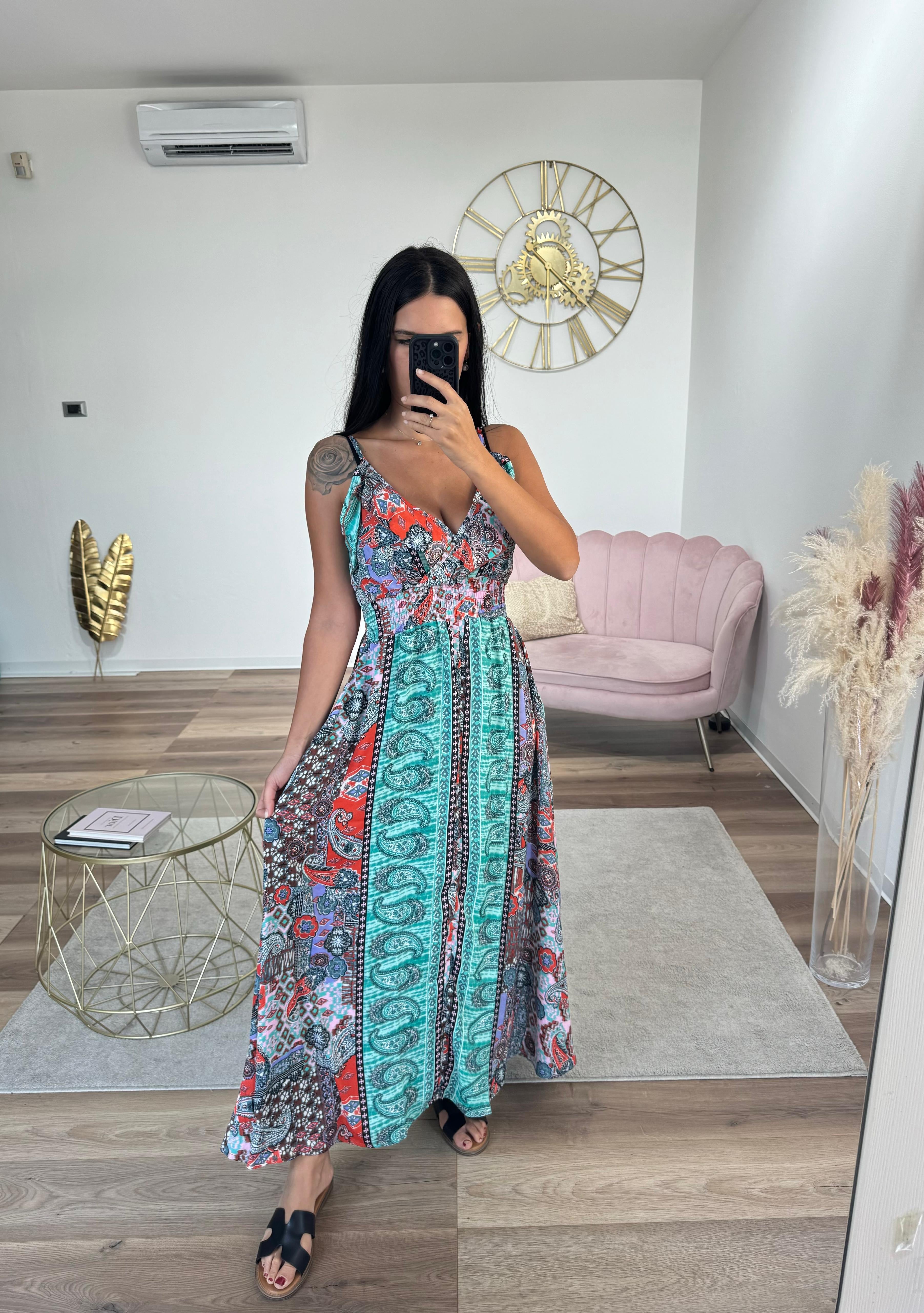 Abito in simil seta, bretelle regolabili, punto vita arricciato ed elastico